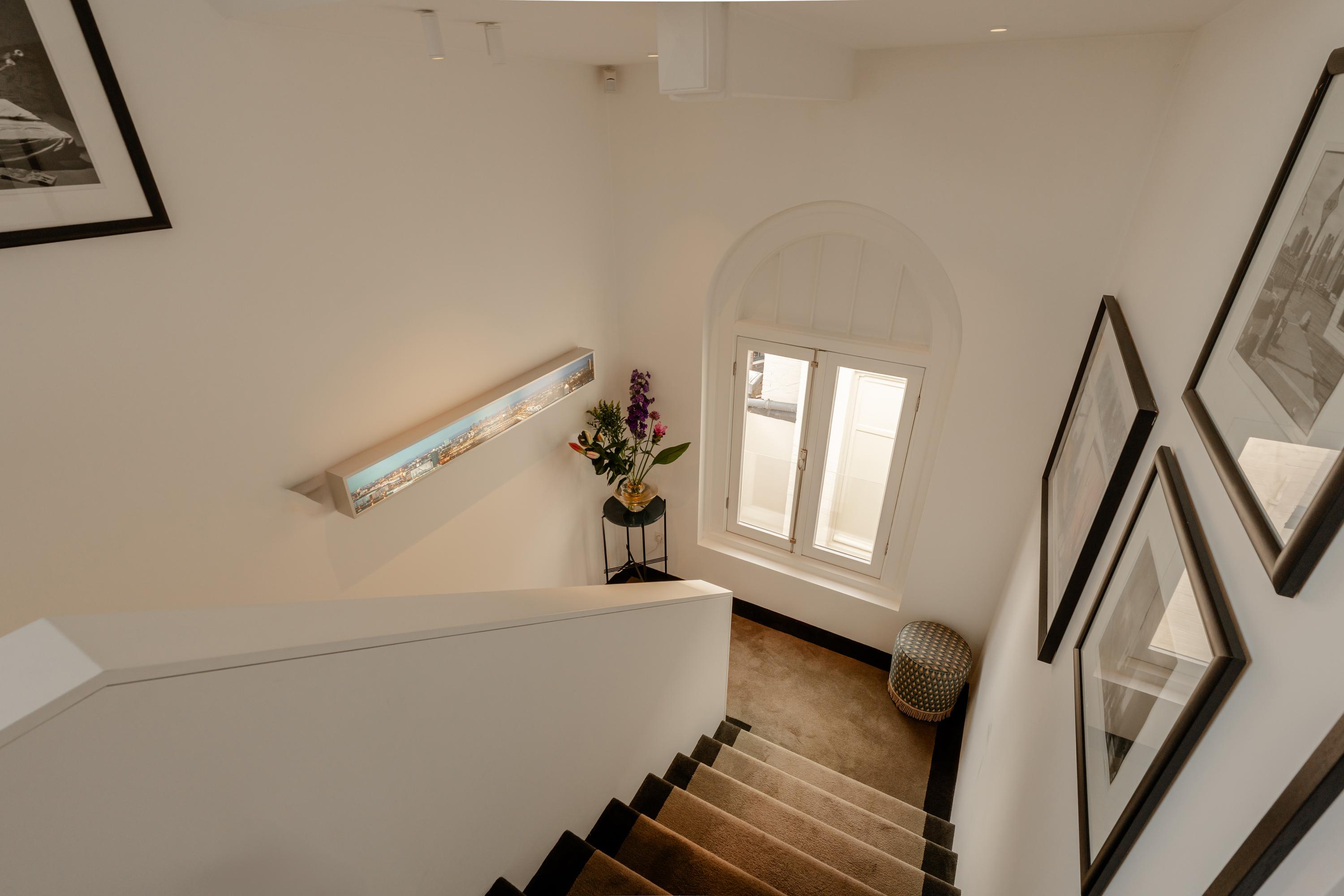 An internal staircase leads to the living level on the fourth and top floor, where you are immediately welcomed into the impressive open-plan kitchen. The sleek kitchen features a bar area, ideal for dining or working. Custom-made, handleless, floor-to-ceiling cabinetry creates a luxurious and minimalist look. Throughout the apartment, high-quality bespoke built-in wardrobes eliminate the need for freestanding furniture and maximize space efficiency.