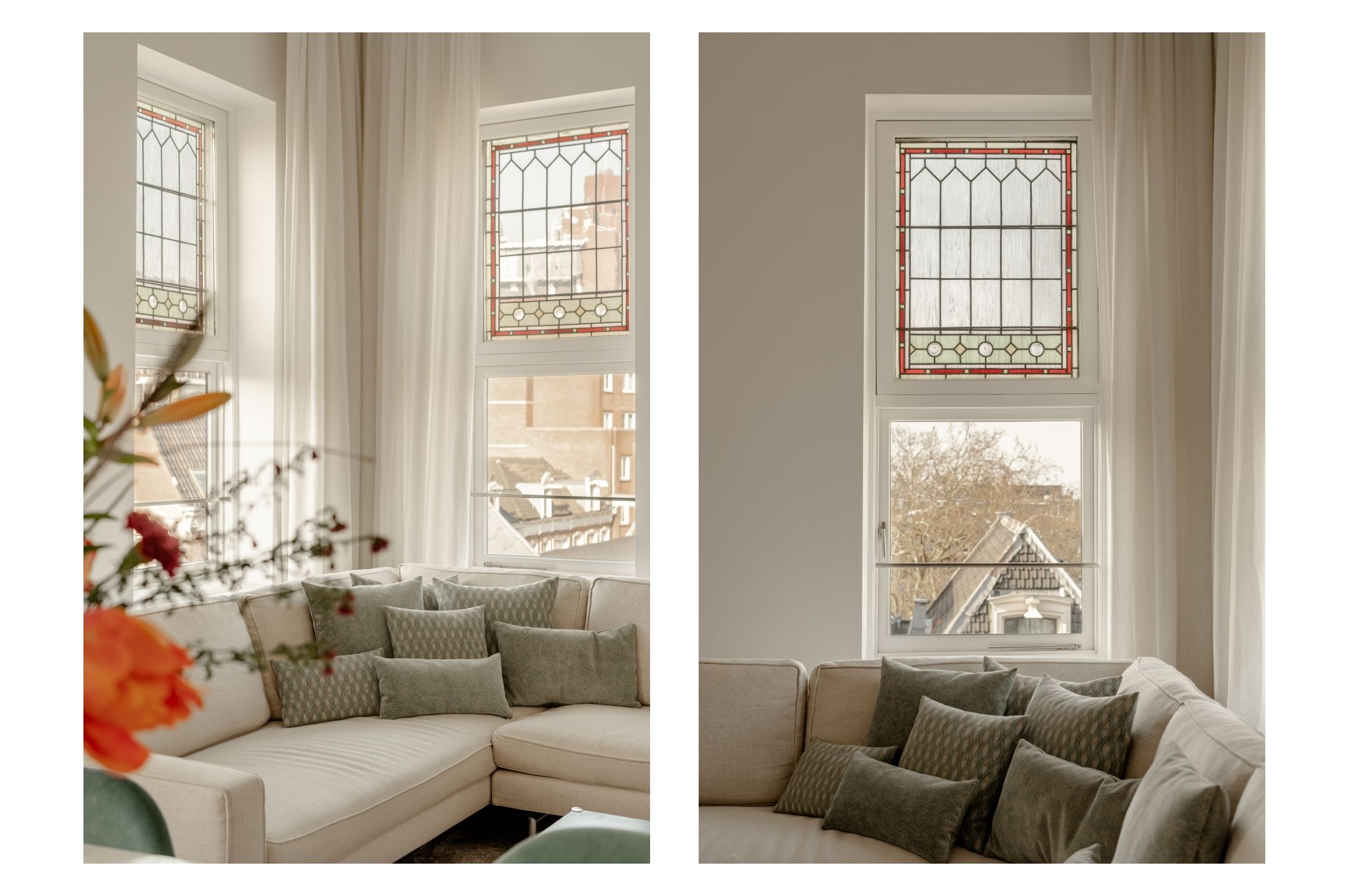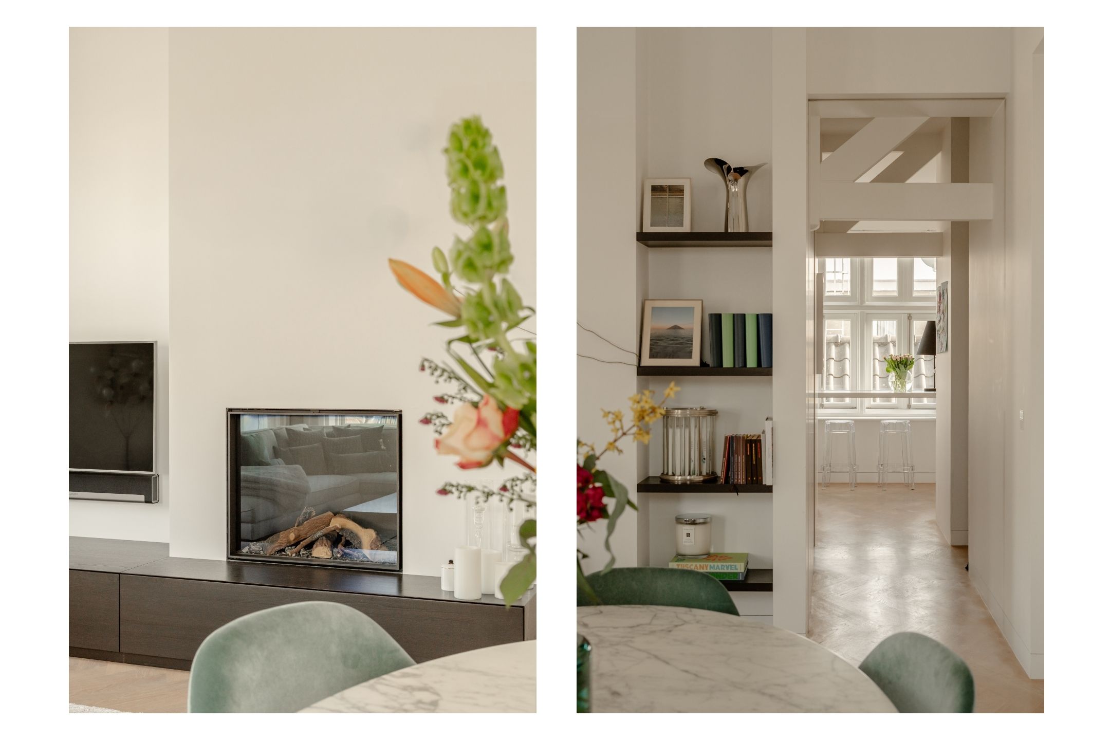 The hallway leads to the living room, positioned on the corner of the apartment. With its large windows and high ceilings, it offers a bright and spacious atmosphere and panoramic city views. The windows feature charming stained-glass details, enhancing the character of the home. The living area also includes a custom-built TV unit and a gas fireplace, creating a warm and elegant ambiance.