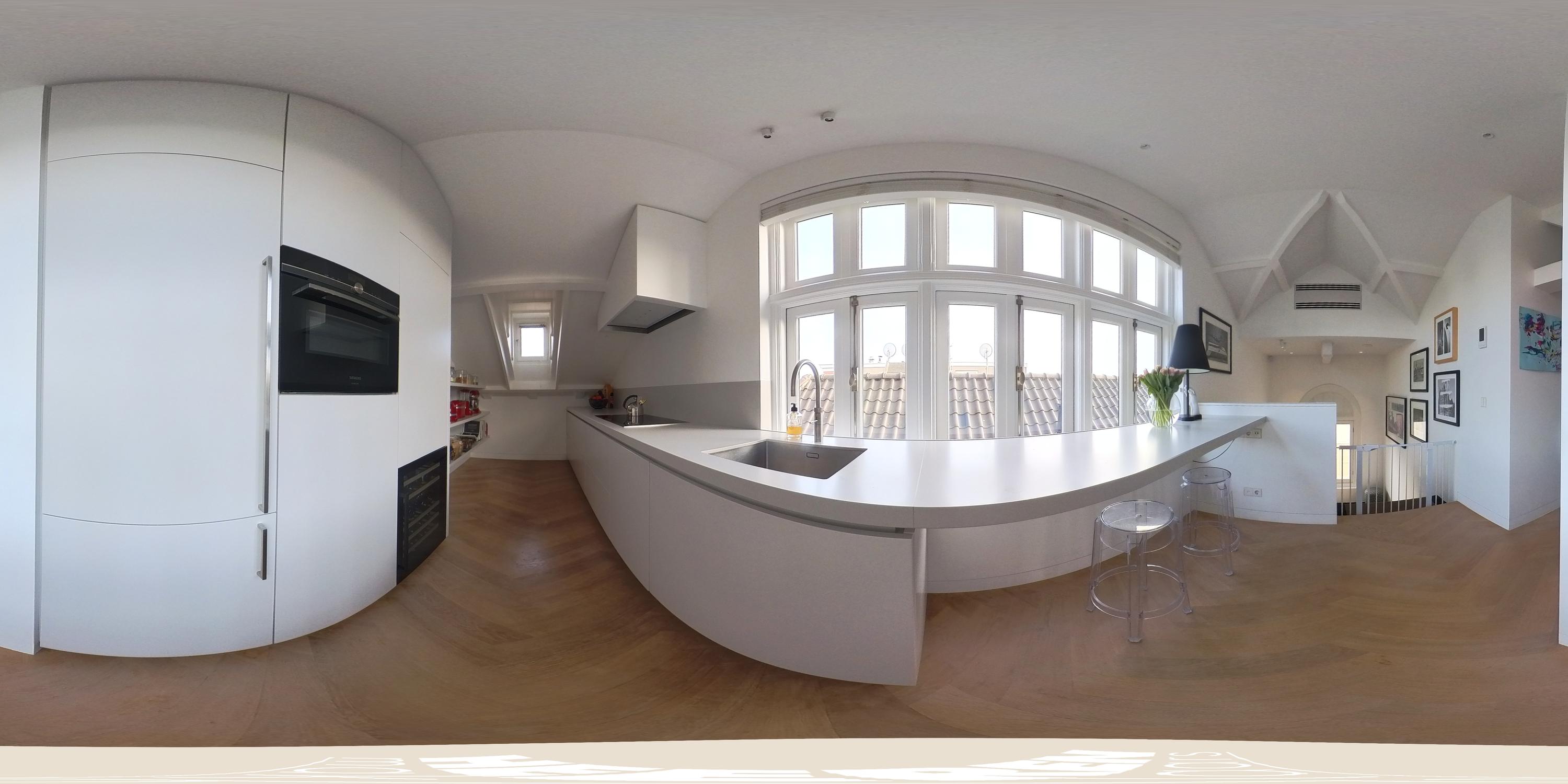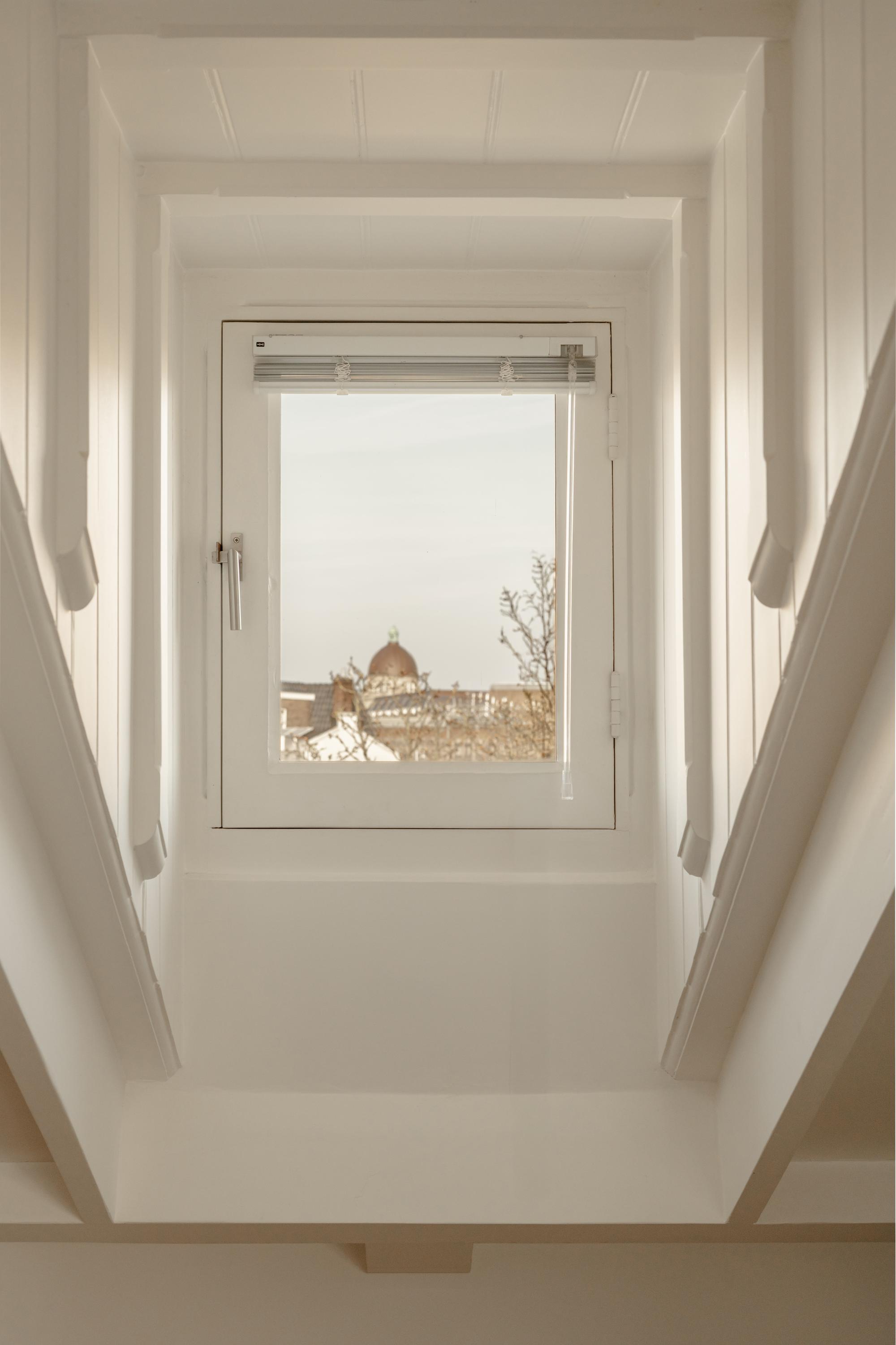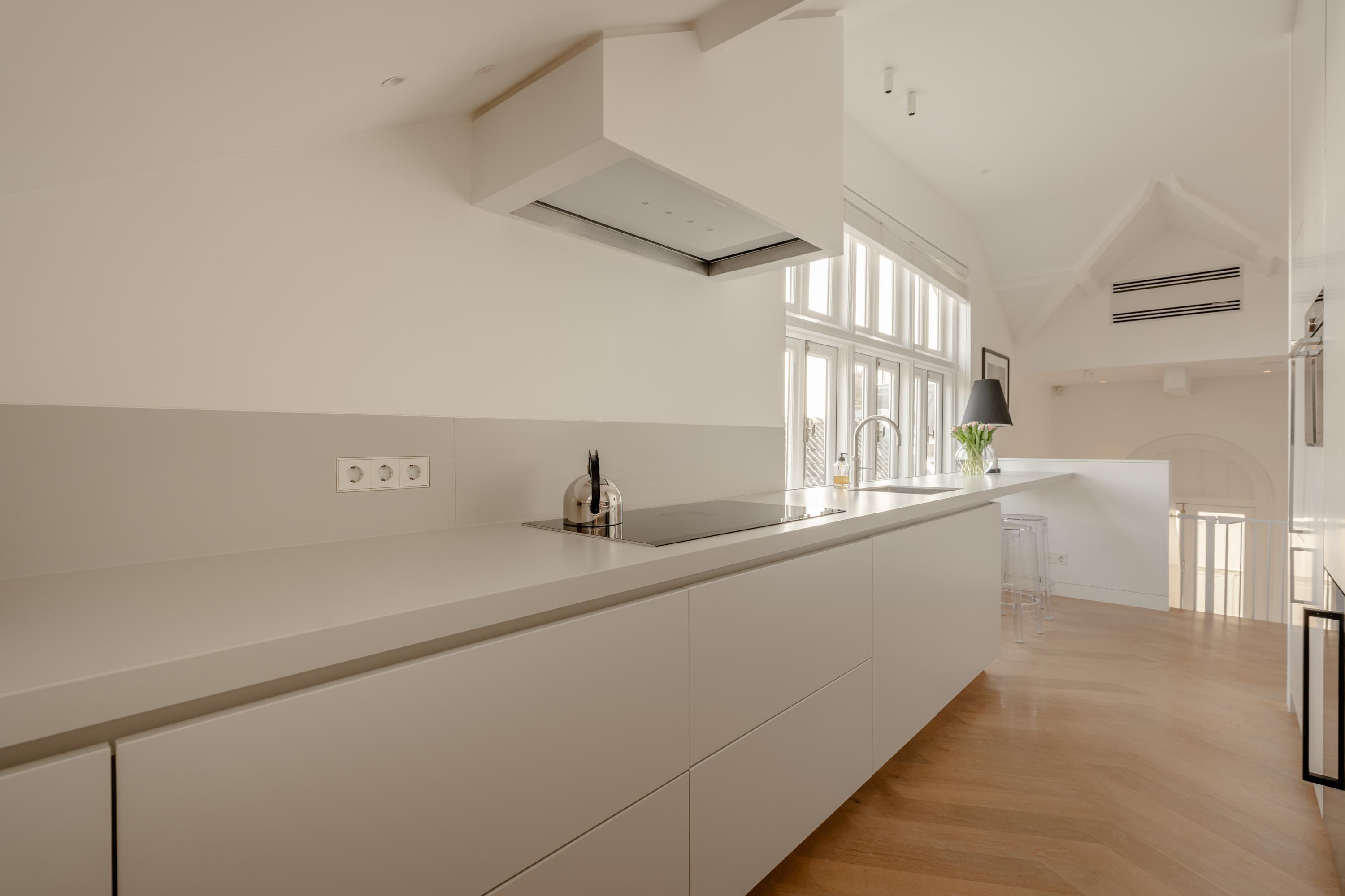 Thanks to the large windows, the space is filled with natural light and offers beautiful views over the characteristic rooftops of Oud-West, creating an open and serene living experience. The kitchen is equipped with high-end Siemens built-in appliances, an induction hob, Quooker tap, and a wine climate cabinet. Integrated air conditioning completes the comfort.