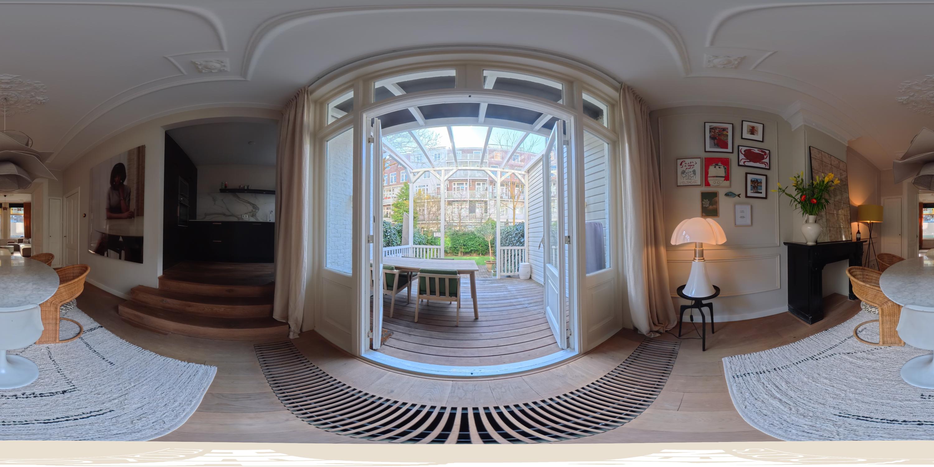 Through the dining room, French doors lead to the exceptionally large and, for this location, unique backyard. The garden faces southeast and therefore enjoys plenty of sunlight. Directly adjacent to the house is a covered terrace, ideal for long summer evenings and outdoor dining. The backyard, approximately 50 m² in size, offers ample possibilities for further design and use.