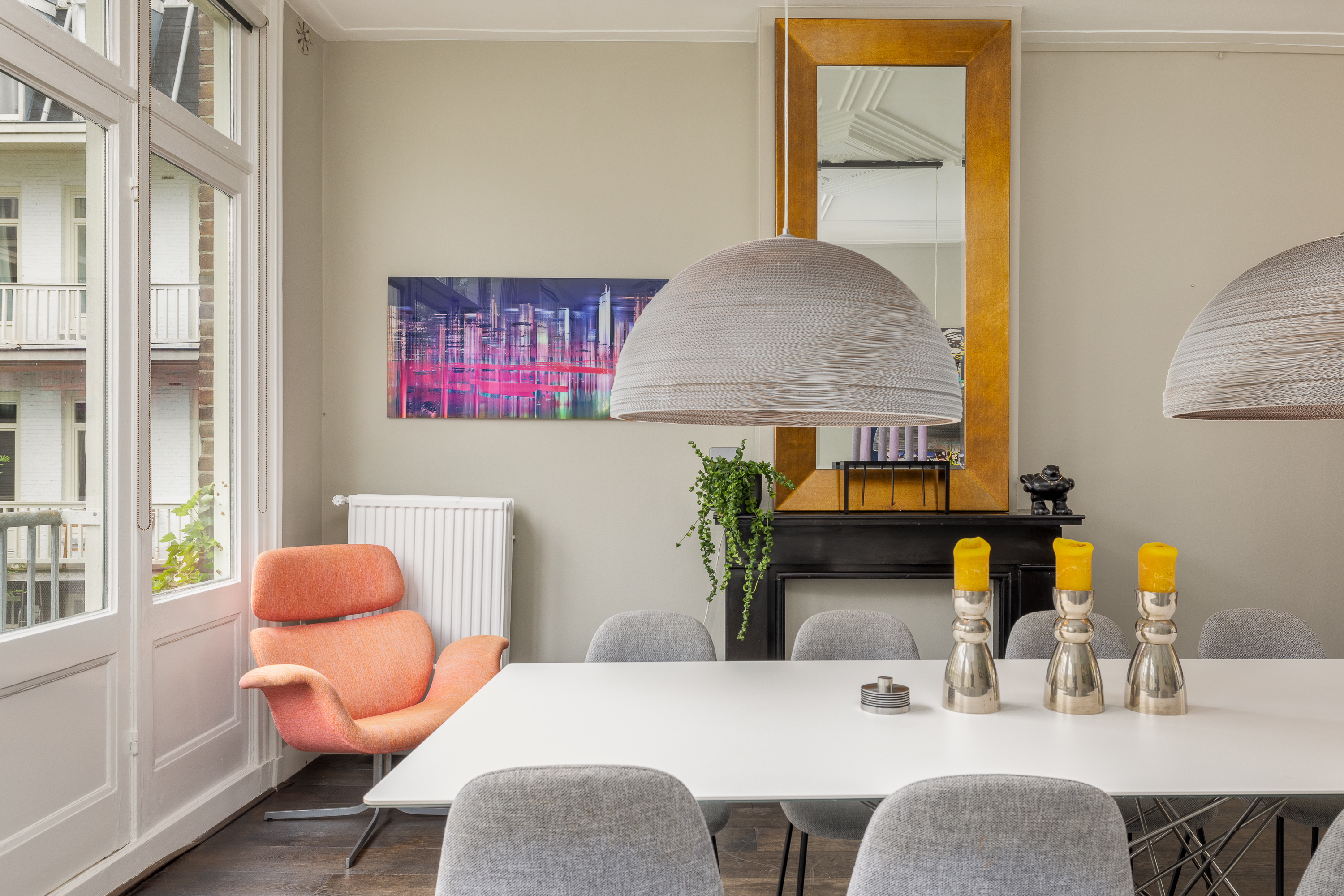 On the landing, you will find a separate toilet with a sink. From the landing, you have access to the spacious through-living room. At the front of the living room, there is enough space for both a formal sitting area and a cozy TV corner. There is also a beautiful balcony with a view of Valeriusstraat and Amstelveenseweg. At the rear of the house is the dining area, open kitchen with island, and a French balcony. The kitchen is equipped with a 5-burner gas stove, oven, microwave, and a fridge/freezer combination. Due to the abundance of glass and the ceiling height of 3.07 meters, this floor is particularly light and spacious.