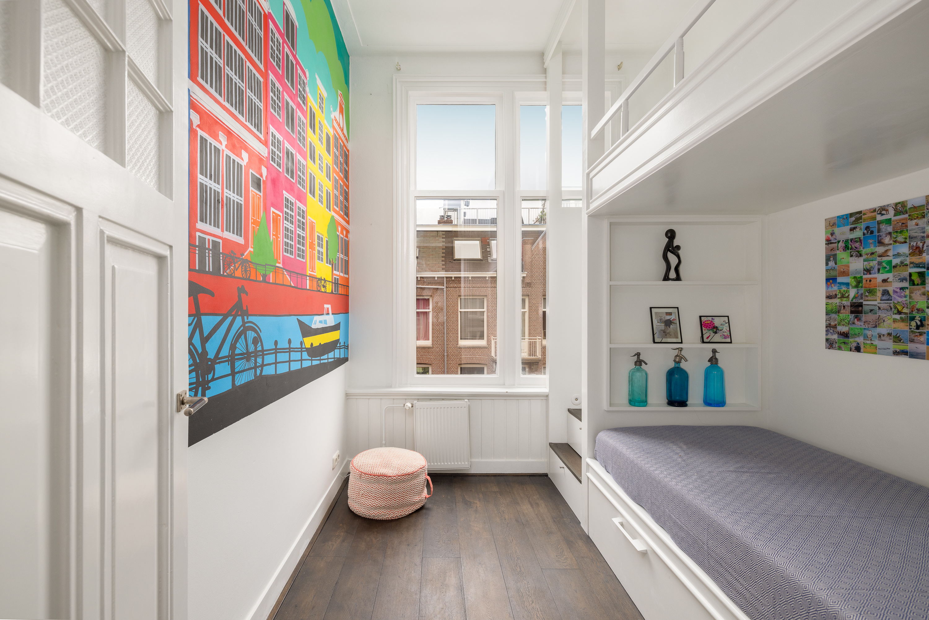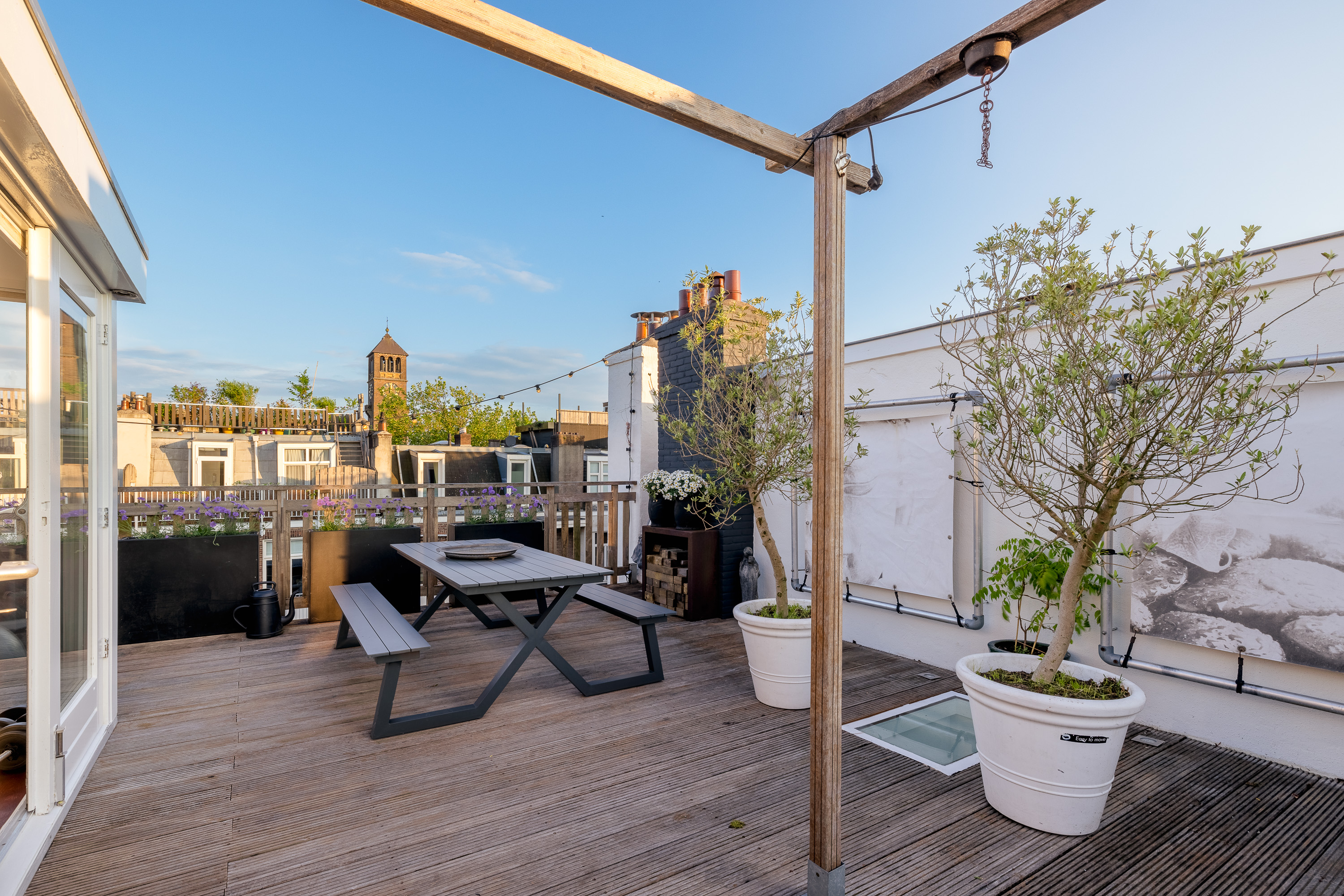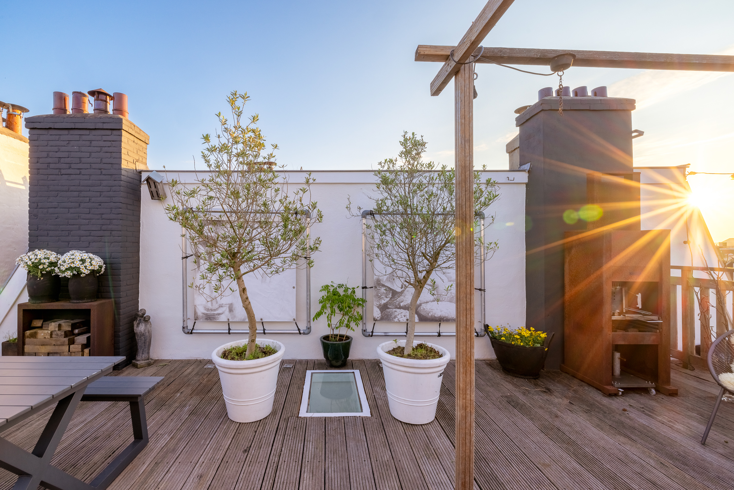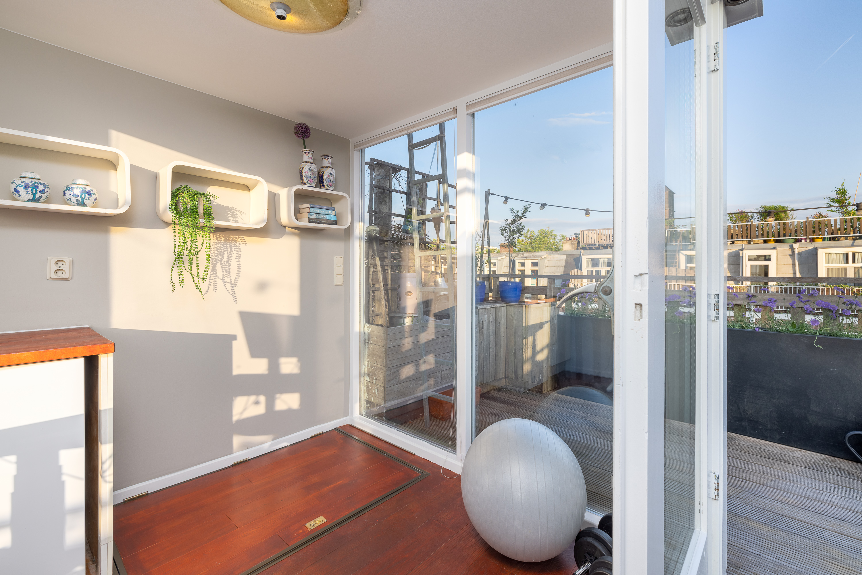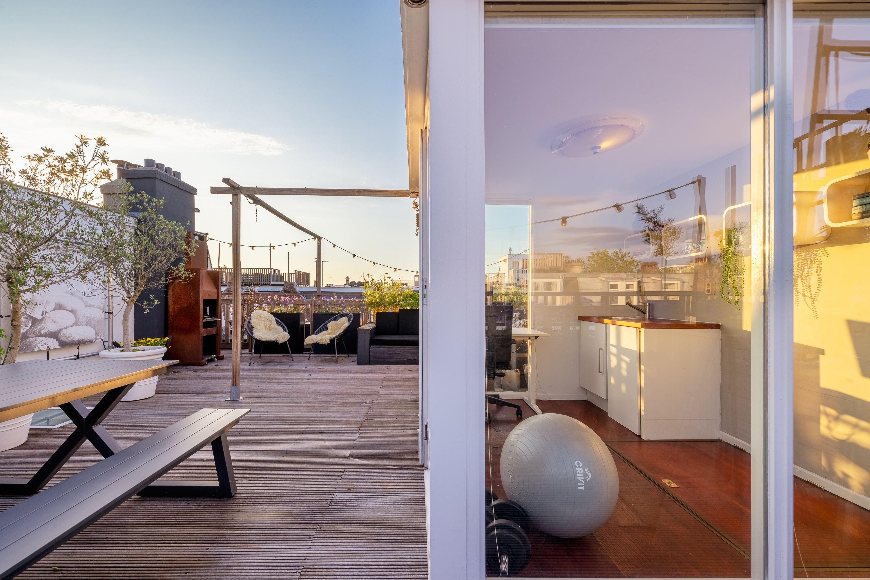 At a fantastic location in the popular Amsterdam Oud-Zuid, we offer this wonderfully bright and spacious double upper house. The beautiful roof terrace provides plenty of privacy, and you can enjoy the sun all day long. Multiple seating areas can be created. The house has three bedrooms, a spacious walk-in closet, and a roof terrace structure that can also be set up as a home office or yoga space. At the front of the house, there is also a lovely balcony.