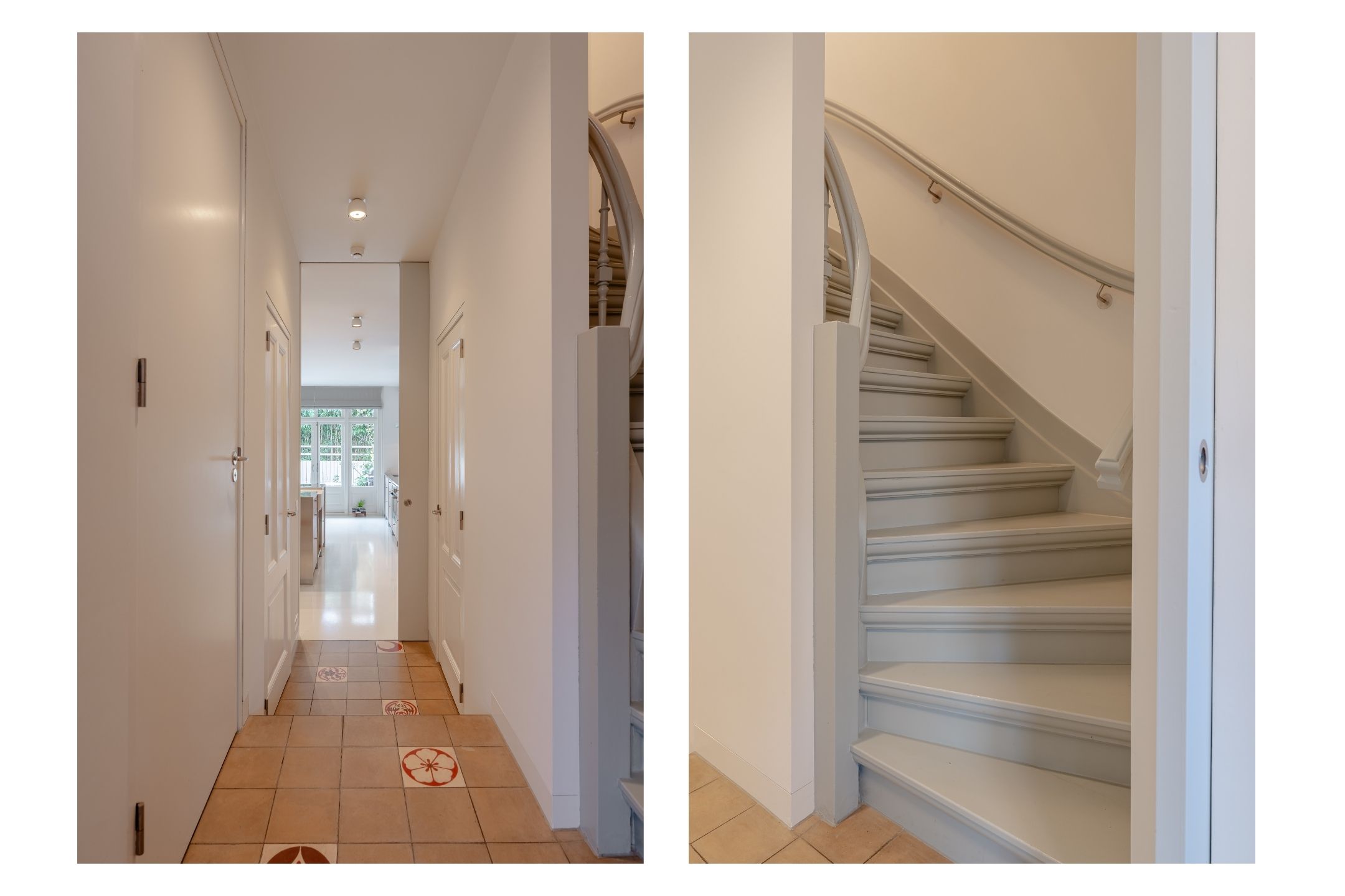 At the heart of the space is a large kitchen island with an inviting bar setup. Adjacent to the kitchen is a practical pantry, suitable for storing appliances and provisions. French doors provide access to the covered terrace and the sunny south-facing garden. The garden forms a natural extension of the kitchen, allowing you to enjoy a spacious and atmospheric living area during the summer months. Additionally, built-in cupboards and a separate toilet are present. The modern finish of the kitchen contrasts beautifully with the more classical elements found on the other floors.