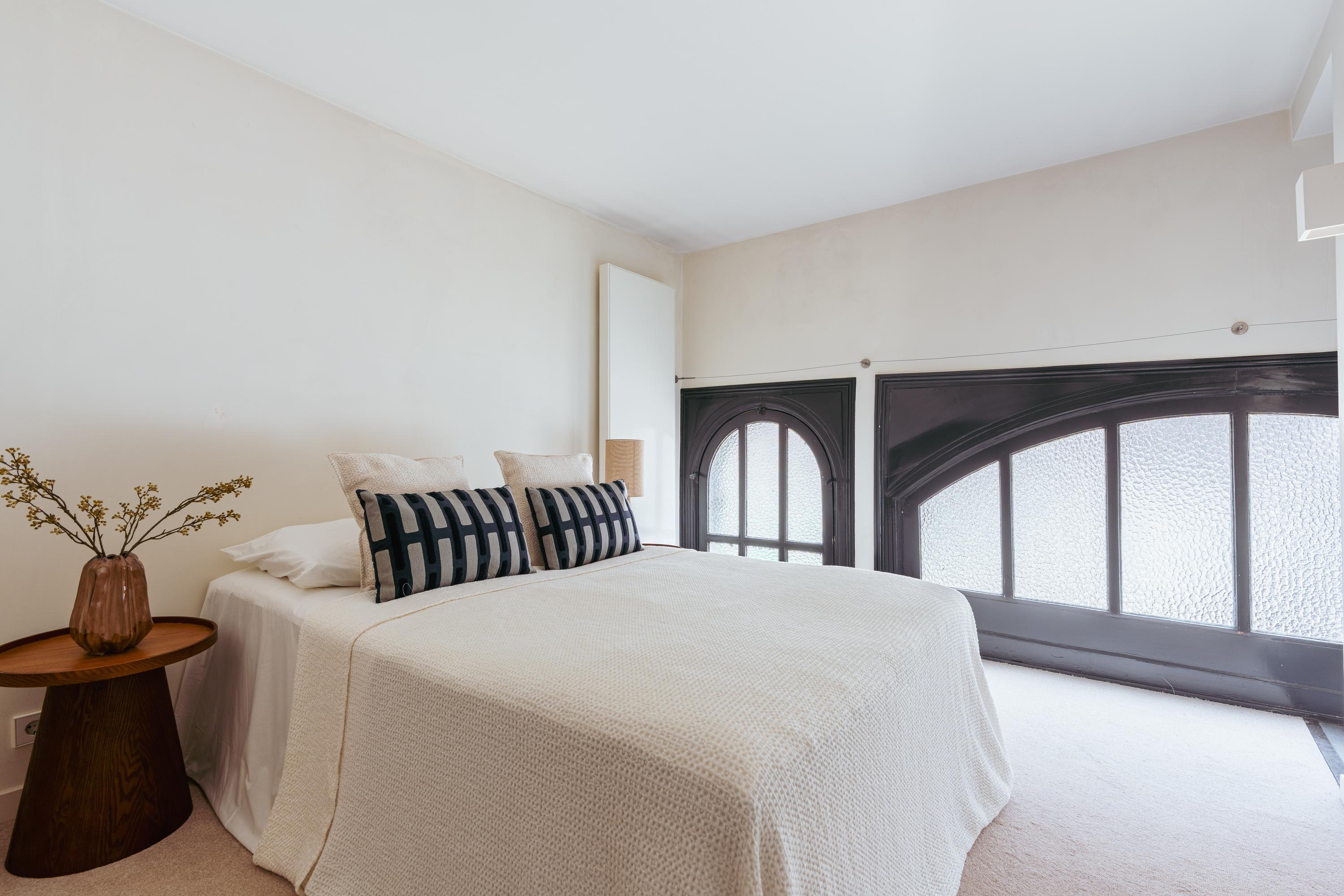 The apartment can be accessed via both the first and second floors. On the second floor, you’ll find the generous through-living room, which benefits from large windows on both sides, filling the space with natural light. There is ample room for a comfortable seating area as well as a spacious dining area with a large dining table. The elegant fireplace adds a charming focal point to the room.