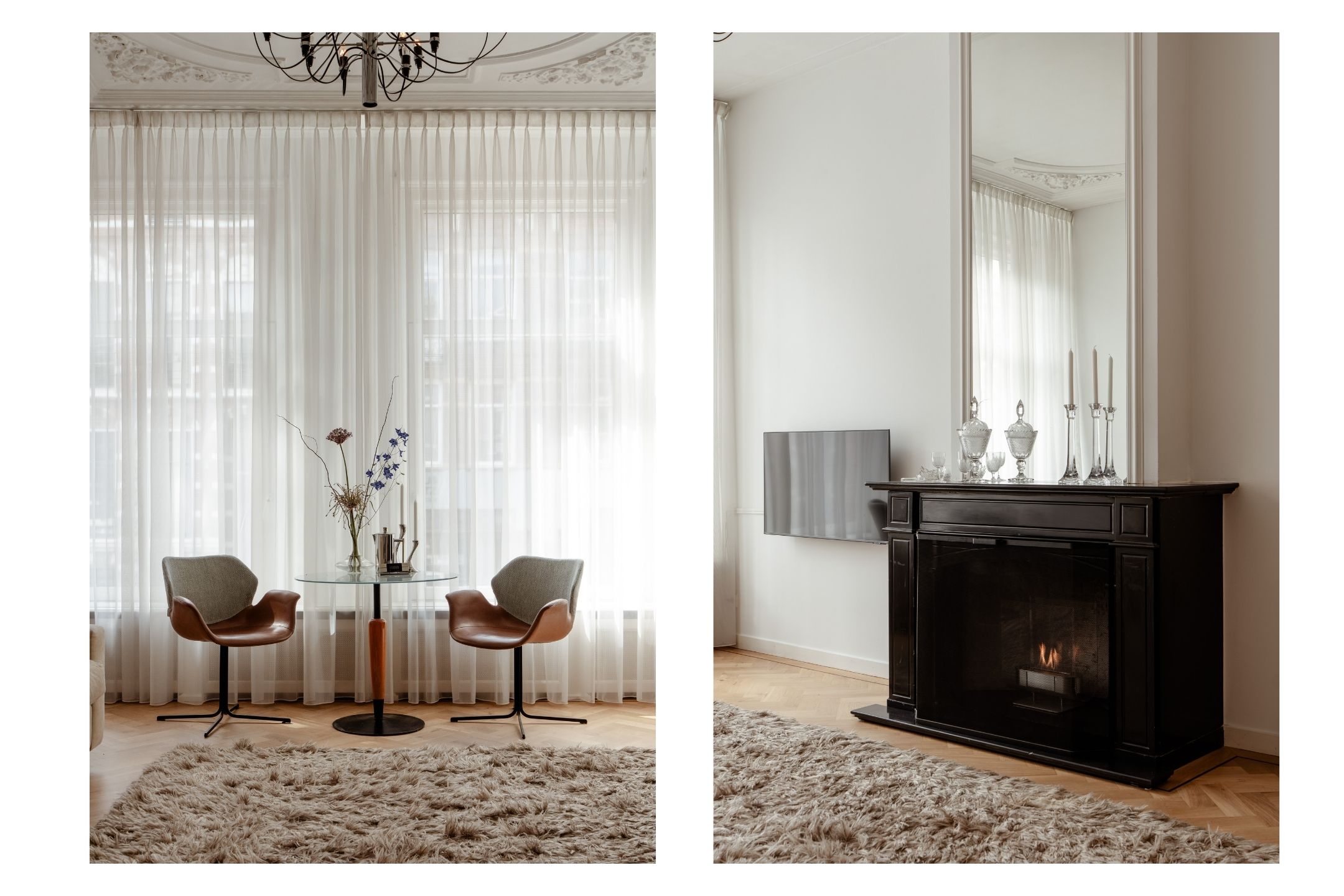Aan de voorzijde van de woning bevindt zich de royale woonkamer met sfeervolle (open) haard en grote raampartijen, waardoor de ruimte baadt in natuurlijk licht. De woonkamer wordt extra gekenmerkt door prachtige authentieke details, waaronder rijk gedecoreerde plafondornamenten en originele schuifdeuren, die de ruimte een elegante en karaktervolle uitstraling geven. Dankzij de riante afmetingen is dit een ideale plek voor een comfortabele zithoek en een royale leefruimte.