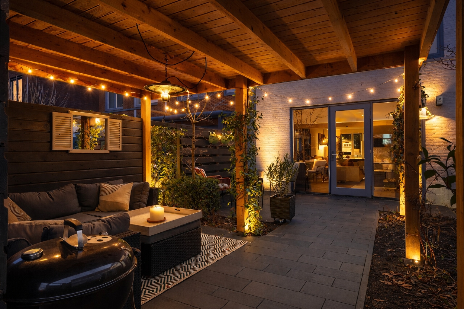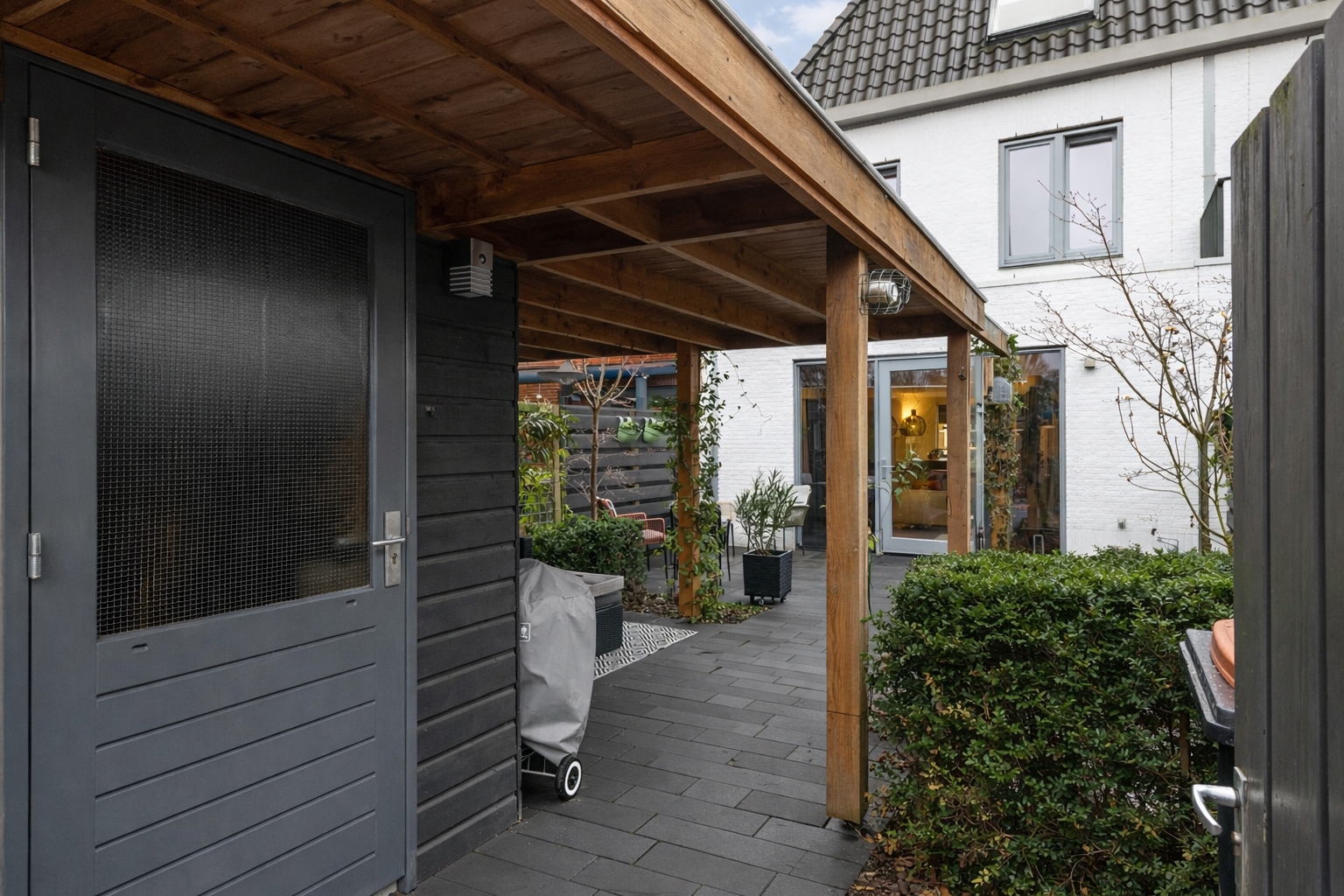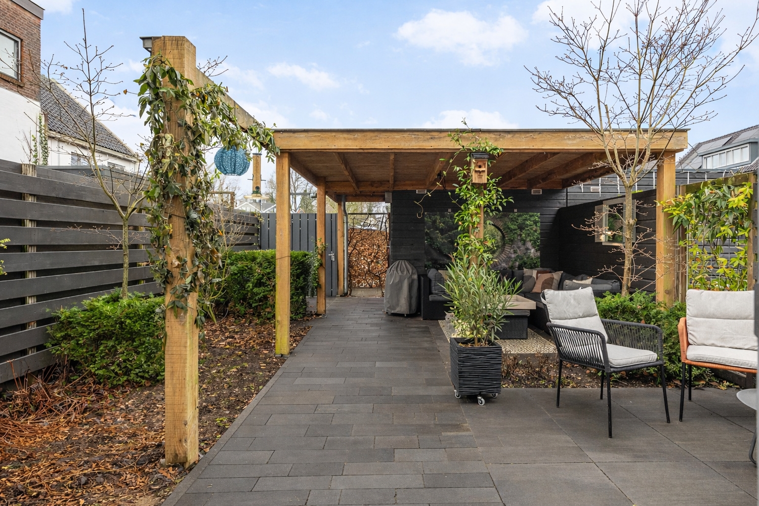 De achtertuin is onder architectuur aangelegd en sluit naadloos aan op de woonruimte. Direct achter de woning ligt een ruim terras, terwijl verderop in de tuin de veranda met luxe pergola een beschutte plek biedt om in alle rust van het buitenleven te genieten. De groene beplanting en verzorgde afwerking zorgen voor privacy en een prettige sfeer, terwijl de achterpoort directe toegang geeft tot het groene binnenhof met de twee eigen parkeerplaatsen.