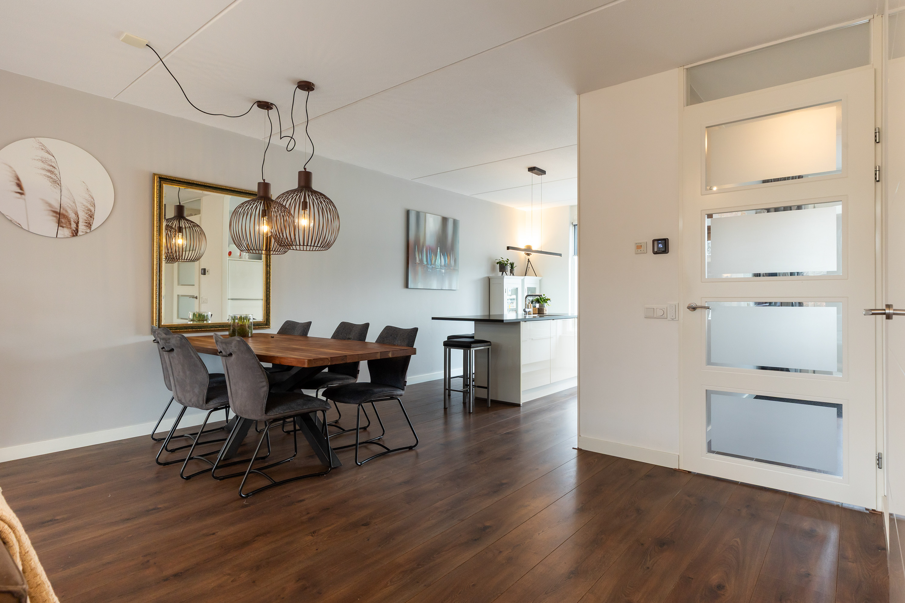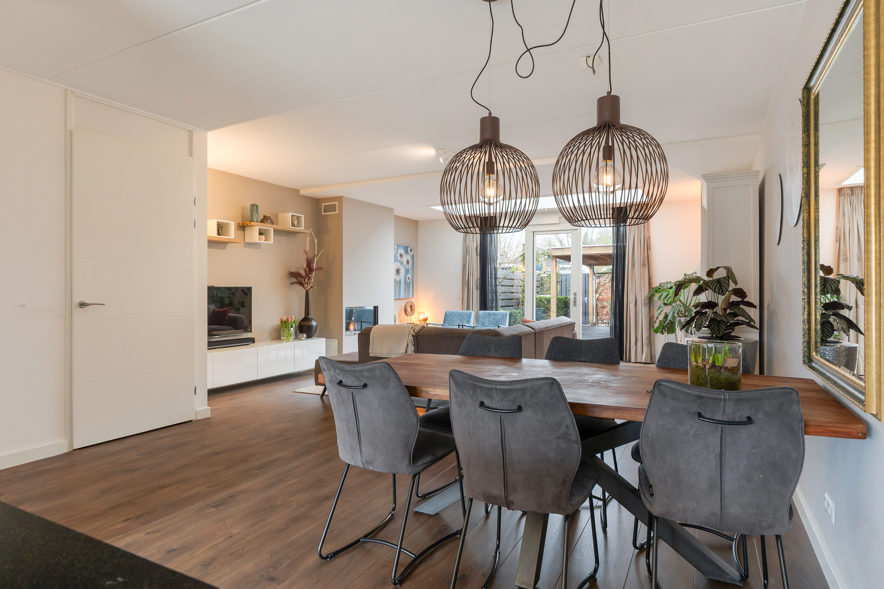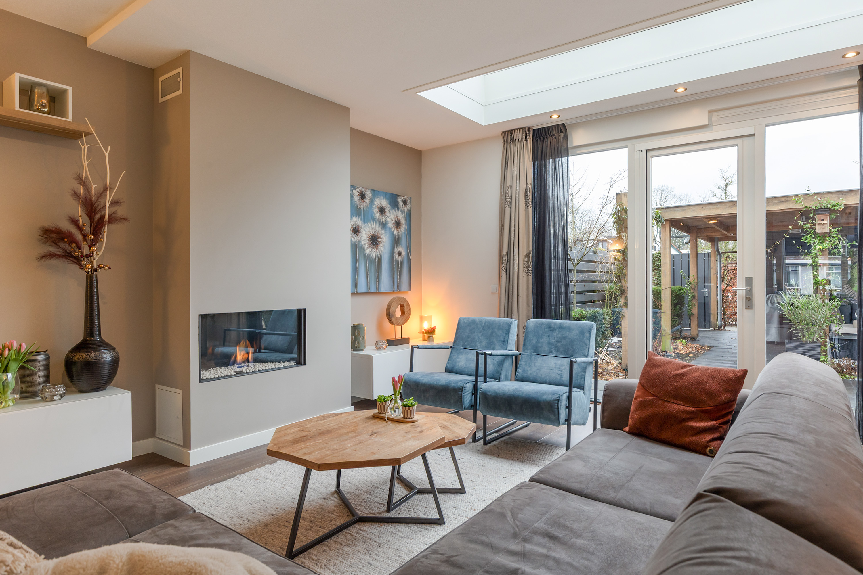 Binnen ervaart u direct de royale opzet en de moderne afwerking. De uitgebouwde living en de woonkeuken vormen samen een lichte, open leefruimte waarin het uitzicht en het daglicht een hoofdrol spelen. Grote raampartijen, deur naar de tuin en een luxe lichtstraat zorgen voor een constante verbinding tussen binnen en buiten. De gashaard in de woonkamer voegt warmte en sfeer toe en onderstreept het moderne, maar tegelijkertijd uitnodigende karakter van de woning.