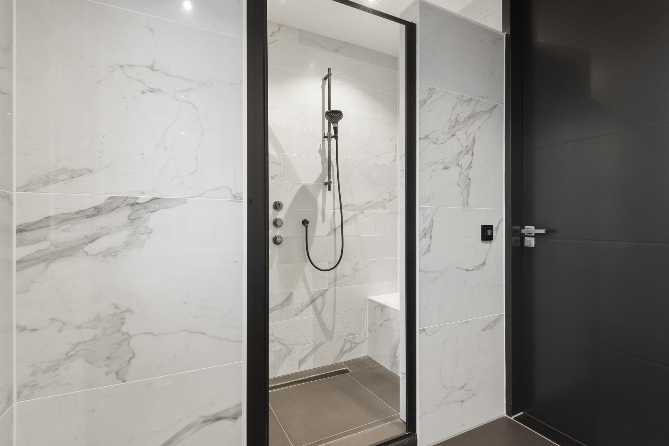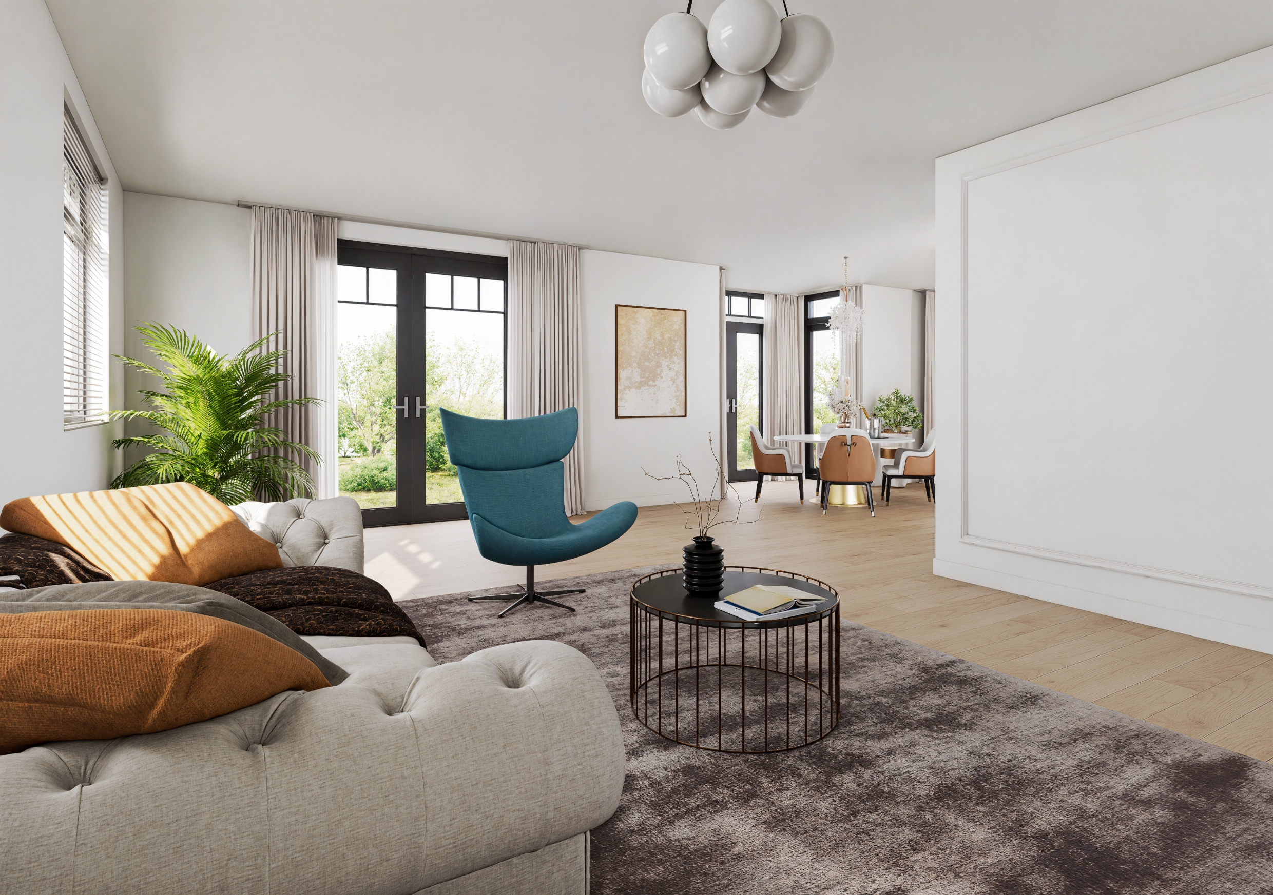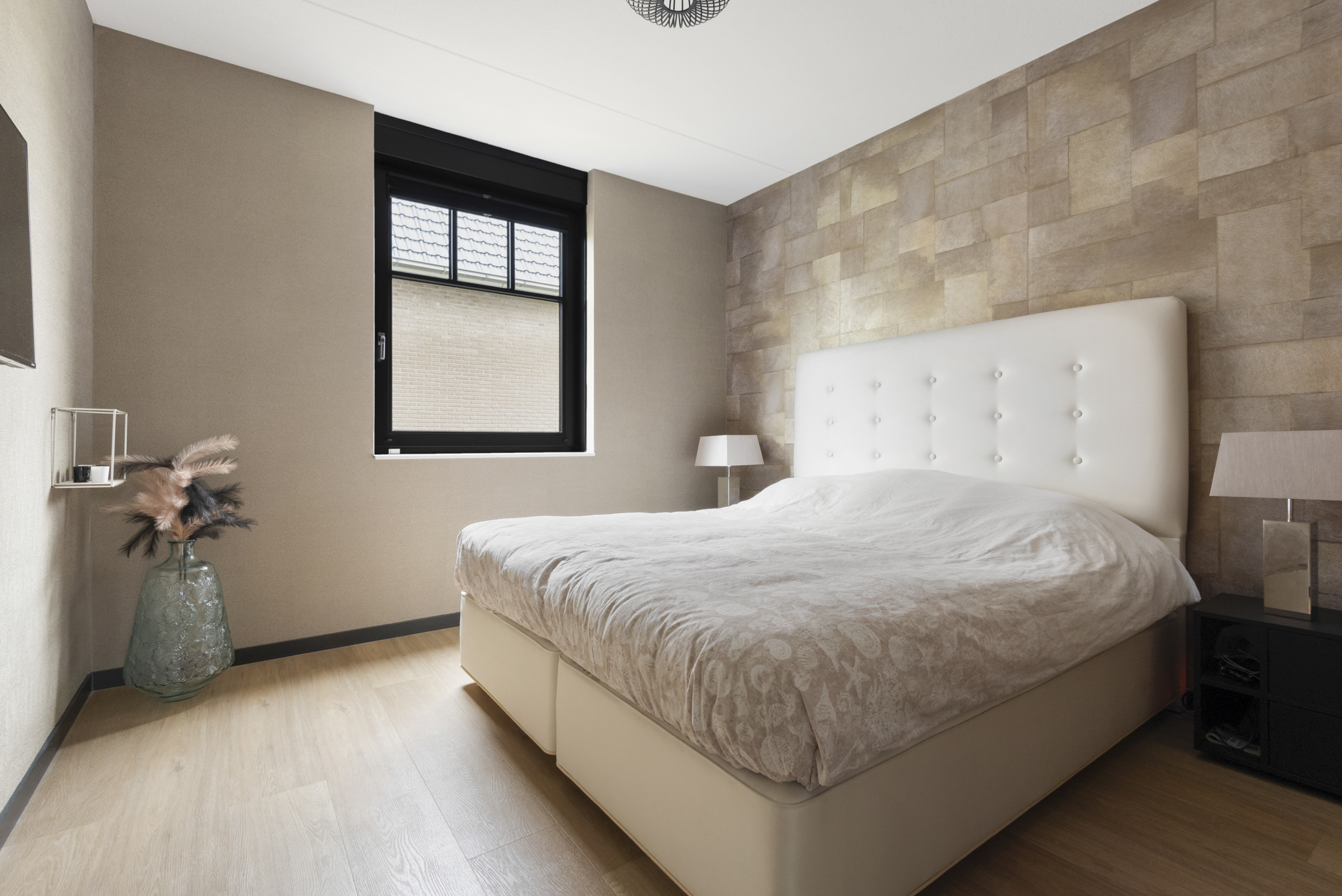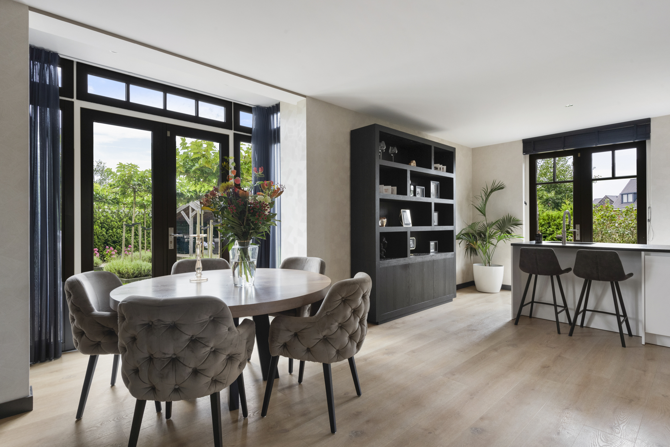 Upon entering, you are welcomed into a spacious hallway with a cloakroom area, a stylish staircase with leather-covered steps and a modern toilet. The ground floor features a sleek PVC floor with underfloor heating and cooling. From the hallway, you have a direct view of the large backyard, which immediately gives a sense of openness.