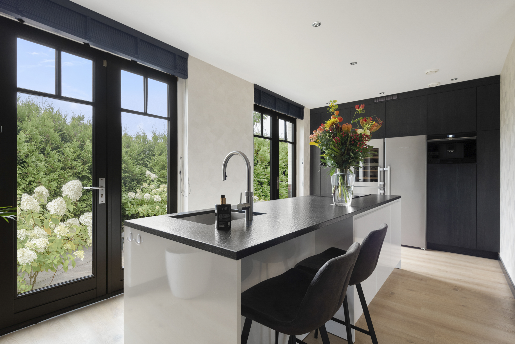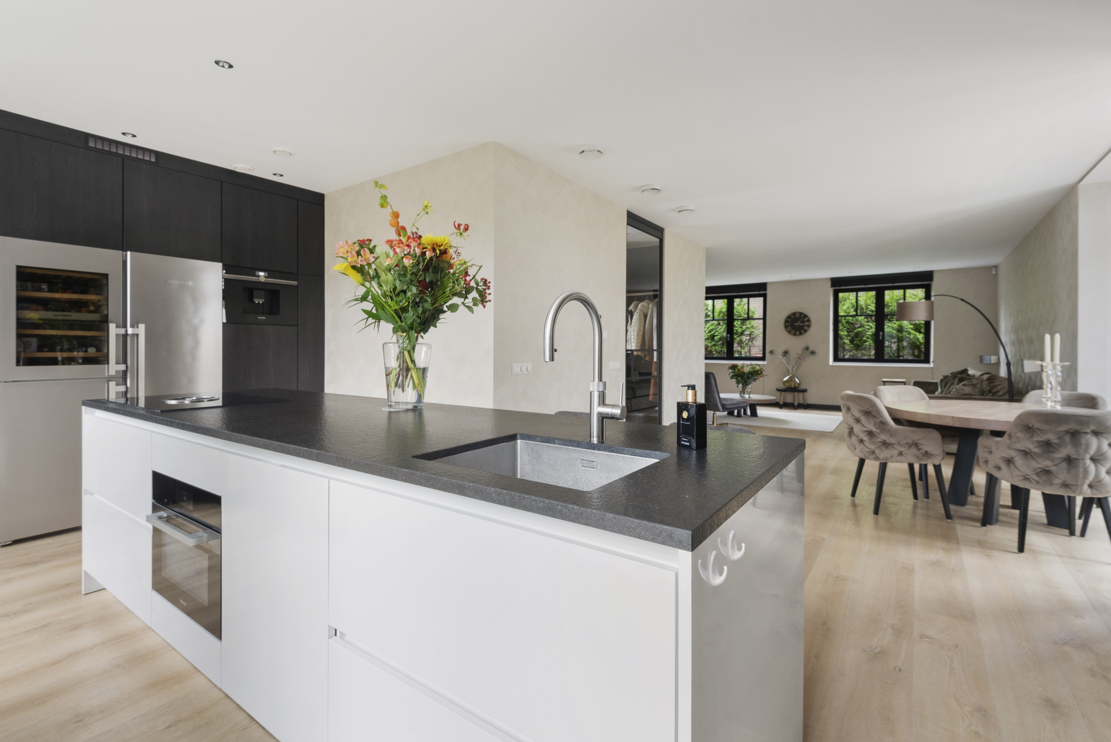 The luxurious kitchen with an island is equipped with high-quality built-in appliances, including a Miele steam oven, wine climate control, Siemens combination oven, built-in coffee machine, Bora induction cooktop with integrated extractor, Siemens dishwasher and a fridge-freezer combination.