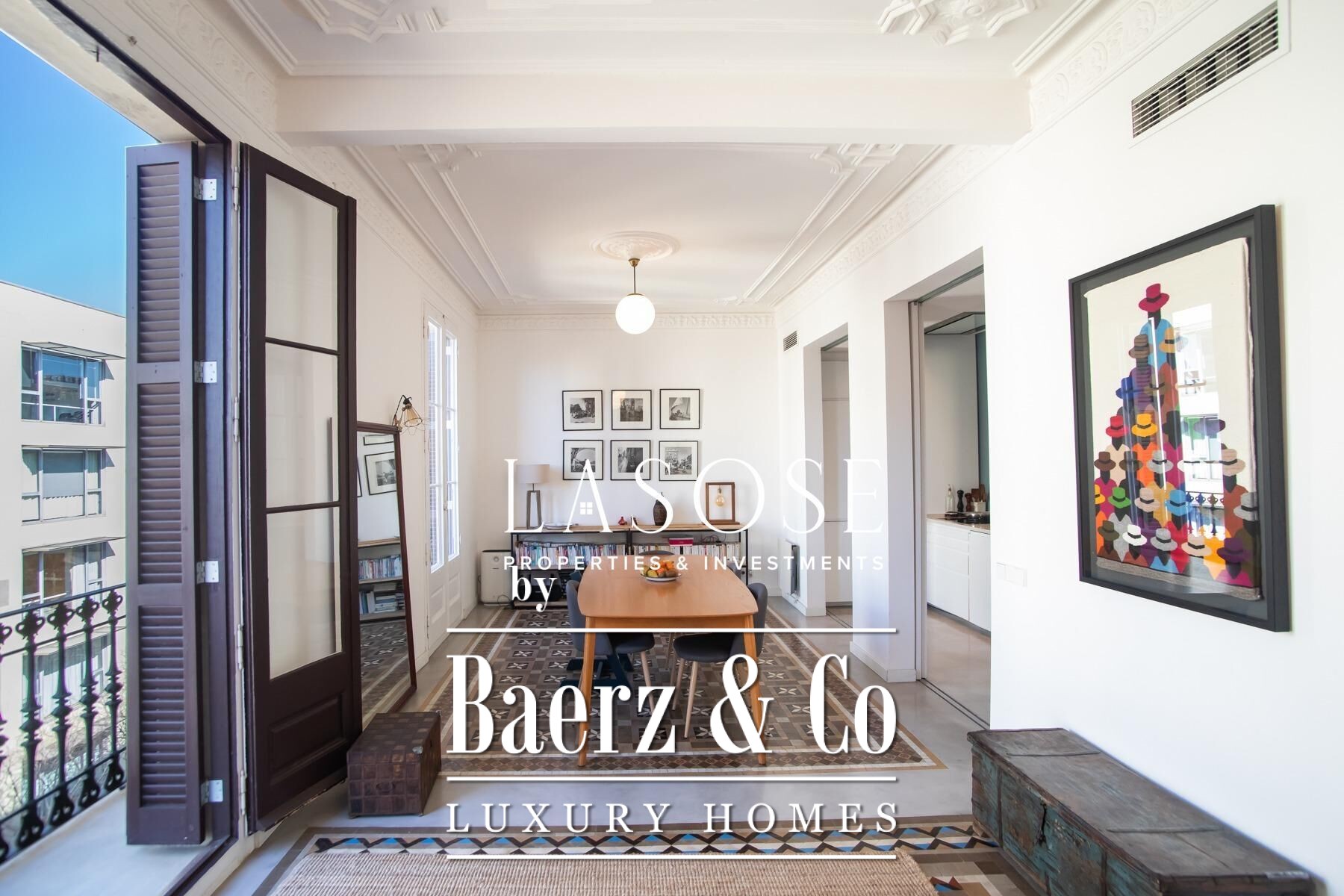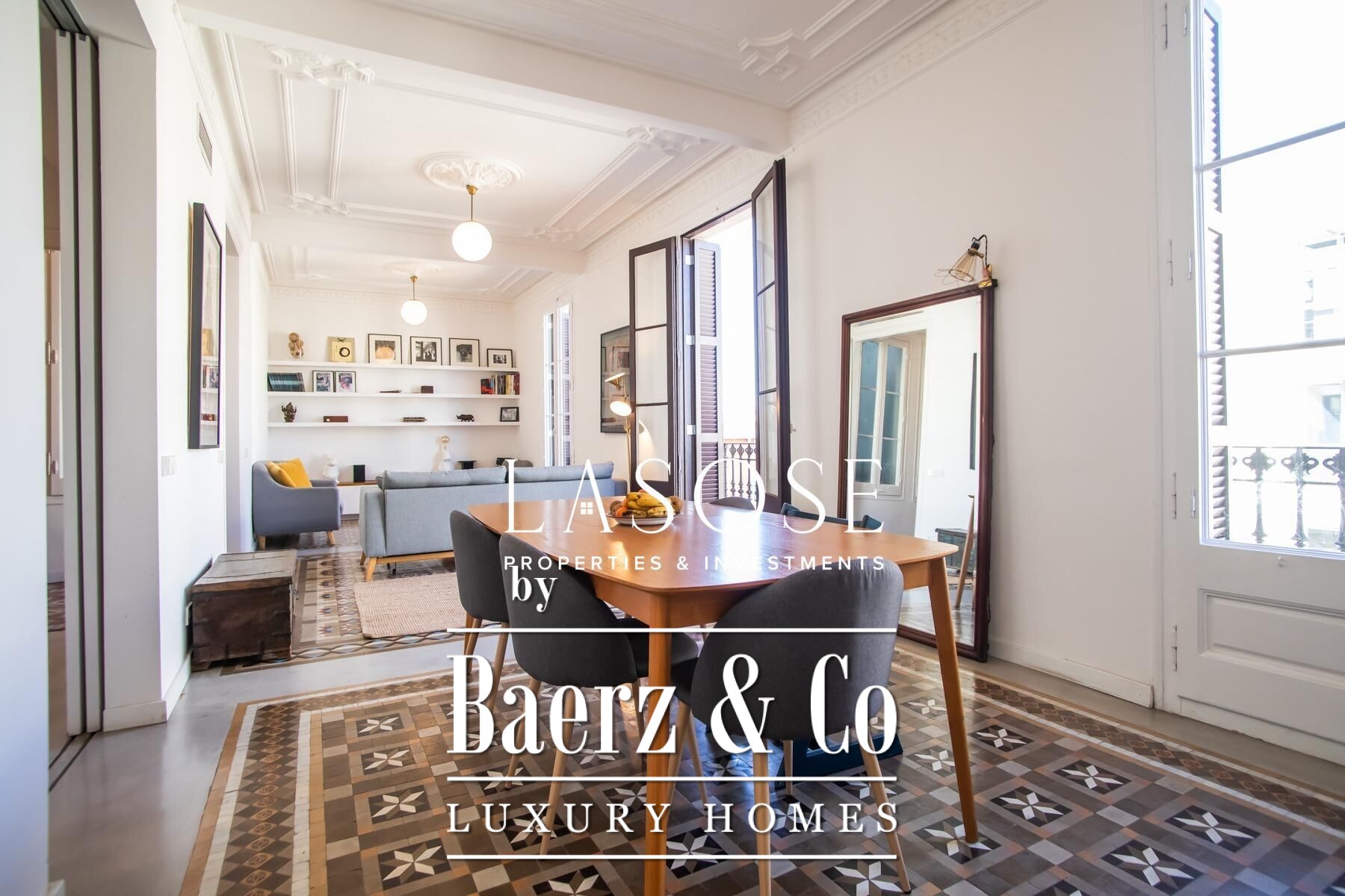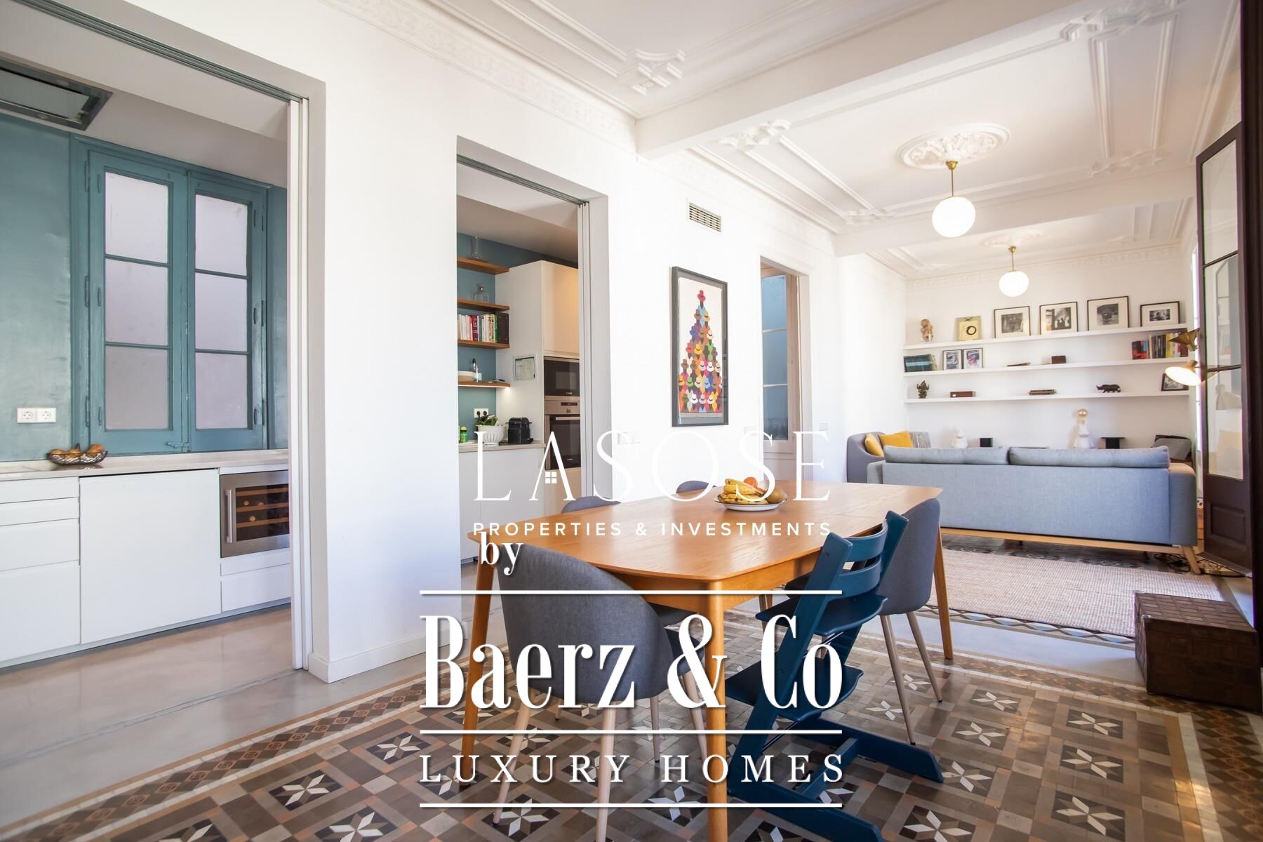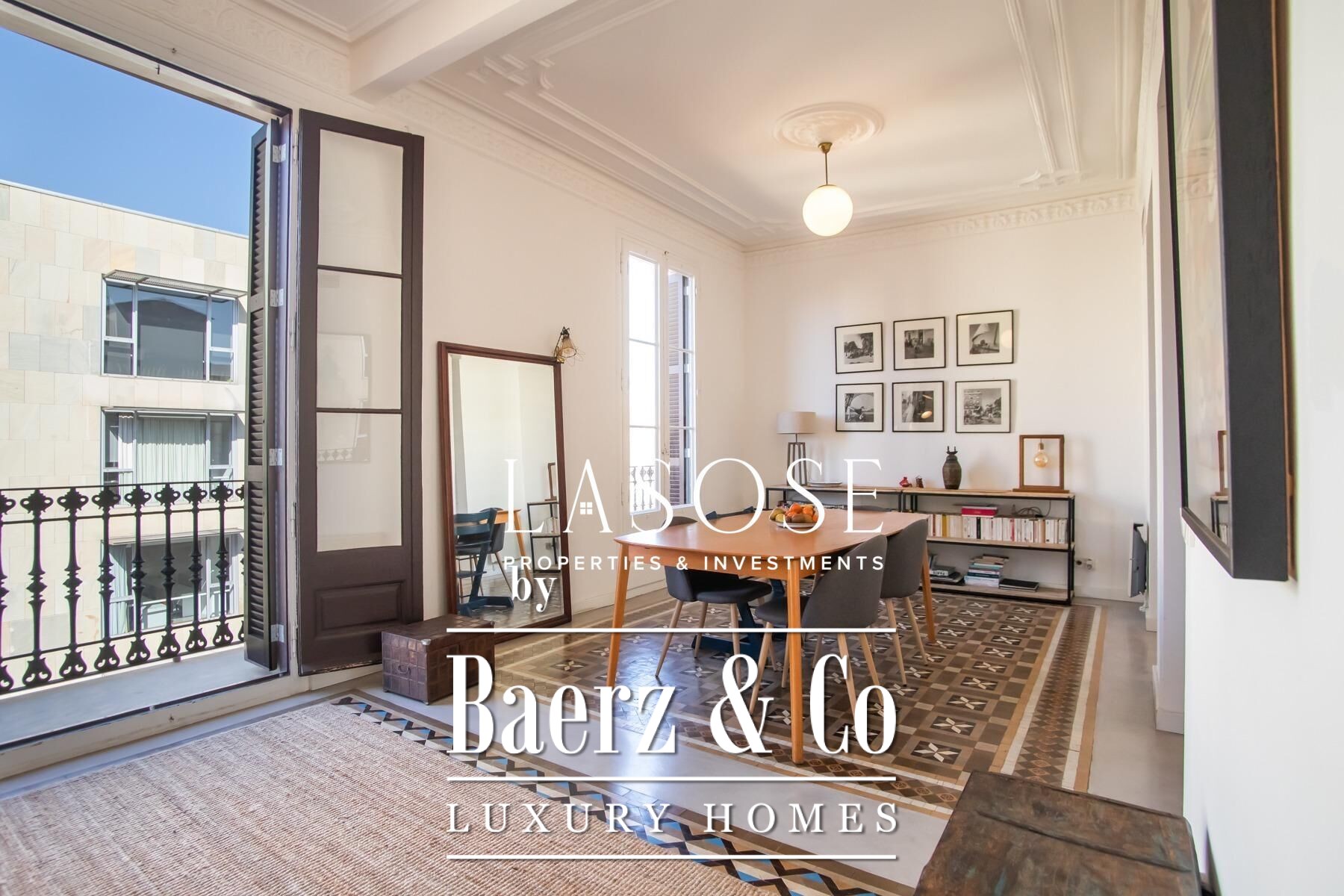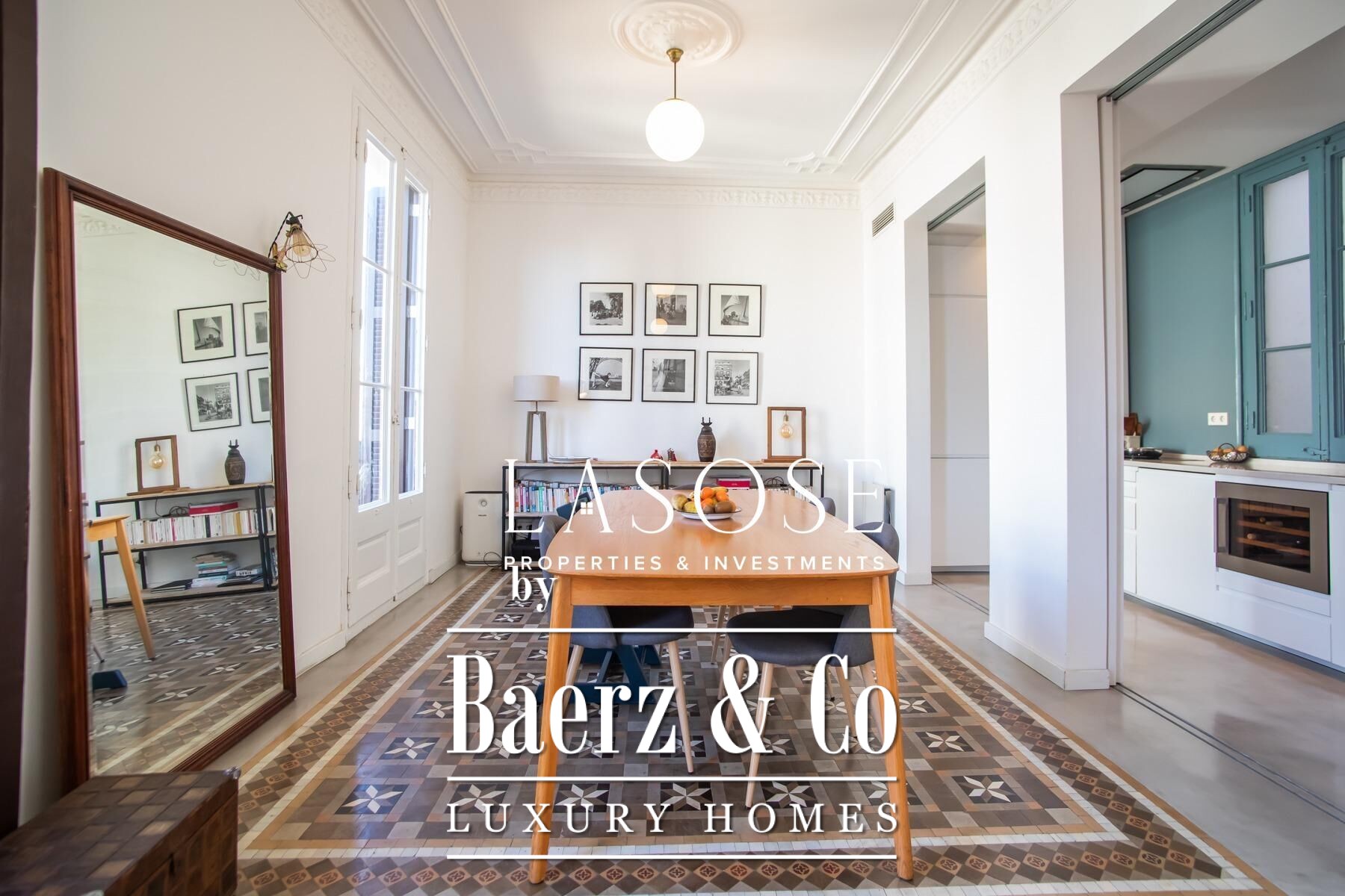 Apartment Barcelona sets a precise tone of heritage and refinement. This 130 m² residence is nestled within a spectacularly listed building that has been meticulously renovated, balancing classic provenance with purposeful contemporary interventions. The property preserves original architectural features—Nolla mosaic floors and coffered ceilings—harmoniously paired with microcement and modern materials, creating spaces that honor both tradition and present-day comfort.