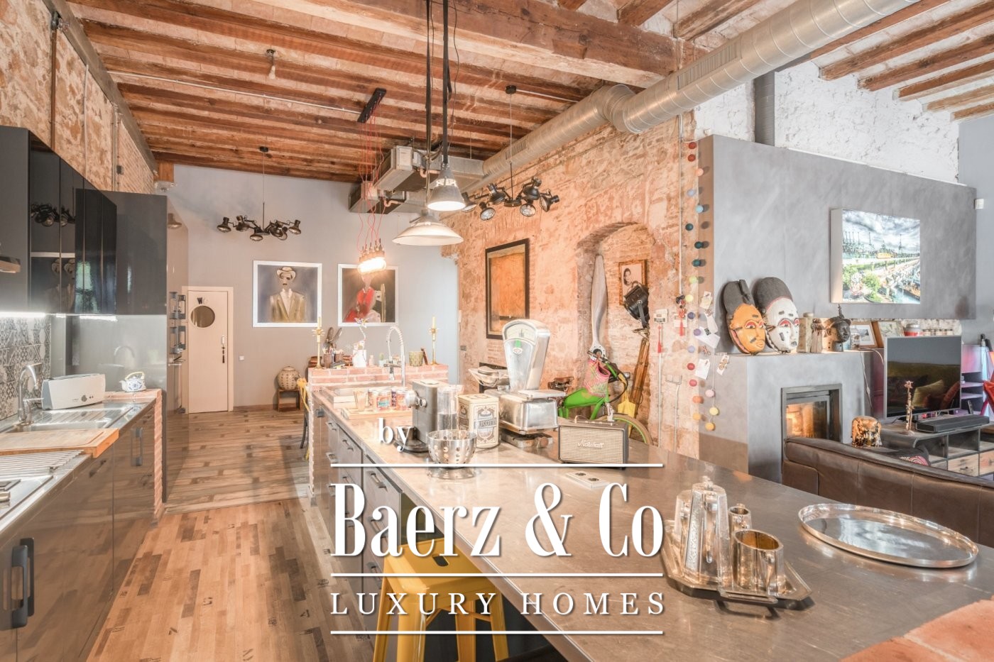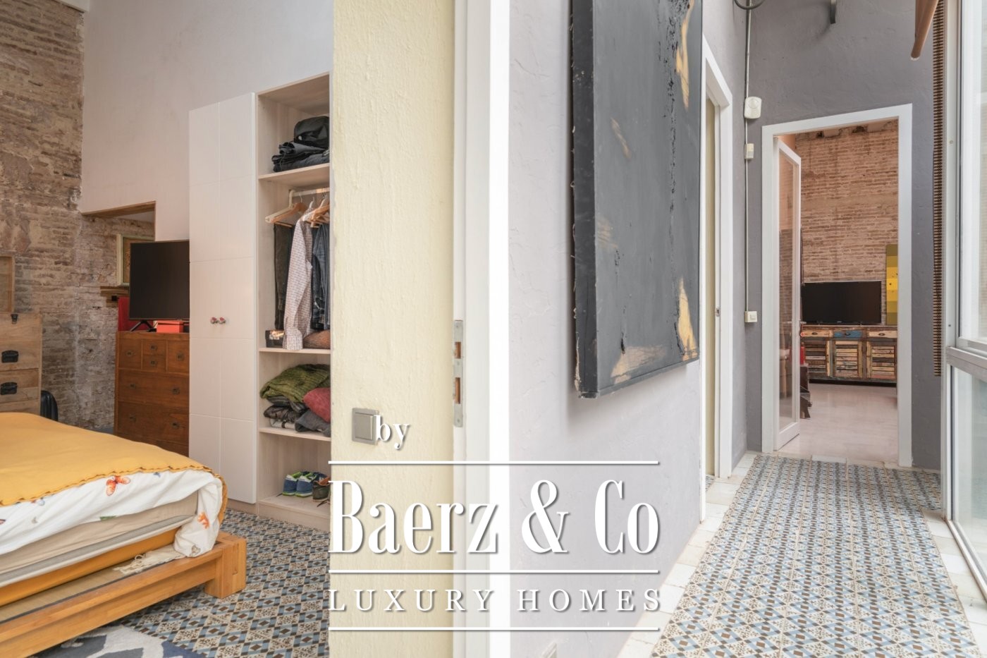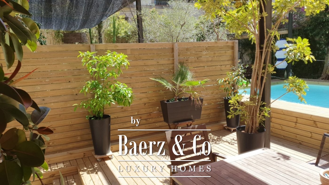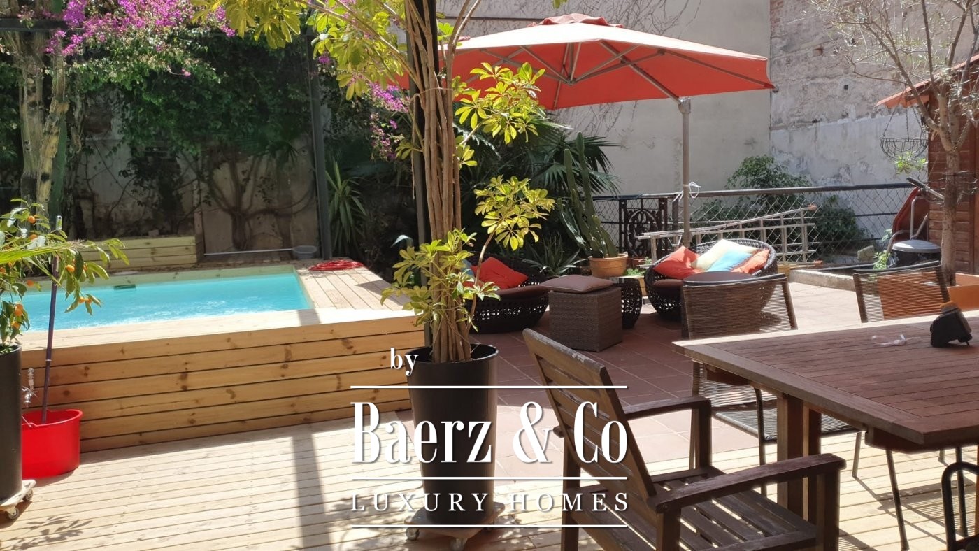 . . This catalan style apartment consists of 218 m2 plus 74 m2 of private terrace with pool. Upon entering, we find a corridor with huge windows that overlooks a large interior patio offering the space plenty of natural light. Ithis area connects the three double bedrooms; each one with its private bathroom, and another room that acts as a large multifunctional space that can perfectly be used as an office space.. . Following the corridor we find the day area, a huge and spacious space with very high ceilings up to 5 meters, composed of a large open kitchen, original brick walls and tiles, a toilet and a beautiful living room with a (wood) fireplace from which you can access the wonderful terrace with a pool shared with the neighbour next door. The terrace is private and is recently restored with new roofing to guarantee privacy. The whole house was completely renovated keeping original elements and decorated with great