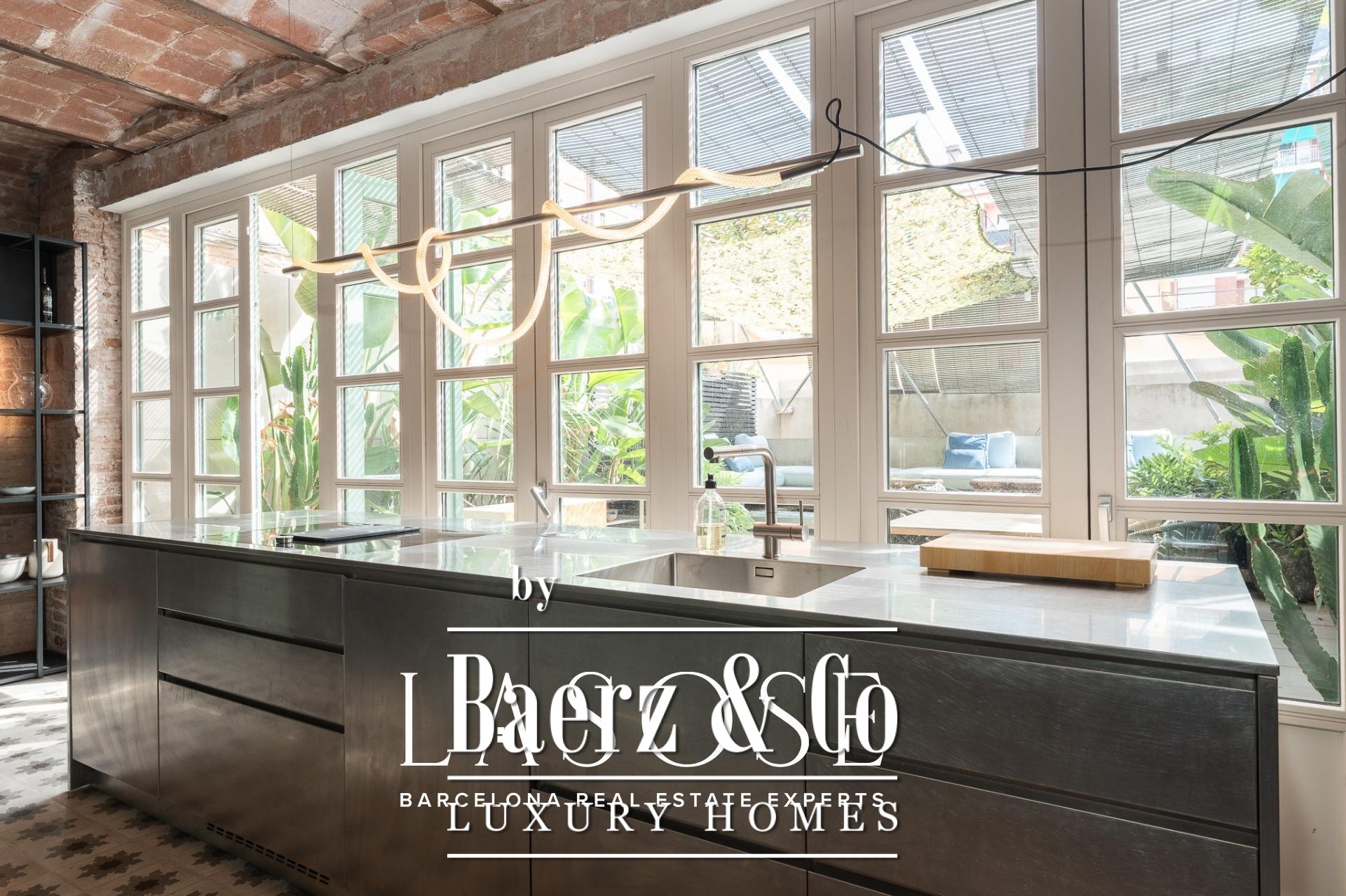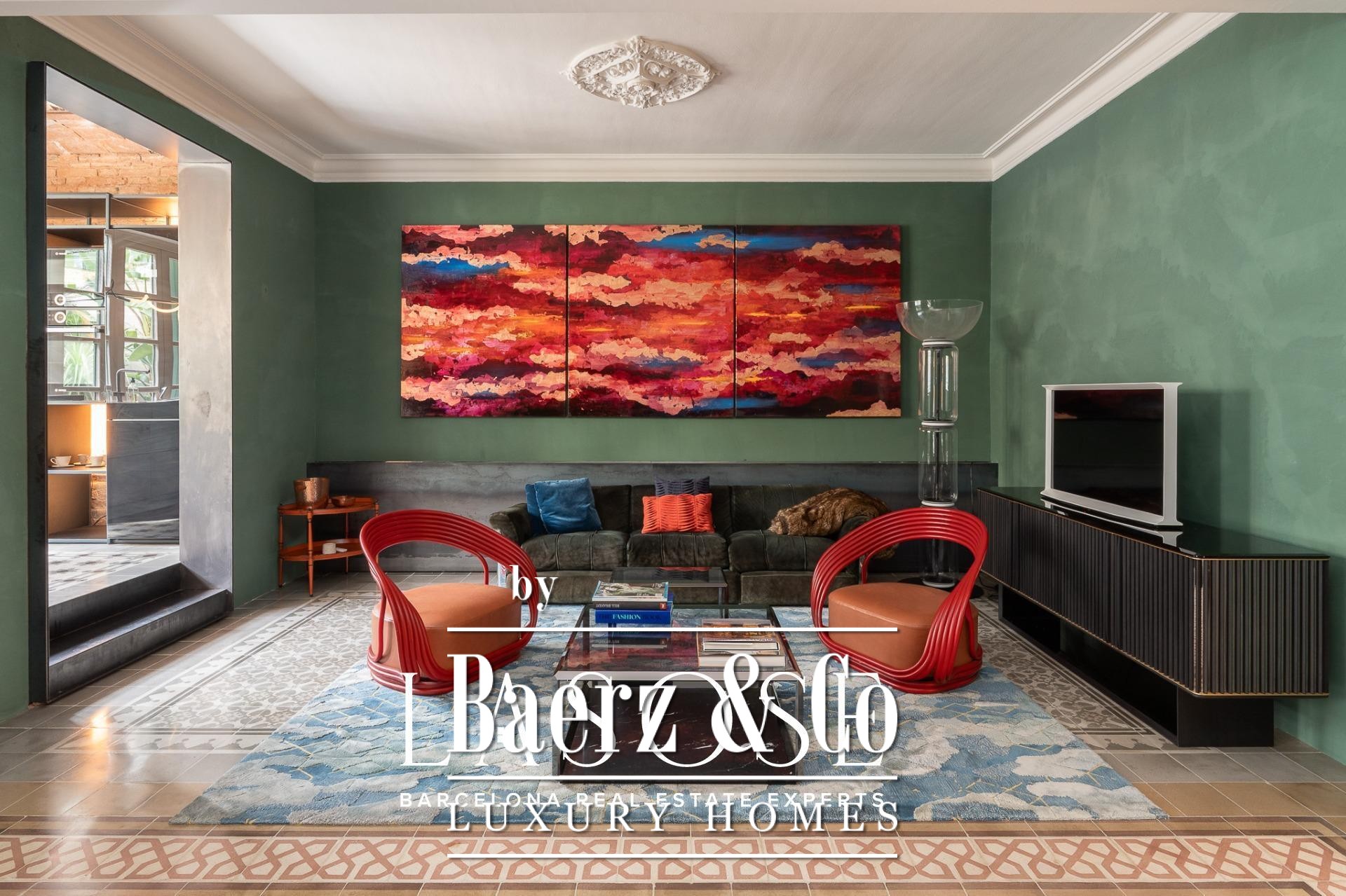 room, ideal for entertaining guests or enjoying with family. The high ceilings provide a sense of spaciousness and brightness, while the semi-open kitchen allows natural light to flow throughout all areas. From here, there is direct access to the 60 sqm terrace, with lush greenery and south-facing orientation, making this outdoor area a natural extension of the interior. A serene spot overlooking a quiet courtyard: the perfect place to escape the hectic rhythm of the city.. . Eixample is one of the most sought-after districts in Barcelona, making the location ideal for both a first or second residence. Having such a spacious and private outdoor area is a real privilege today, allowing you to enjoy the sun and Mediterranean climate at any time.. . In short, this property perfectly combines the best of modernist architecture with the comfort of a contemporary home. Original ceiling mouldings, exposed brick walls, mosaic hydraulic tiles, and Catalan vaulted ceilings are some of the period features that make this apartment truly one of a kind in Barcelona.