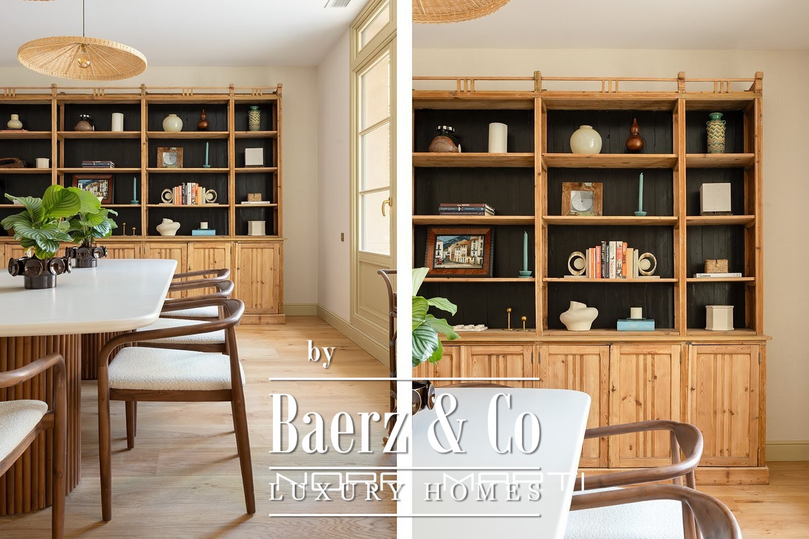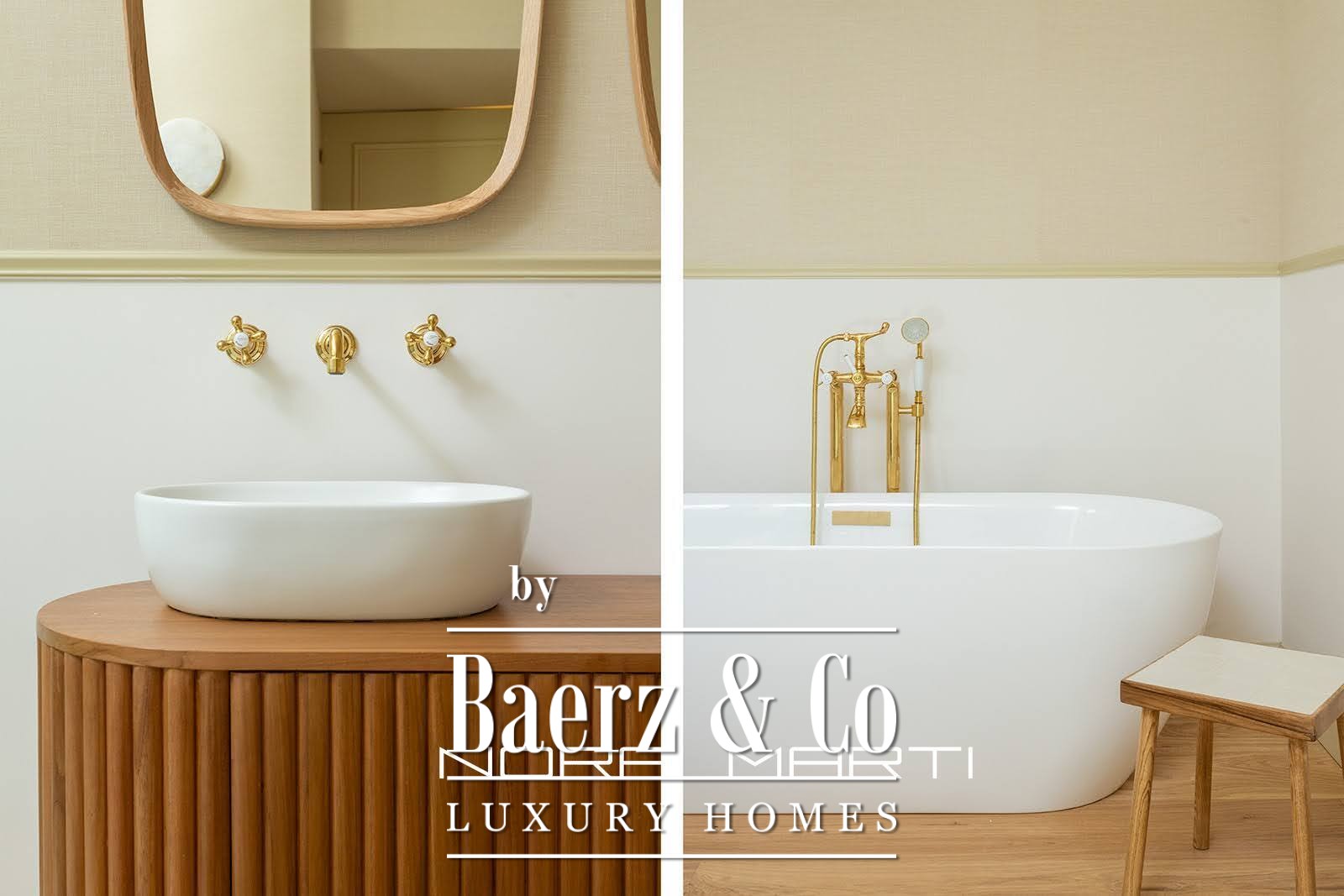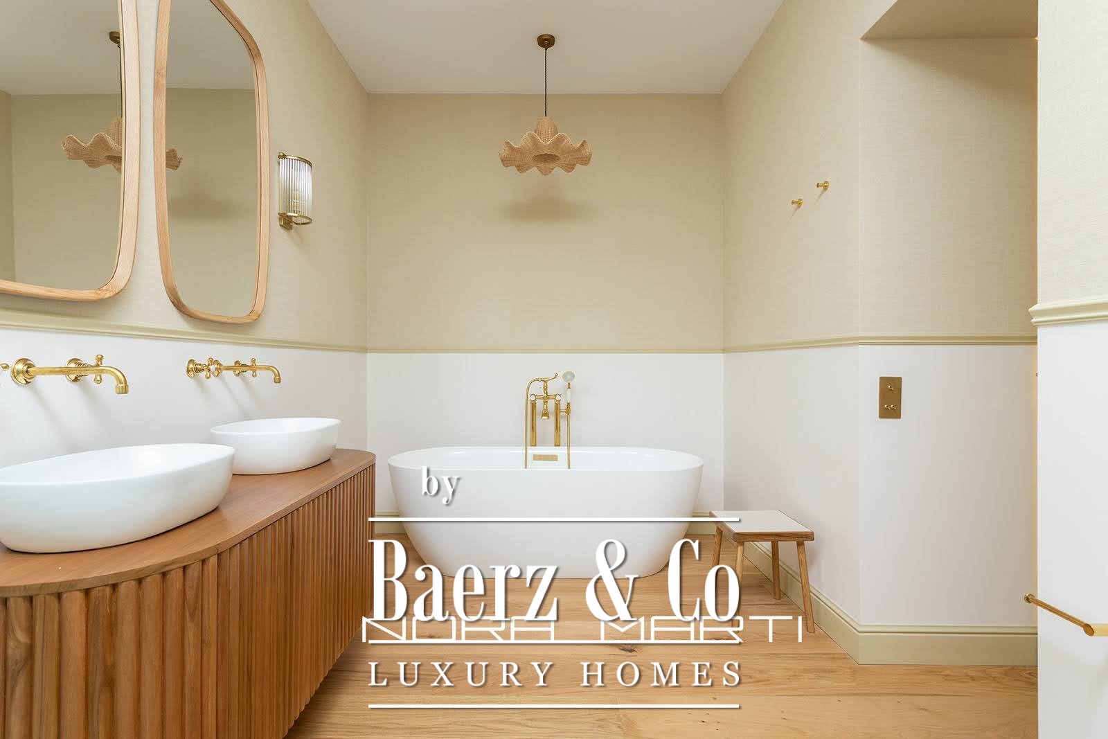 Each of the three exterior bedrooms features double beds, bespoke wardrobes, and en-suite bathrooms finished with aged brass fixtures from a notable Catalan maker. Decorative lighting from Catalonia and England, including vintage and antique pieces, enriches the ambiance. The inviting green terrace offers rare tranquility in Passeig de Sant Joan, presenting opportunities for relaxation, entertaining, and a distinct sense of space in central Barcelona. This luxury apartment for sale in Passeig de Sant Joan combines timeless materials and contemporary comfort in an exceptional urban address.
