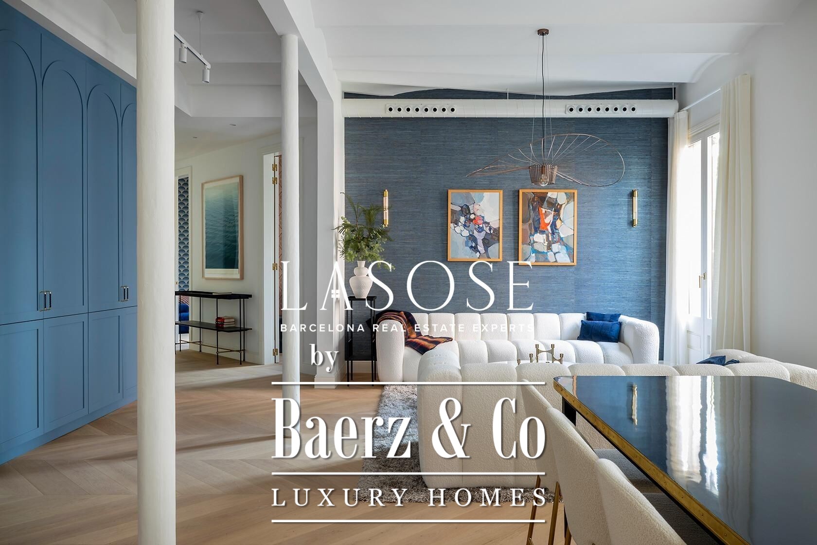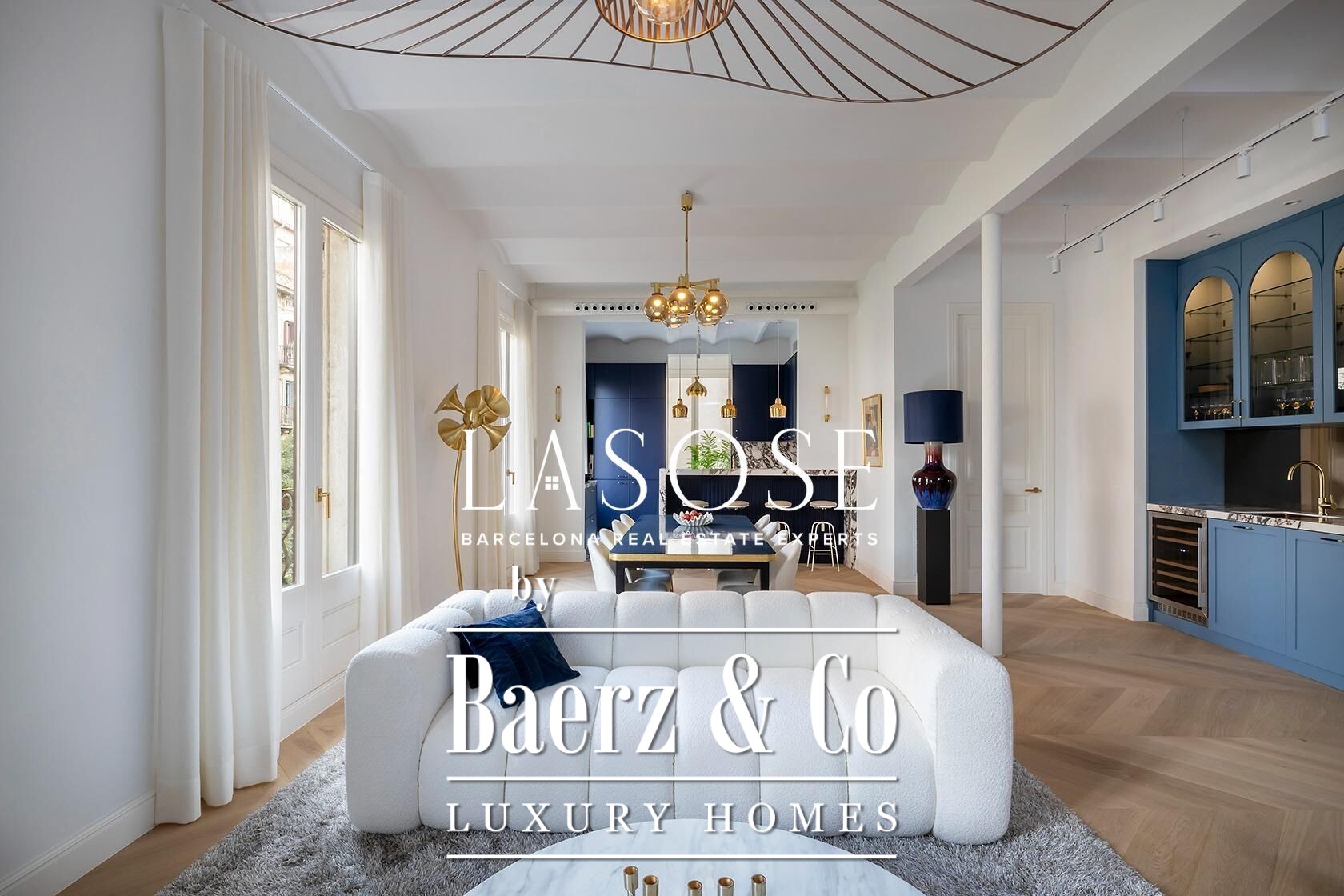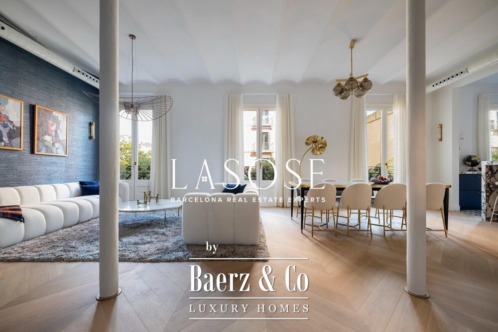 Apartment Barcelona stands as an invitation to refined urban living. This 199 m² residence on the third floor is newly renovated and thoughtfully designed to embrace natural light, with four balcony doors opening over Calle Girona and expansive windows enhancing the luminous atmosphere. The layout flows seamlessly from the open-plan kitchen and dining area to a living room anchored by a bespoke bar and pantry with two wine fridges and a second dishwasher.