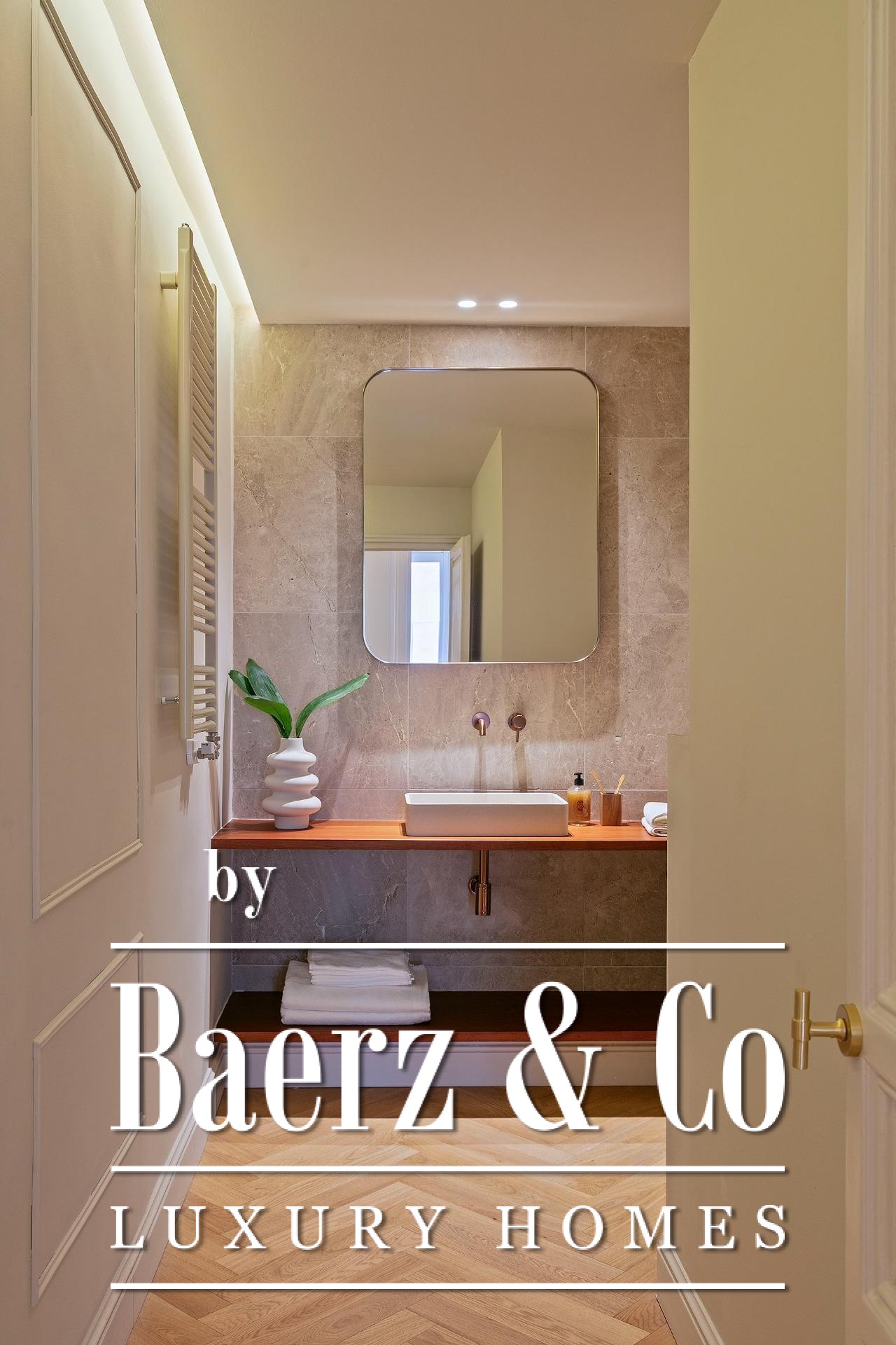 The living area centers around a luminous living-dining room with an open, custom-designed kitchen crafted in natural oak and equipped with high-end Miele appliances. The flow between dining and relaxation is ideal for entertaining or daily life. There are three bedrooms, including a main suite that stands as a private oasis, complete with an en-suite bathroom and a distinctive walk-in dressing area set within a gallery that bathes the space in natural light.