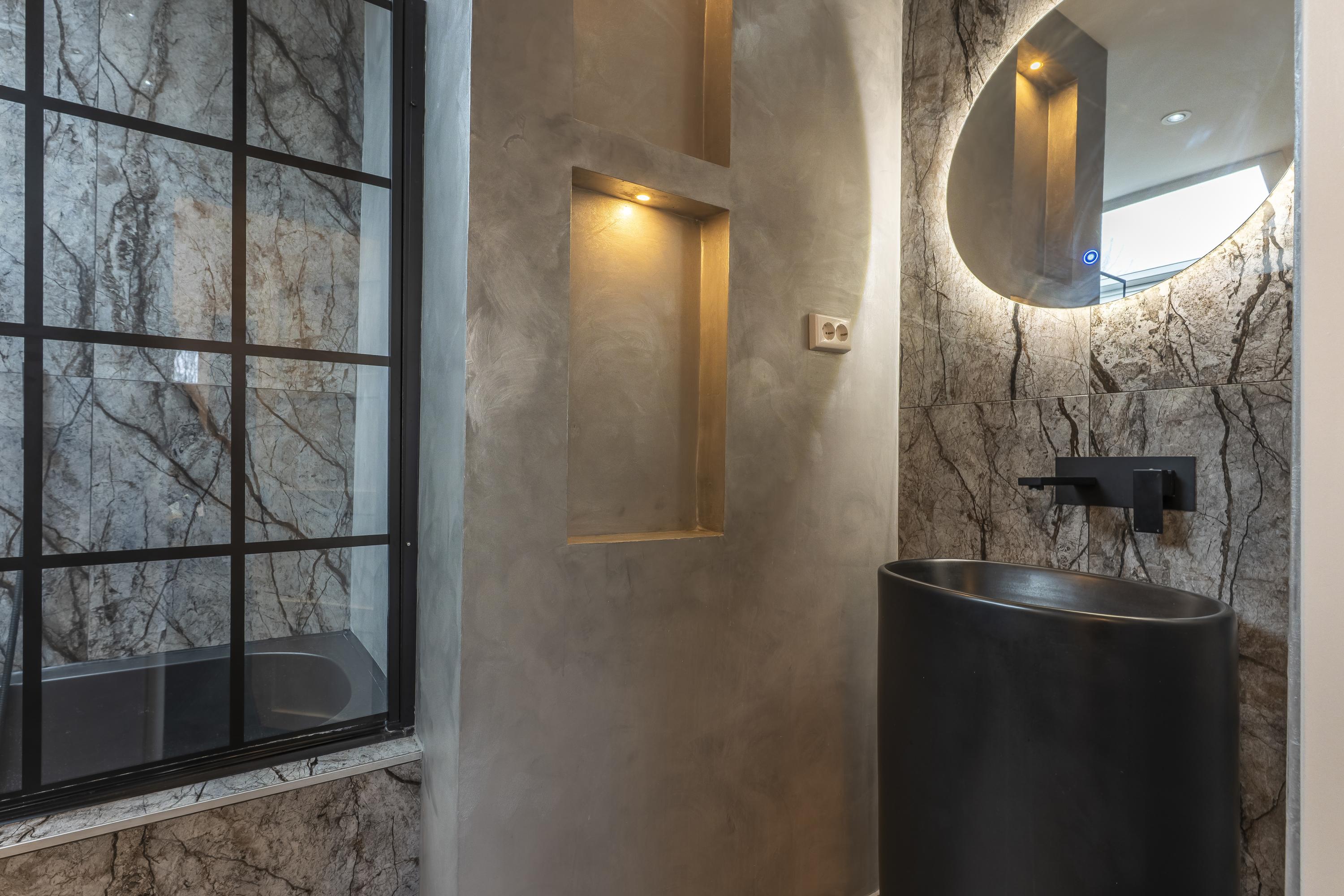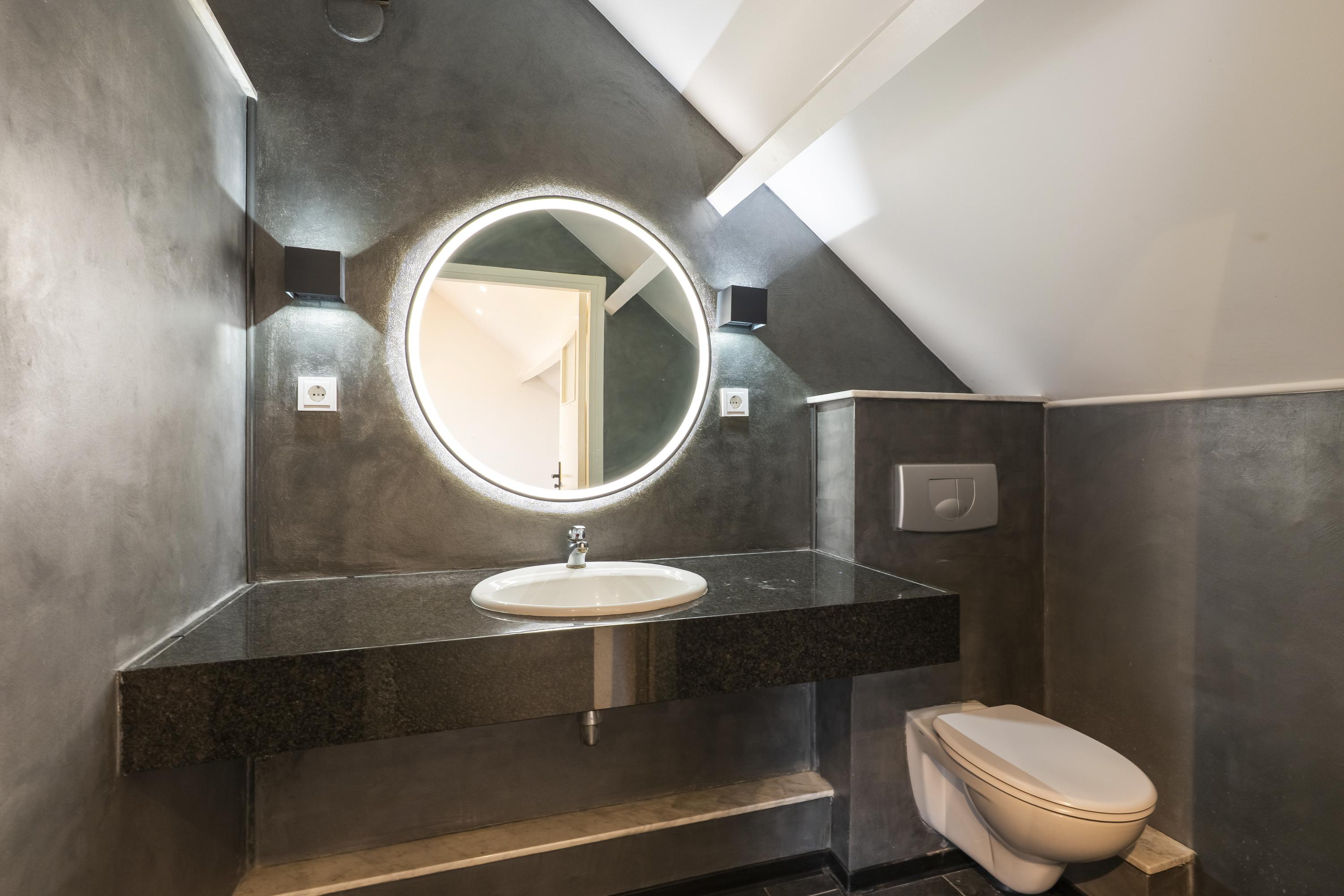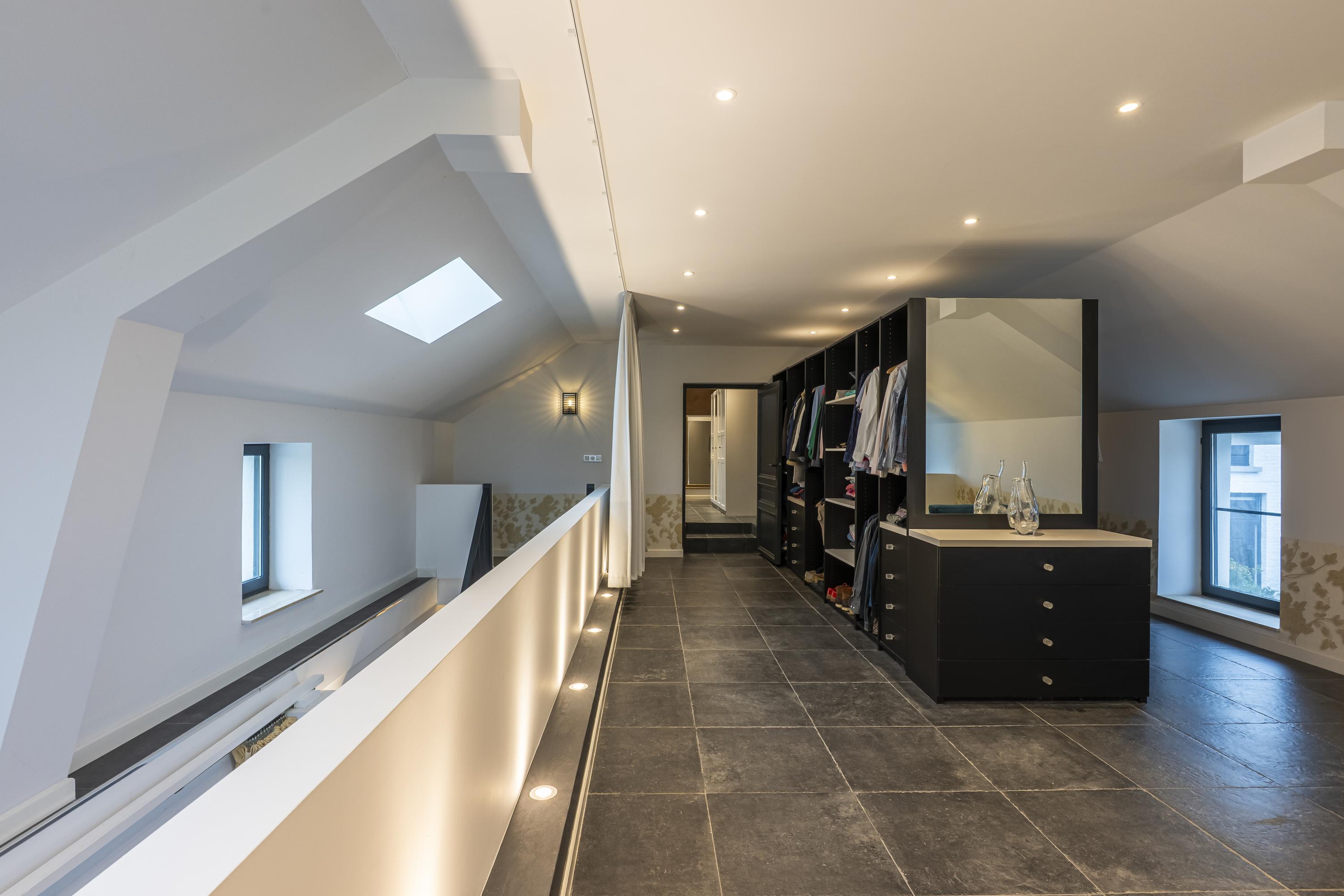 The main residence is conceived around light, proportion and a strict architectural consistency. The spacious living kitchen, fitted with Gaggenau appliances, forms the heart of the home. The adjoining living area exudes understated luxury with generous windows, a modern wood stove, and direct access to both the courtyard and the garden terraces. Large anthracite tiles extend seamlessly outdoors, creating a unified interior–exterior composition. A study (or additional bedroom) on the ground floor and the elegant Golden Bathroom complete the ground level.