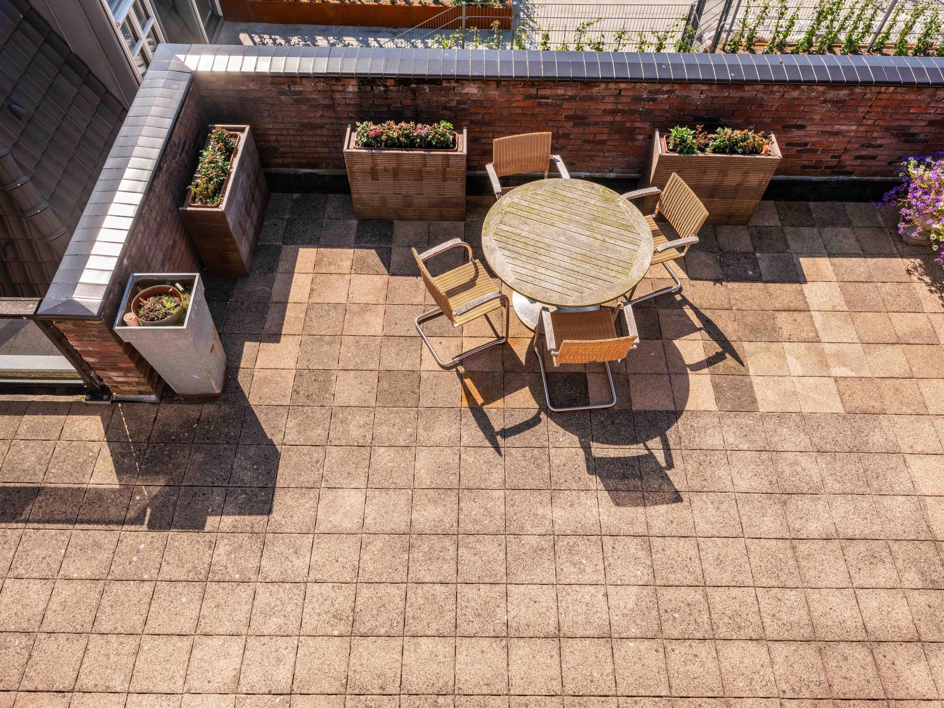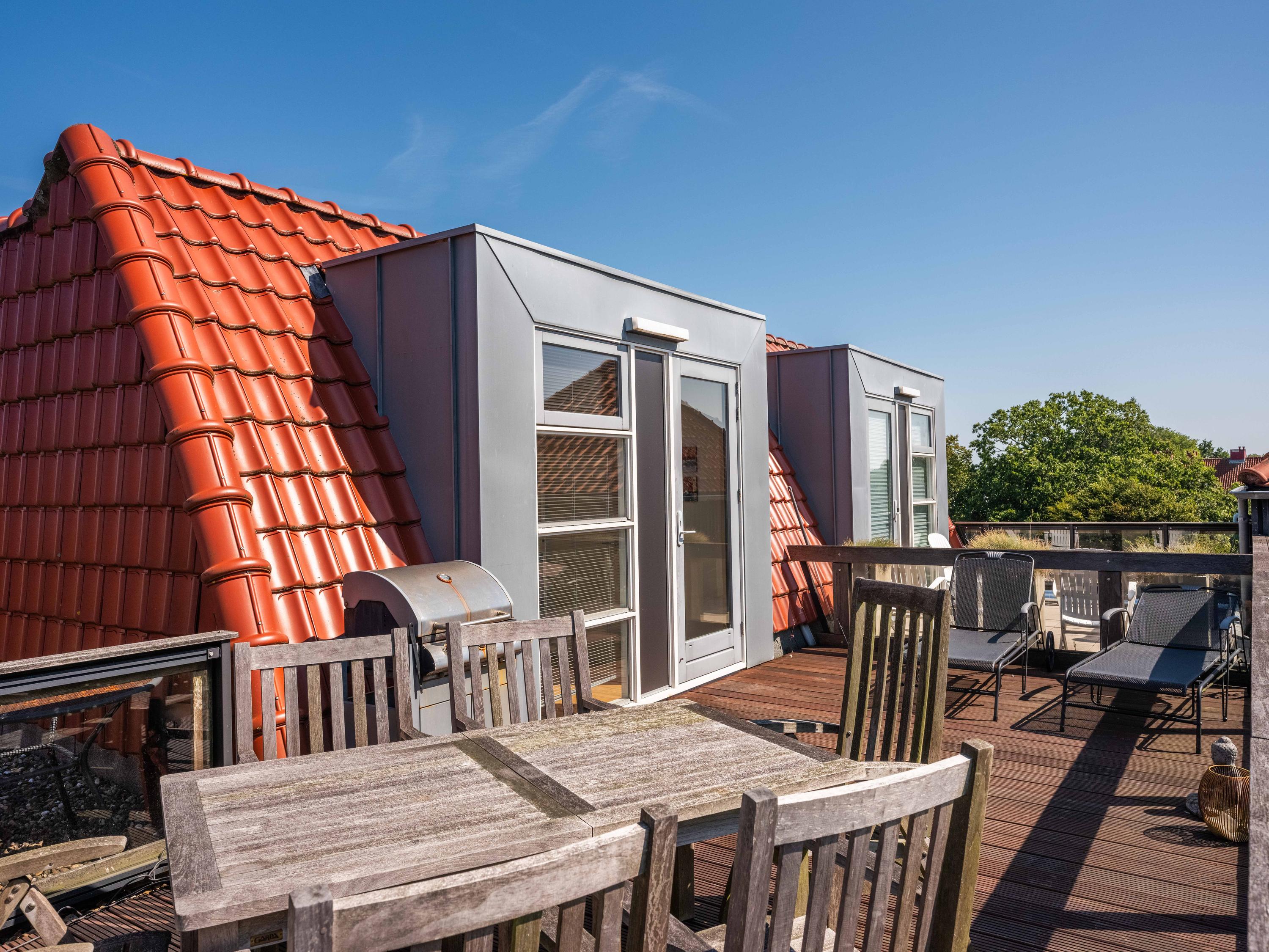 The living room also has two cosy seating areas. The room flows into the open kitchen, which is fully equipped with high-quality built-in appliances and plenty of storage space. On this floor there is also an office/bedroom and the first bathroom with shower, toilet and washbasin.