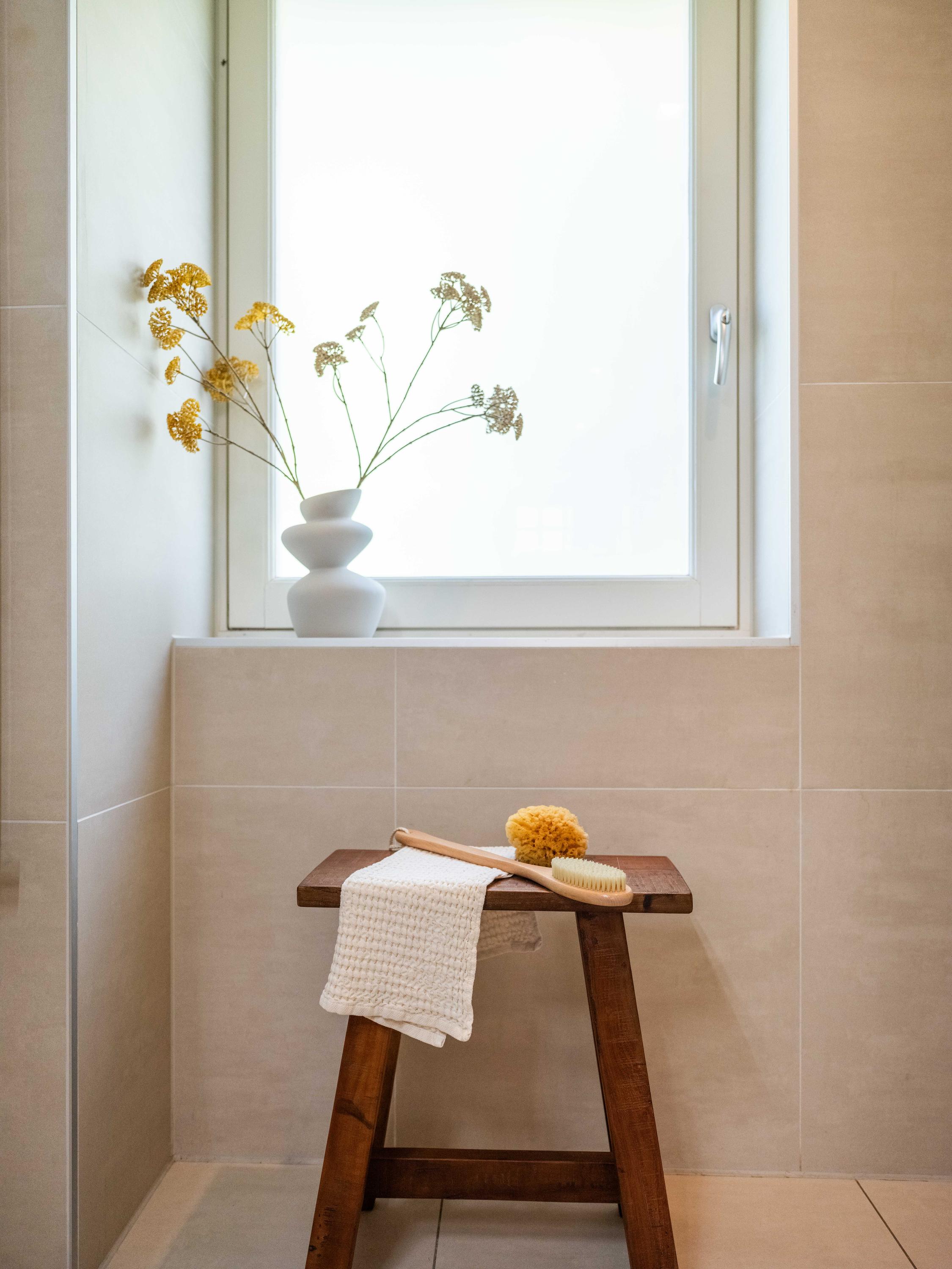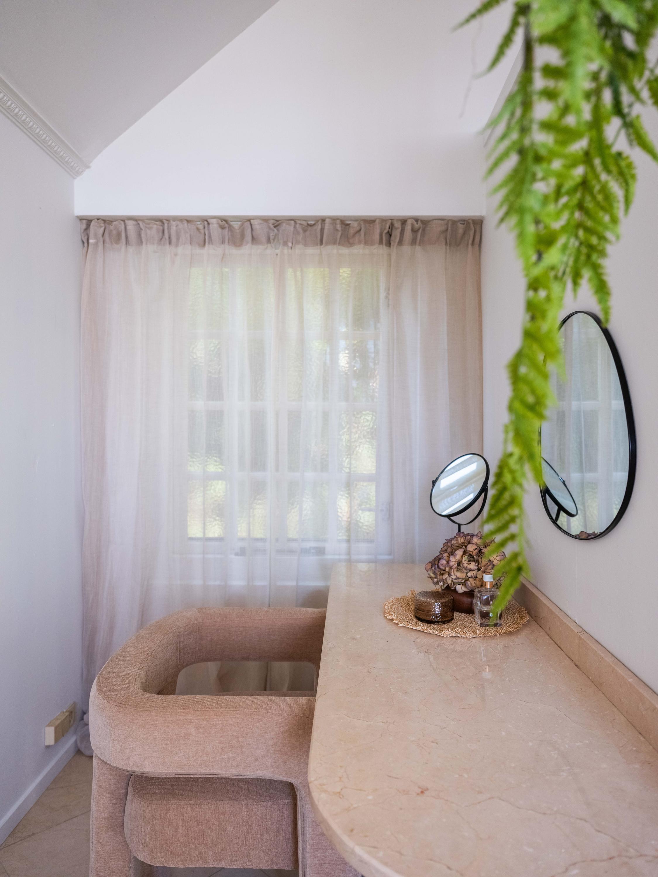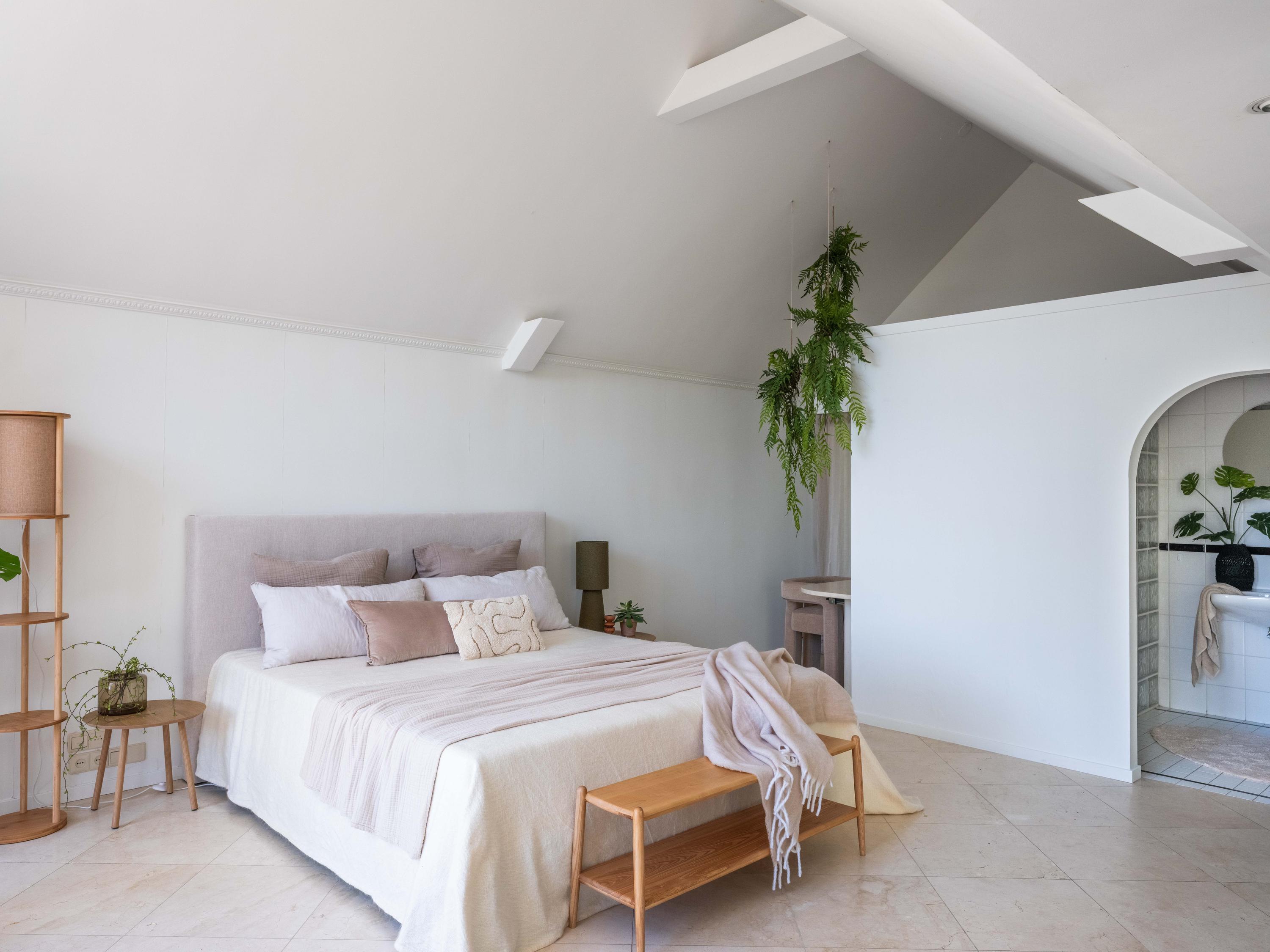 The living room is anchored by a gas fireplace, framed by exposed beams and stained-glass windows that reference the villa’s heritage. High ceilings channel daylight, while the adjoining kitchen, equipped with built-in appliances, flows into a utility room with modern conveniences. Upstairs, the primary bedroom connects to a generous roof terrace, capturing sunsets over the countryside. The upper bathroom, renovated in 2018, features a bath, walk-in shower, and double basins.
