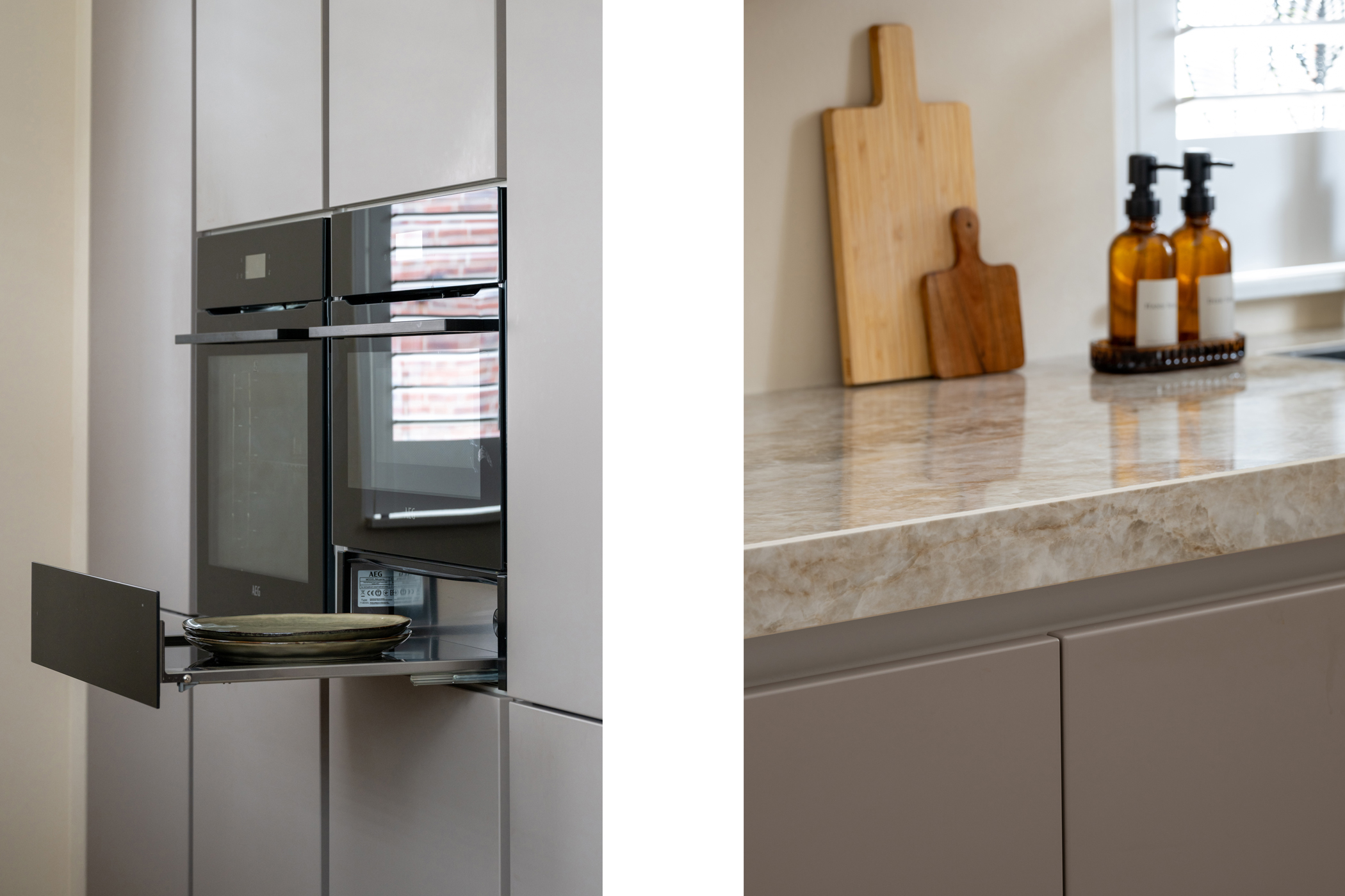 The inviting living room is bright and spacious, with the seating area at the rear. At the front, you’ll find the generous kitchen with a stylish island, finished with a luxurious marble countertop. The kitchen is fully equipped with high-end built-in appliances, including an induction cooktop with integrated extractor, oven, combination microwave, warming drawer, Quooker, fridge-freezer, and dishwasher.