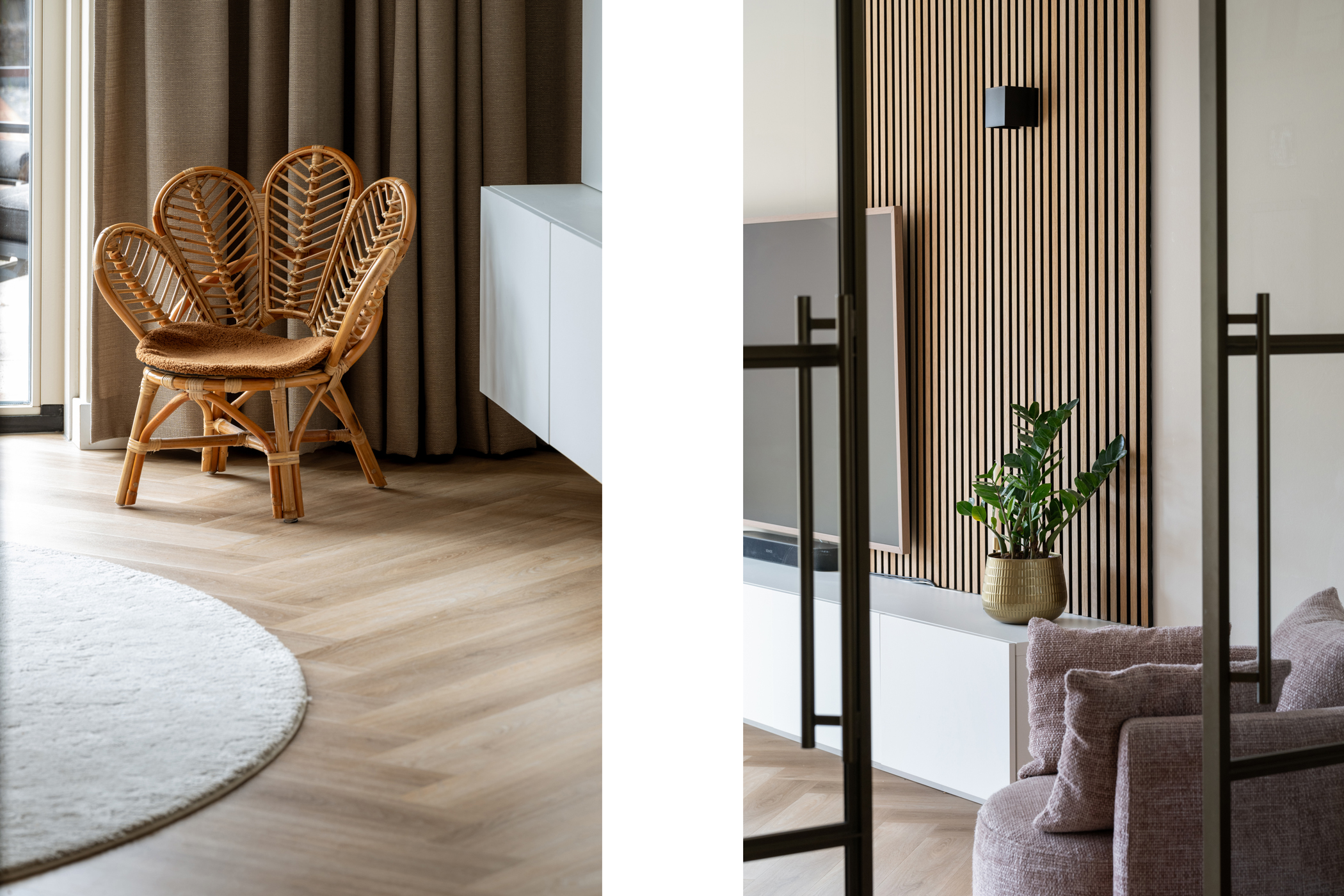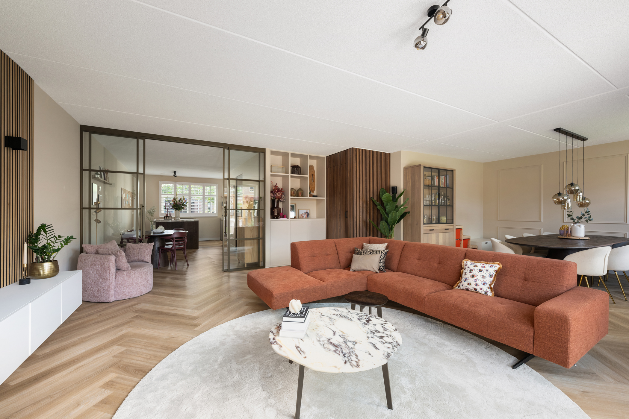 What makes this living space extra special are the elegant copper-colored steel sliding doors, subtly and stylishly separating the kitchen from the living room. They create a playful layout without sacrificing light or a sense of space.