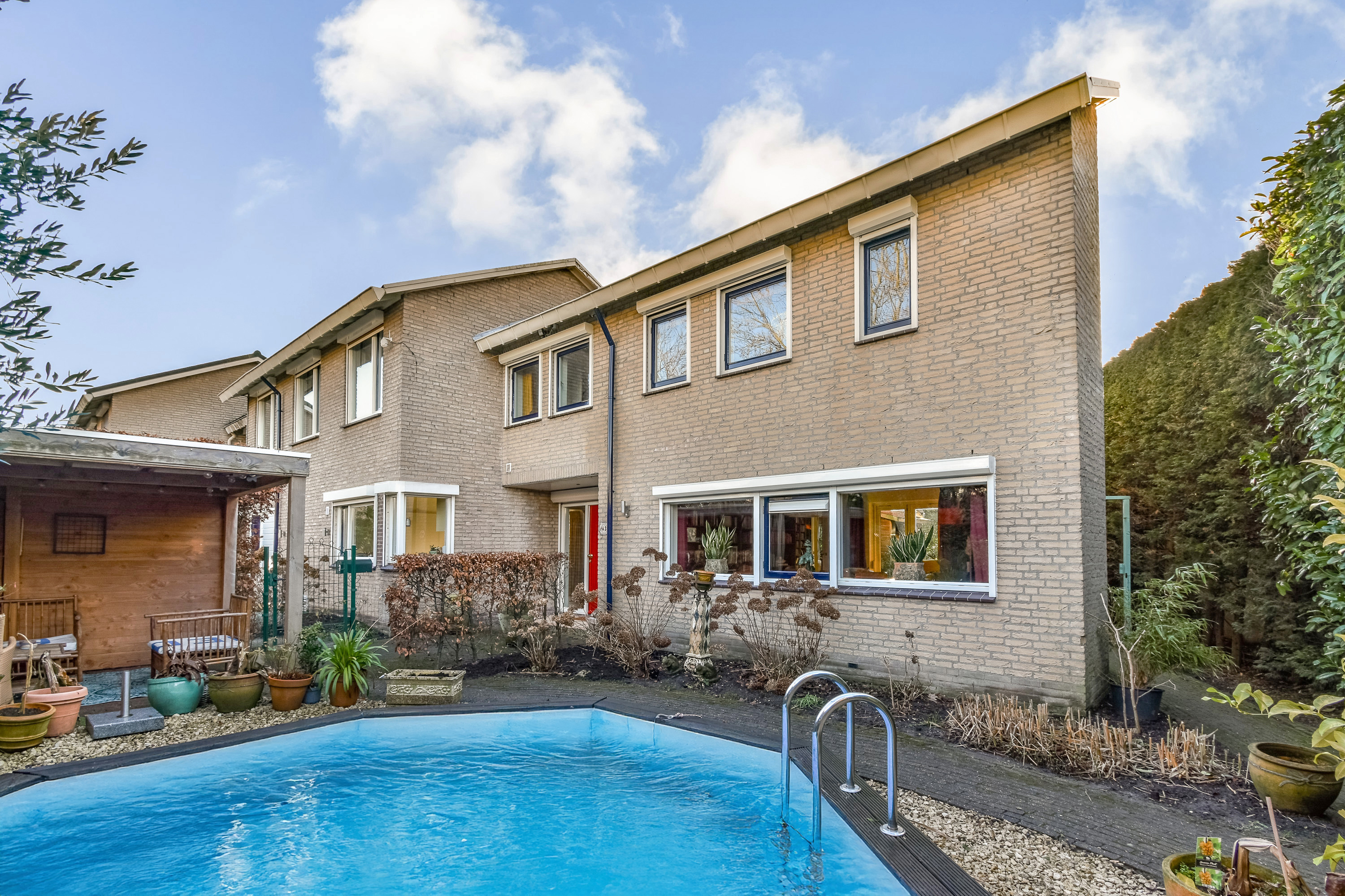 The garden is a private retreat on three sides of the house, facing southwest for optimal sunlight, offering a solar-heated outdoor pool, terraces, and established plantings. Modern comforts include double glazing, full insulation, mechanical ventilation, air conditioning, and energy class A status, with efficient heating and 14 solar panels. Security features and private on-site parking complete the sense of safety and exclusivity. This family house Bergschenhoek offers an elegant synthesis of spatial luxury and privacy, ready to meet modern living standards.