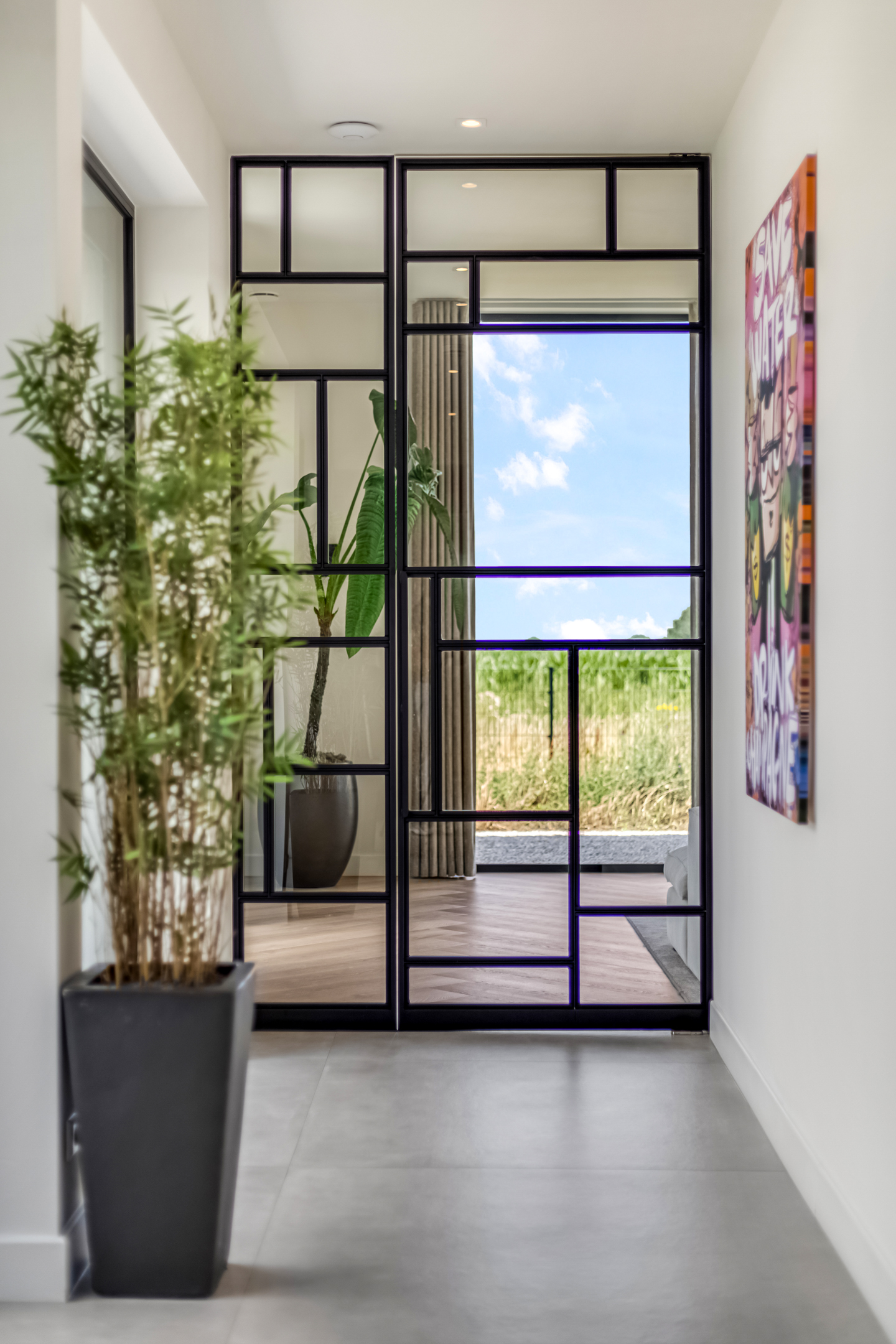 Approx. 19.5 m², with tiled flooring, plastered walls and ceiling with recessed lighting, a wardrobe, floating staircase with access to the master suite and first floor, and a floor-to-ceiling steel door leading to the corridor.