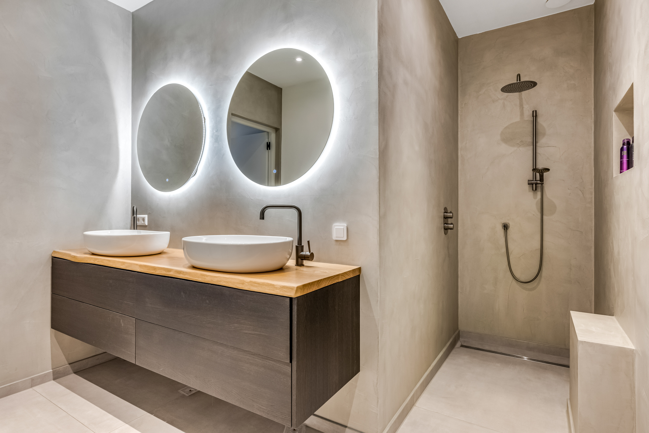 Approx. 8.5 m², with tiled flooring, plastered walls (beton ciré), plastered ceiling, walk-in shower, and a vanity unit with two sinks.