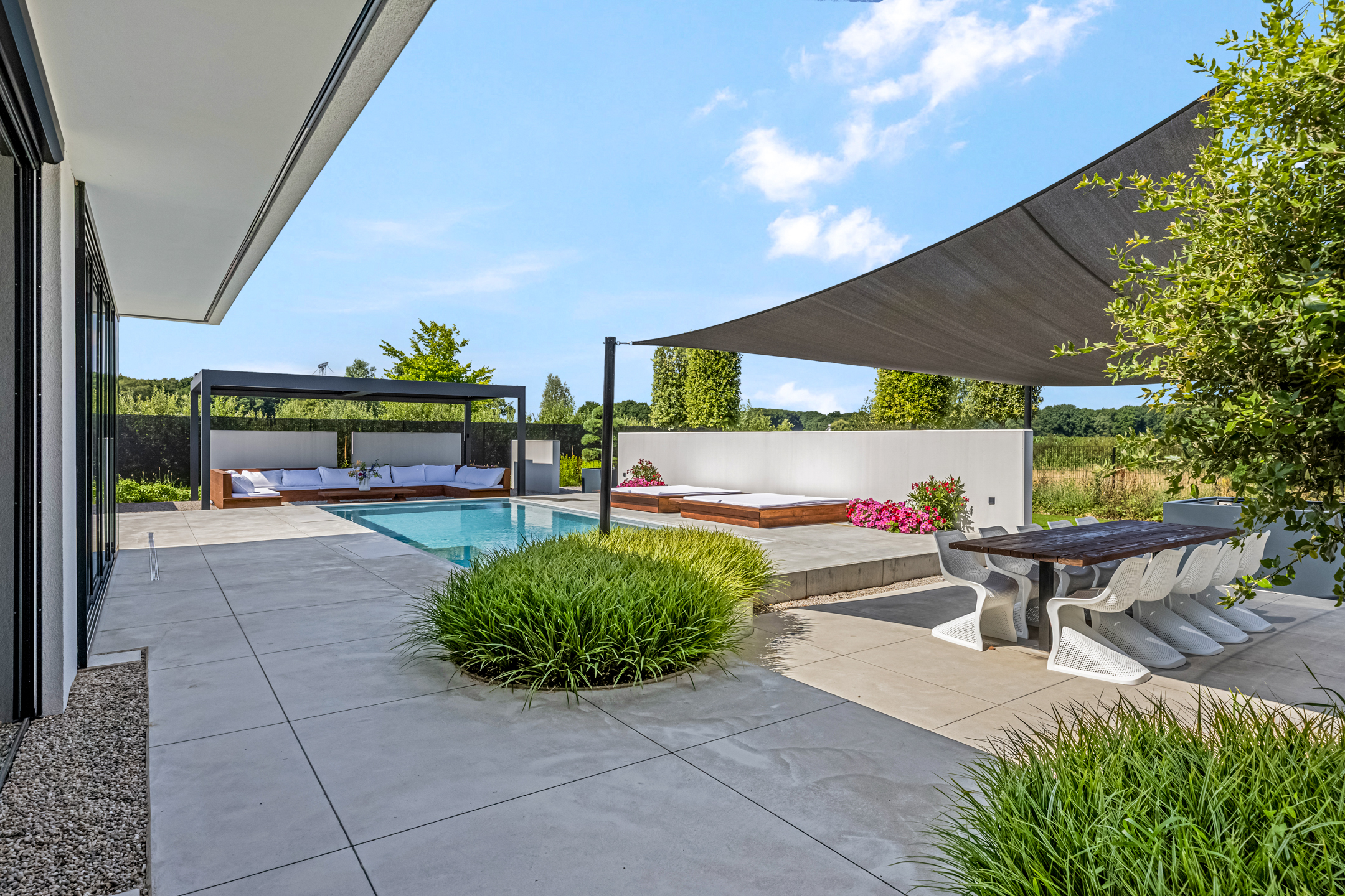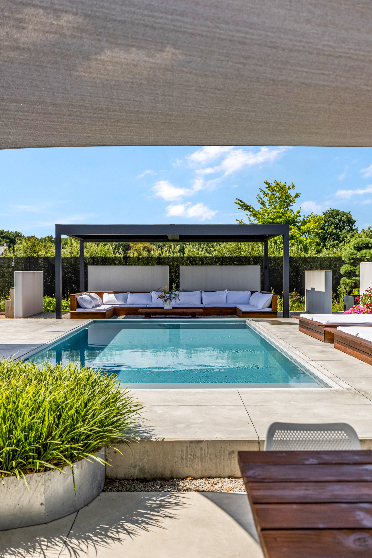 Approx. 26 m², with lighting, automatic louvered roof, and custom hardwood lounge bench.