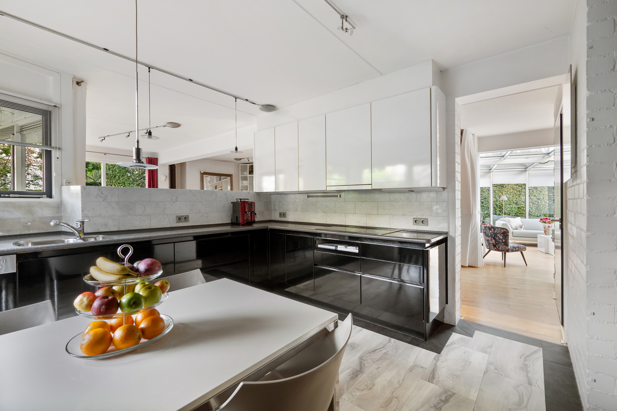The kitchen is centrally located and equipped with a double sink with mixer tap, dishwasher, extractor hood, and combi oven. The kitchen also provides access to the multifunctional space and the spacious garage.