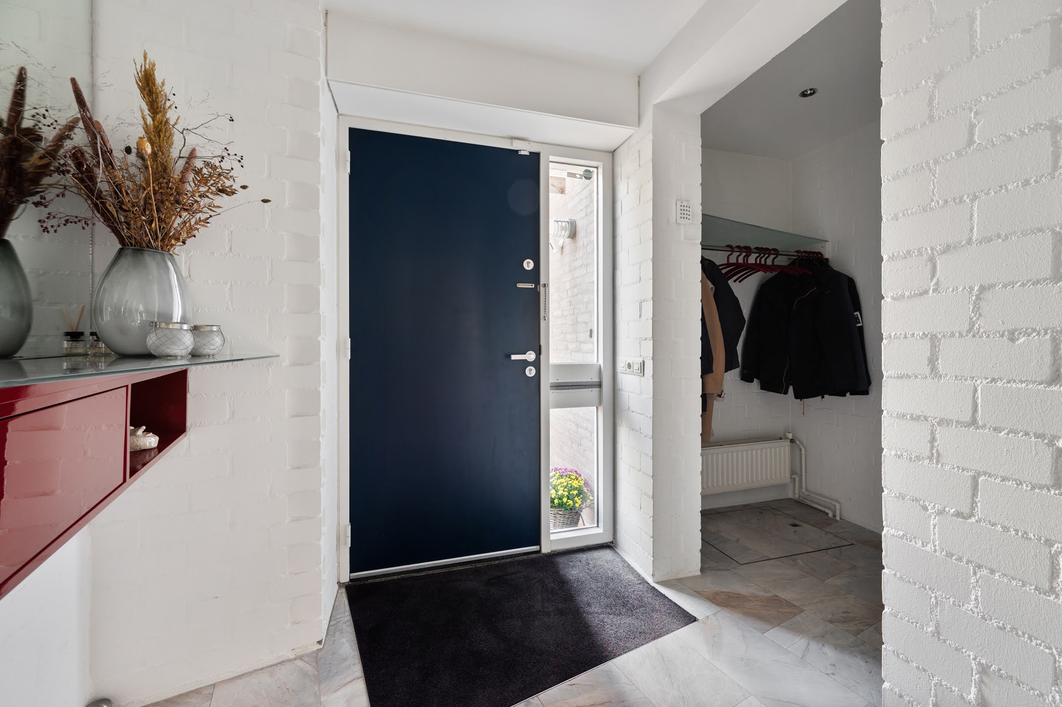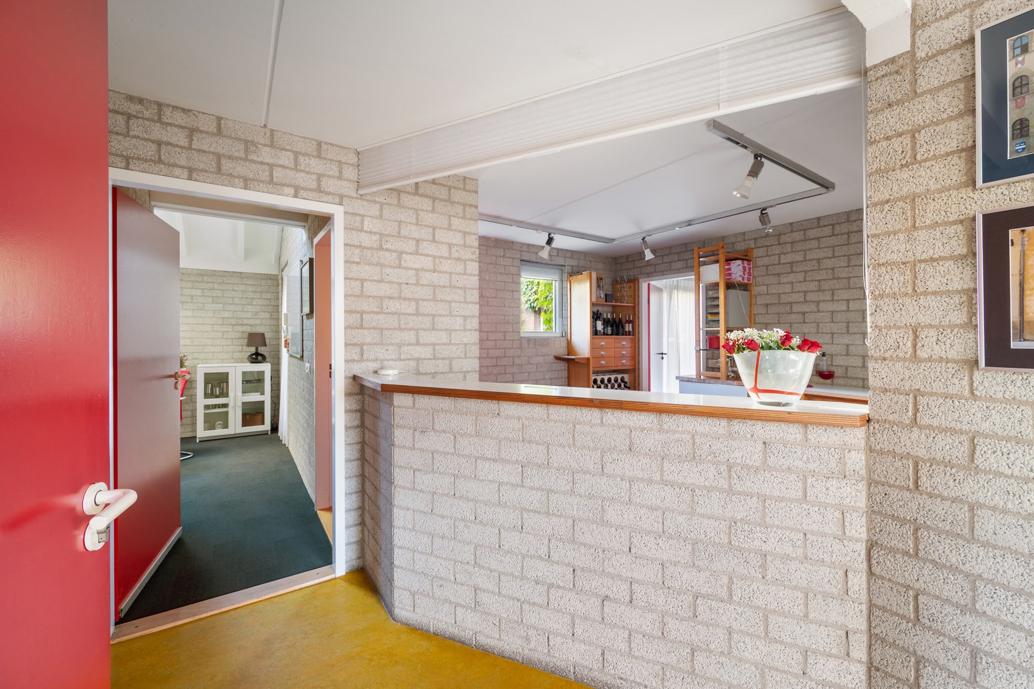 Entrance hall with meter cupboard, wardrobe, toilet, and access to the living room. From the hall, you enter the living room, which connects to the open kitchen and the conservatory.