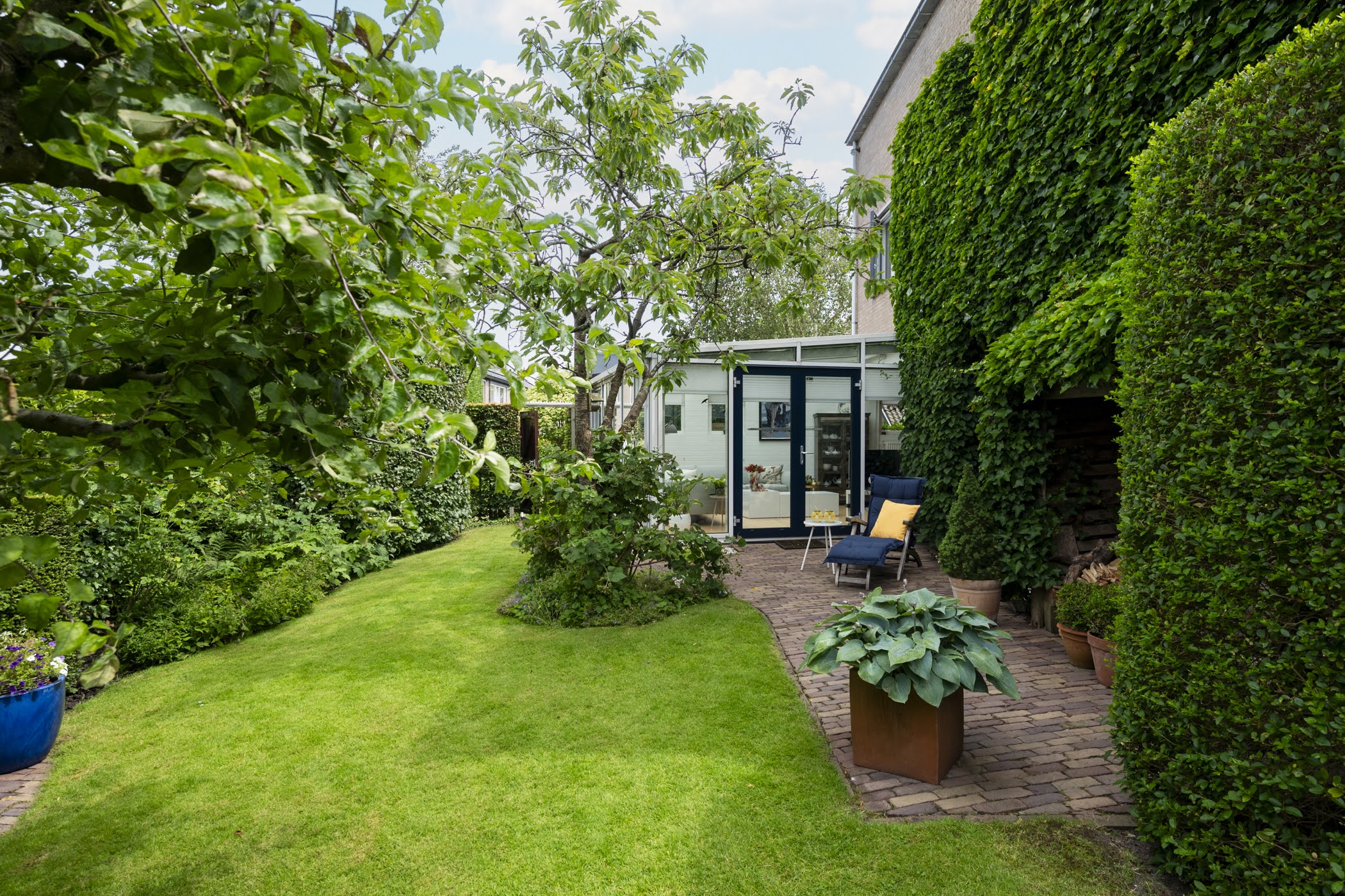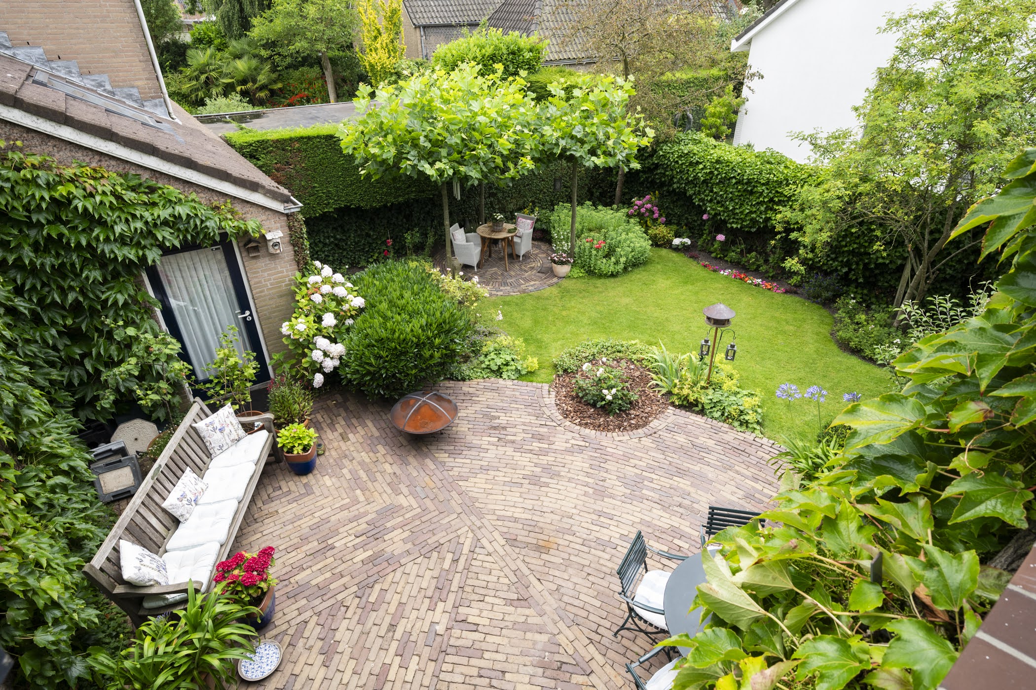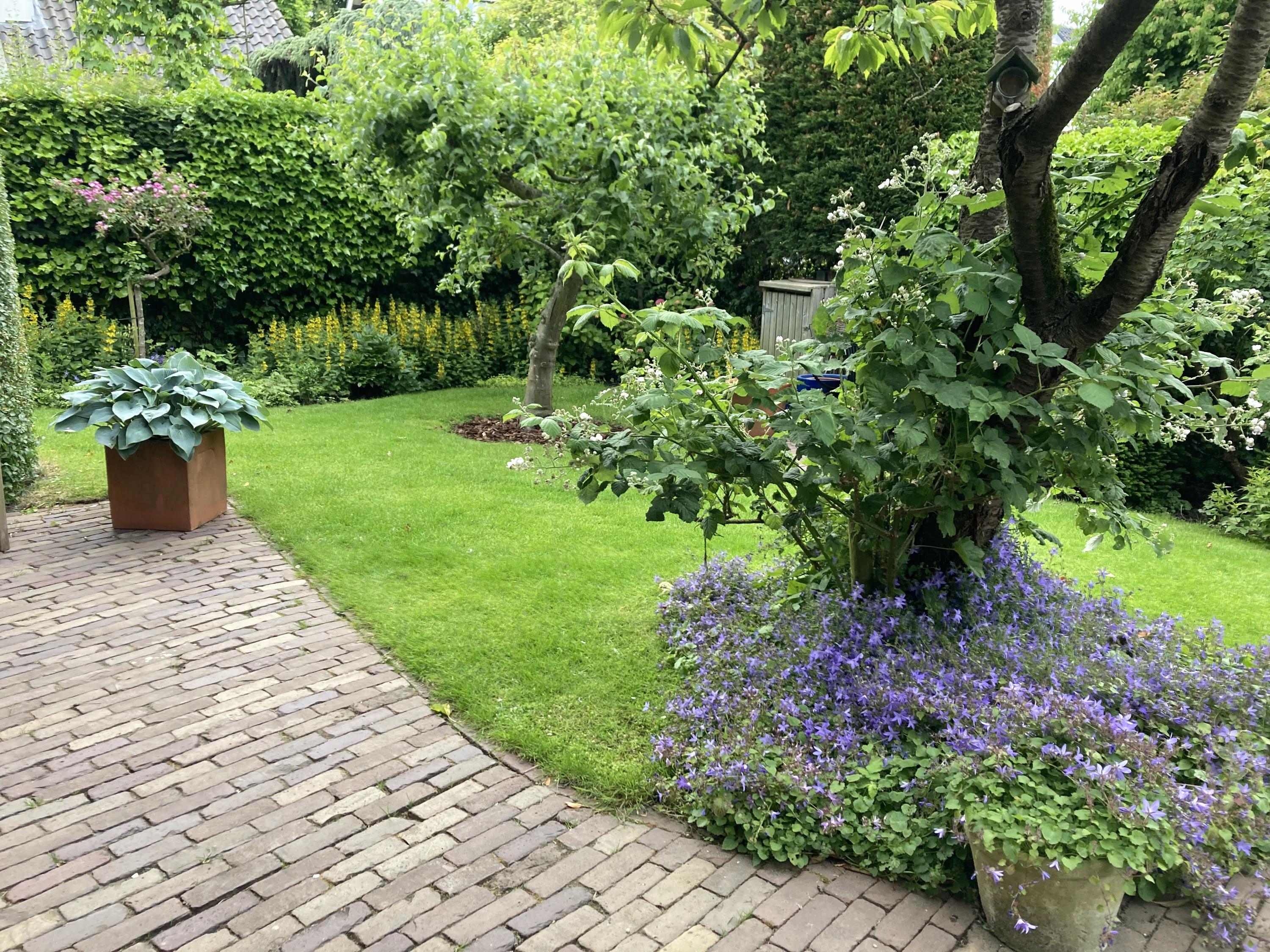 Beautifully landscaped all around, with the largest section facing southwest. Sunny, romantic, and full of flowers. Thanks to the various seating areas, there’s always a perfect spot to relax.