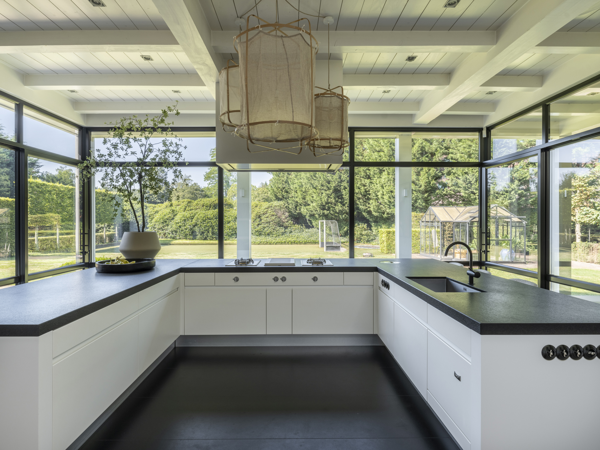 From the classic entrance, you can access the practical mudroom with a side entrance and the living and dining room. This bright and open living space connects two side wings and features beautiful light and a lovely view of the entire garden. Activity and warmth are centered around the kitchen (with an adjacent spacious and practical utility room) and the covered terrace. At the front, adjacent to the living area, you will find a separate TV/work room overlooking the courtyard.