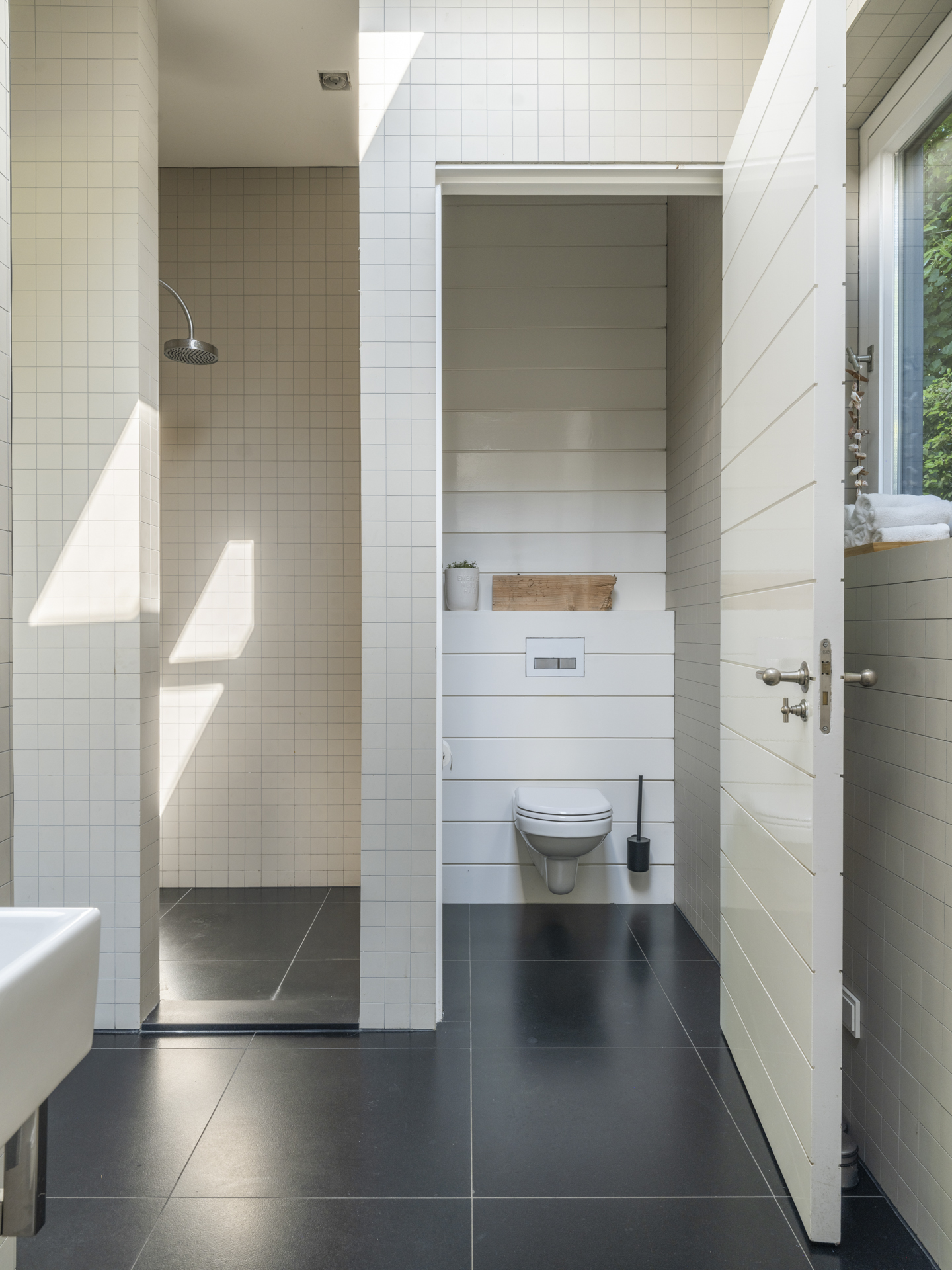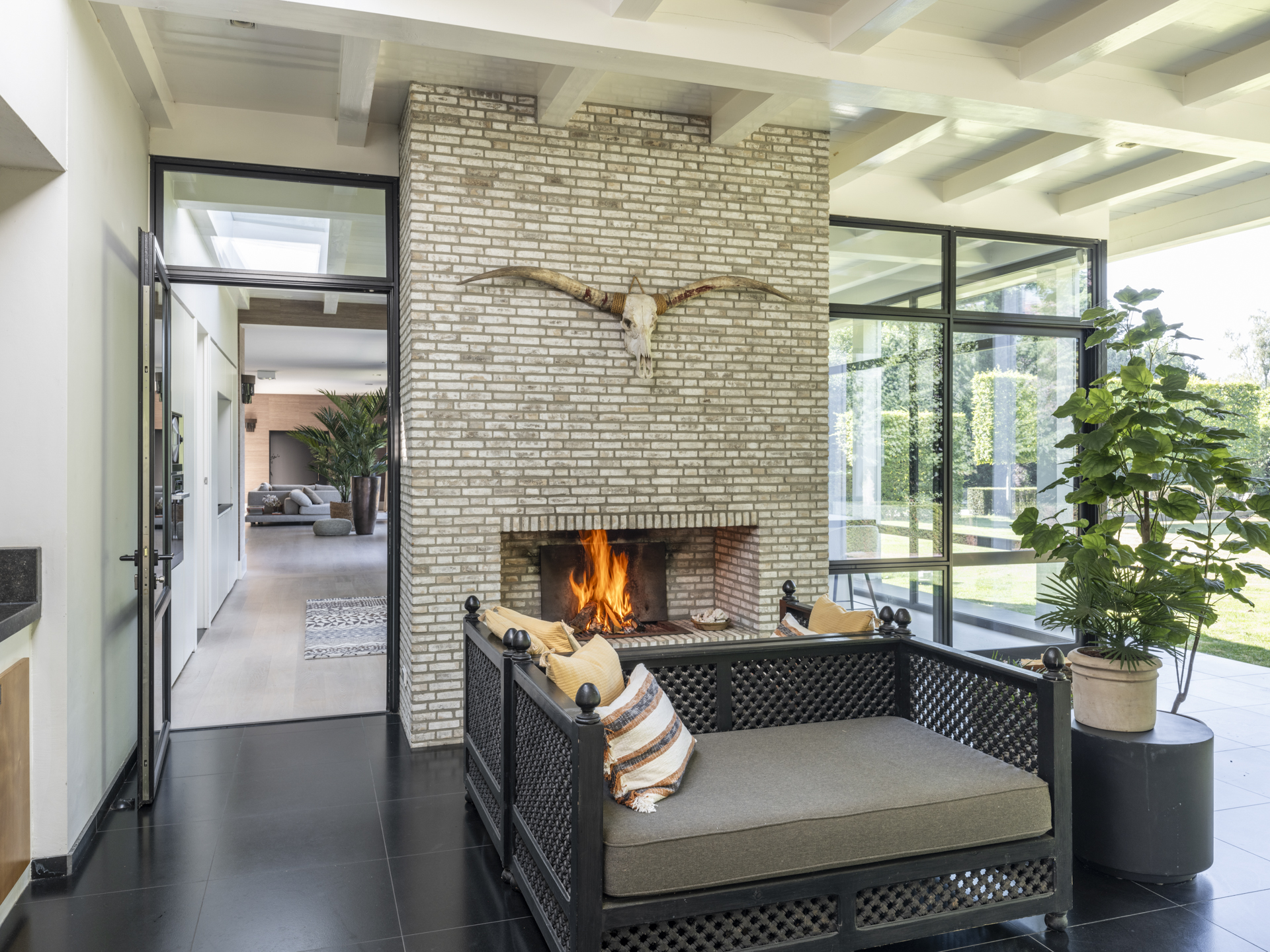 Adjacent to the kitchen is the generous, fully covered terrace, the veranda. This veranda, like the kitchen, is equipped with screens and is effectively an extension of the living area, featuring a cozy open fireplace. Next to the veranda is the (outdoor) bathroom with a toilet and shower.