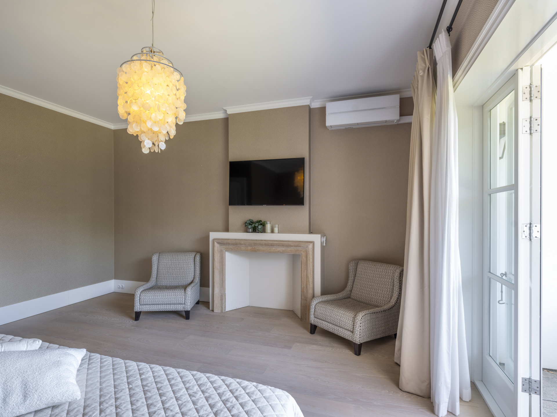The dressing room features beautiful (custom-made) furniture with ample hanging and storage space. The bathroom is very spacious and equipped with a luxurious double bathtub, a large walk-in shower, a toilet, and a bidet.