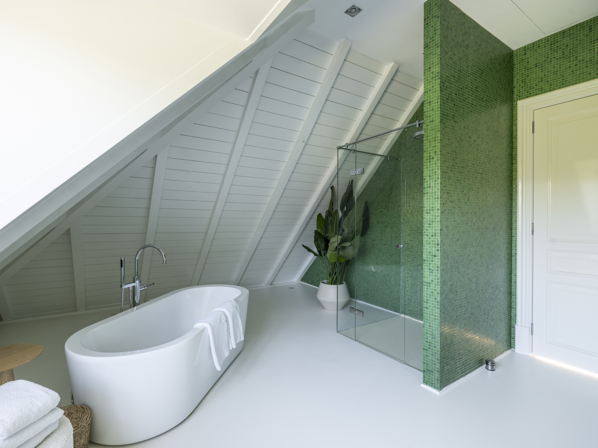 Via a wide staircase and spacious landing, you can reach the master bedroom (with balcony and view of the garden). The adjacent dressing room is openly connected to the master bathroom.