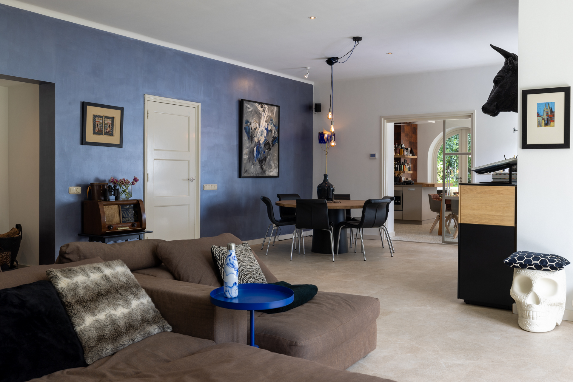Great spacious kitchen (approx. 9.15 x 5.30 m, 2021), custom made by Antonissen interior construction and equipped with all desirable appliances such as a built-in coffee machine, combi oven, convection oven, 6-burner gas appliance (Pitt Cooking), composite counter top and a beautiful steel worktop with sturdy rear wall, extractor hood, double sink, integrated waste bin, Quooker and a large stainless steel refrigerator with separate Liebherr wine climate cabinet. Most built-in appliances are of high quality from the exclusive Gaggenau brand.