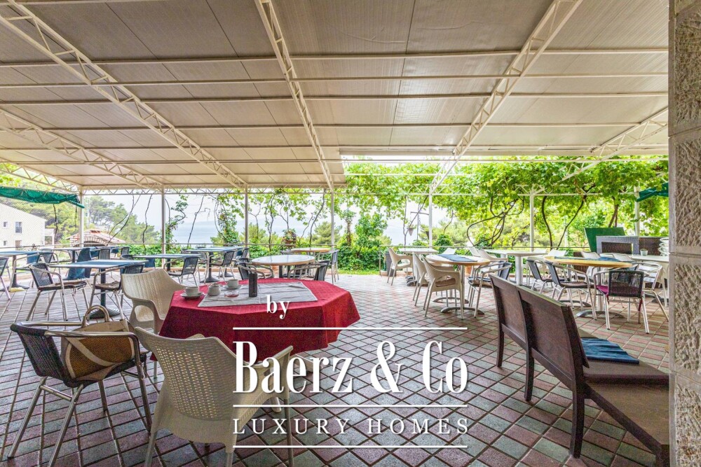 Villa Brela with sea views and restaurant is positioned just 70 metres from the Adriatic shoreline, quietly set in a sought-after locale known for its pristine Mediterranean beaches. Spanning five levels and offering a total living area of 700 m² on a plot of 1,200 m², the villa balances hospitality potential with a refined residential scale. The ground floor hosts a restaurant with a generous terrace, complemented by a pantry and boiler room, giving direct access to outdoor spaces and the ocean air. One floor above, three rooms with their own bathrooms are joined by a self-contained 100 m² apartment, allowing for flexibility of use or privacy for guests.