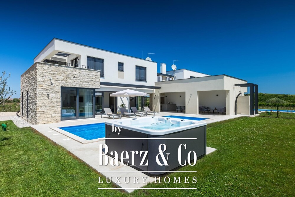 Townhouse Brtonigla stands enveloped by greenery and mature olive groves in the tranquil heart of Istria. This 264 m² contemporary villa is conceived for privacy and flexible living, offering a refined retreat suitable as a private residence or an income-generating investment. Upon entering, a fluid ground floor layout reveals a spacious open living area, a sleek kitchen, and dining room. Practical features including storage and a technical room ensure an ease of daily life, while a bedroom with en suite bathroom enjoys direct access to the pool. The guest toilet with laundry space supports functionality.