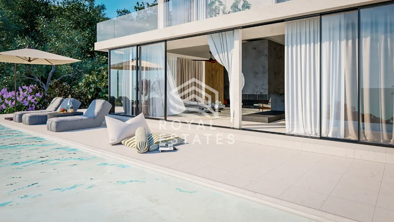 The main living area opens to the light, blending interior and exterior through floor-to-ceiling bi-fold doors and an inviting terrace. The lounge includes a fireplace, and the adjacent kitchen offers natural stone worktops and high-end appliances, complemented by handcrafted cabinetry. In the master suite, a private terrace, walk-in wardrobe, and spa-inspired bathroom with a carved stone bathtub create a restorative sanctuary. Additional en-suite bedrooms reveal open views through glass doors that connect seamlessly to the natural surroundings.