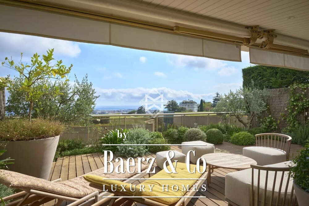 Apartment Cannes offers a setting where Mediterranean light and panoramic sea vistas set an elegant tone. This renovated residence, located in the sought-after California district, occupies 81 m² and features a south-facing aspect that captures sweeping views over the Bay of Cannes, the Lérins Islands, and the Estérel hills. The apartment’s layout flows from an inviting entrance to a luminous living space that integrates a fully equipped open kitchen. Floor-to-ceiling glass opens onto a 57 m² furnished terrace designed for quiet contemplation or convivial gatherings above the city’s coastline.