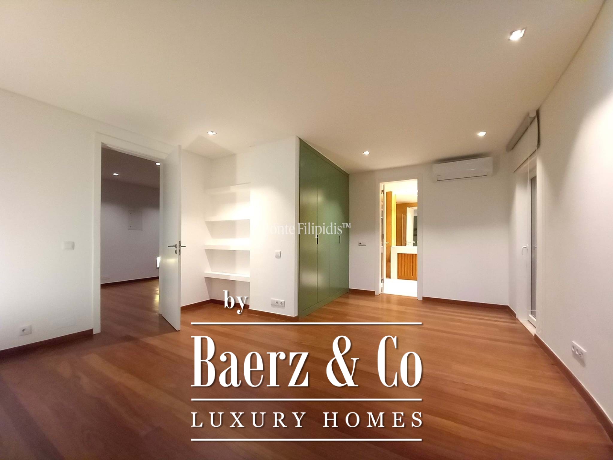 The upper floor holds three en-suite bedrooms, including a 36.25 m² primary suite. Each room is fitted with built-in wardrobes and private bathrooms, composing spaces where calm and discretion set the tone.