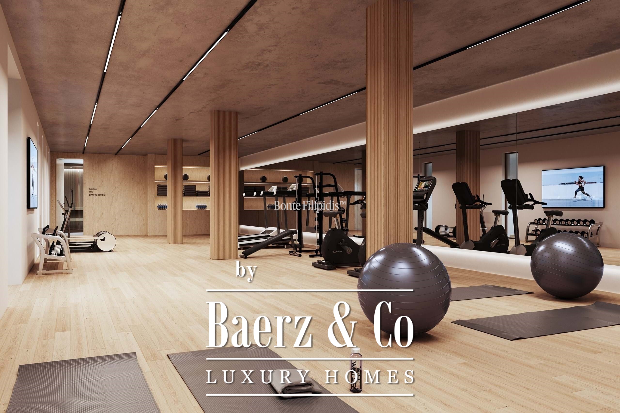 The interior space flows seamlessly outdoors, creating lounge and dining possibilities on terraces set against a backdrop of well-tended greenery. Electric vehicle pre-installation, solar panels for water heating, and three interior parking spaces reflect priorities of efficiency and future readiness. Amenities include a concierge, gym, spa, sauna, and advanced security, all within a gated community.