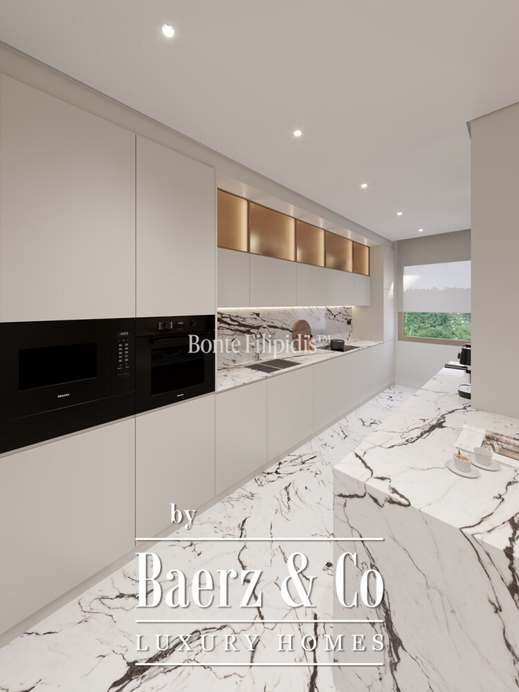 Inside, the apartment unfolds with a clarity of spatial arrangement, dividing social and private zones. The generous living and dining area is bathed in natural light, opening to the balcony for an uninterrupted connection to the cityscape. Marble and bespoke cabinetry define the fully equipped kitchen, lending sophistication to daily rituals.
