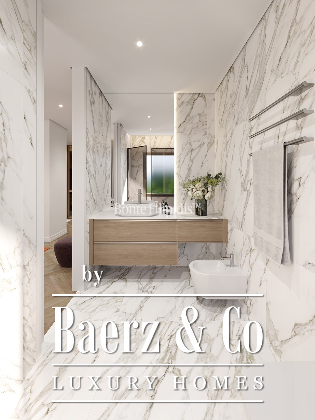 The private quarters comprise two bedrooms, including a suite with a walk-in closet. Three marble-clad bathrooms underscore the focus on comfort and refined materials. Custom carpentry, herringbone wood flooring, and integrated lighting quietly signal craft and distinction throughout.