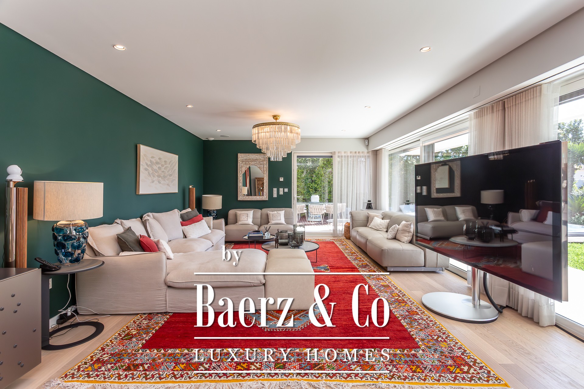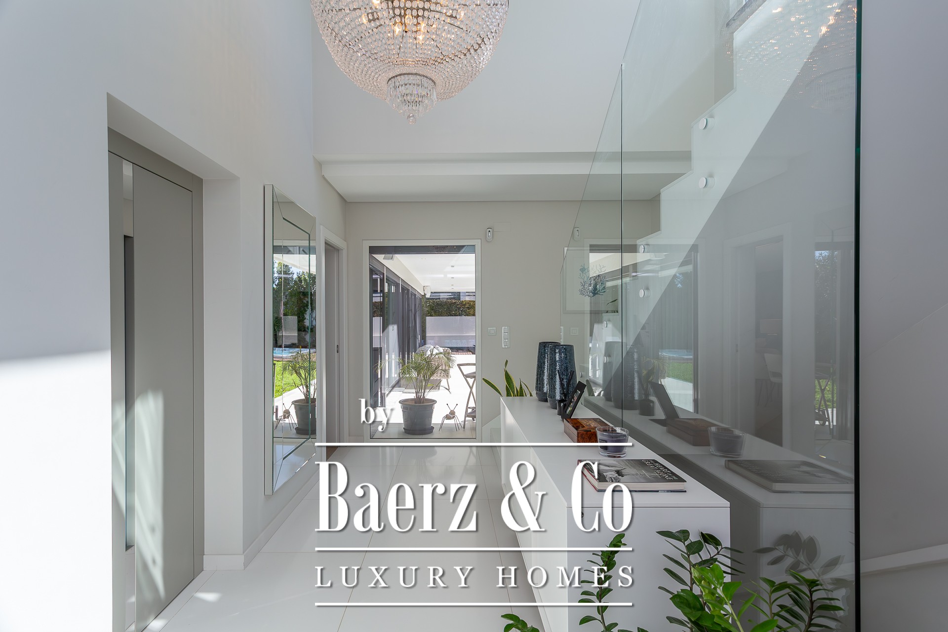 Ascending the white marble staircase or taking the elevator, the first floor presents three generous suites, each opening onto a broad veranda and terrace above the garden. The master suite features a walk-in closet and a double jacuzzi bath, inviting quiet rituals at sunset. The basement enhances the house’s versatility, with a private cinema, a gym, a guest room currently arranged as a playroom, ample storage, laundry, and independent staff quarters.