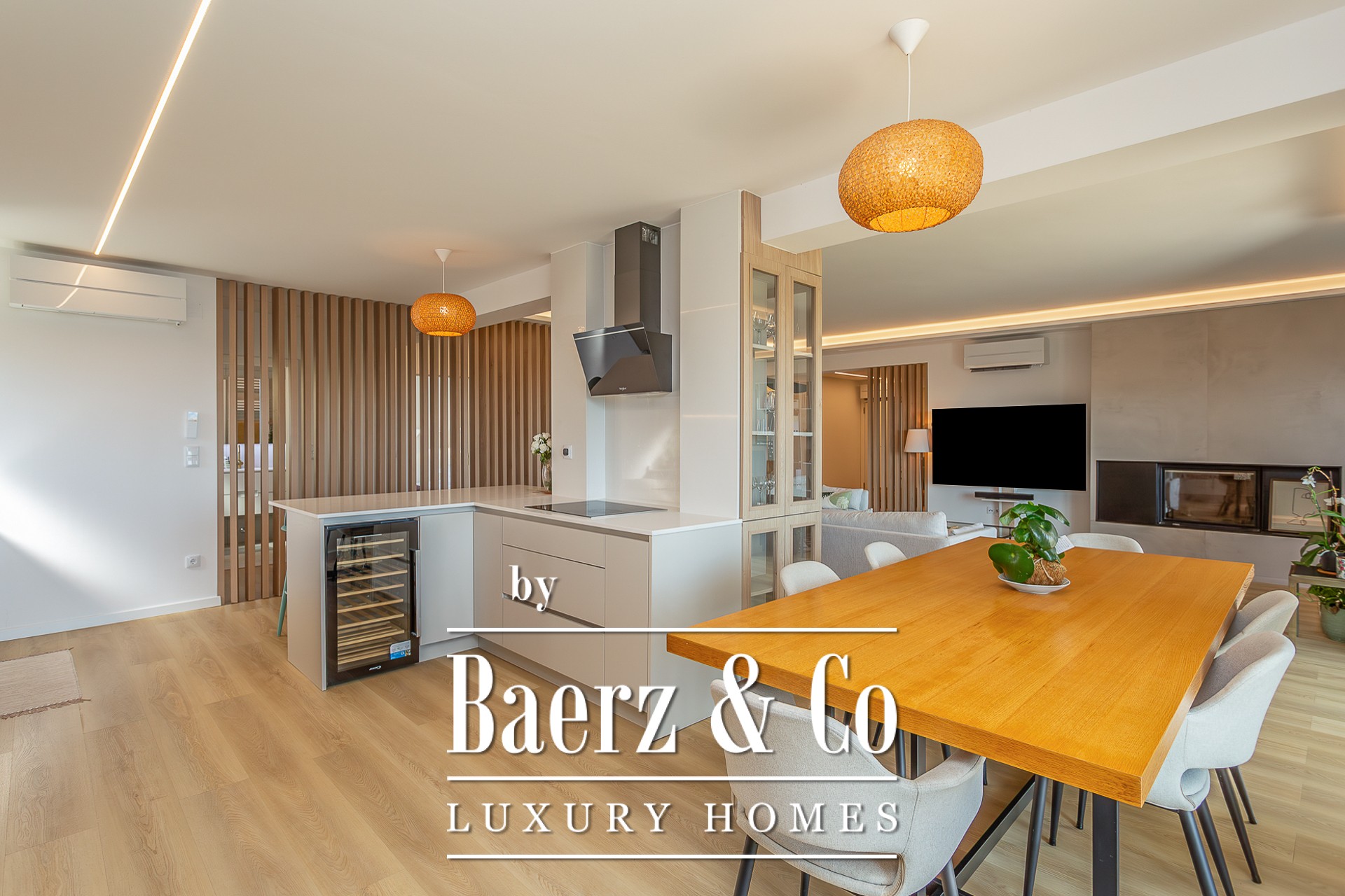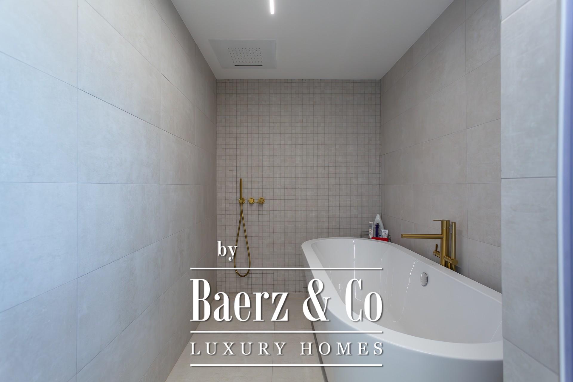 On entering from the lift, a private hall sets a discreet tone, opening to generous circulation areas that guide you to five bedrooms, three en-suite, and a refined guest bathroom. The master suite is composed with intention, featuring a fireplace, an 8m² walk-in closet, an 11m² bathroom, and a private south-facing balcony. The penthouse’s social heart claims nearly half the interior, arranged as an open-plan sequence where living and dining areas blend with a sophisticated kitchen, all oriented toward mesmerizing sea views.