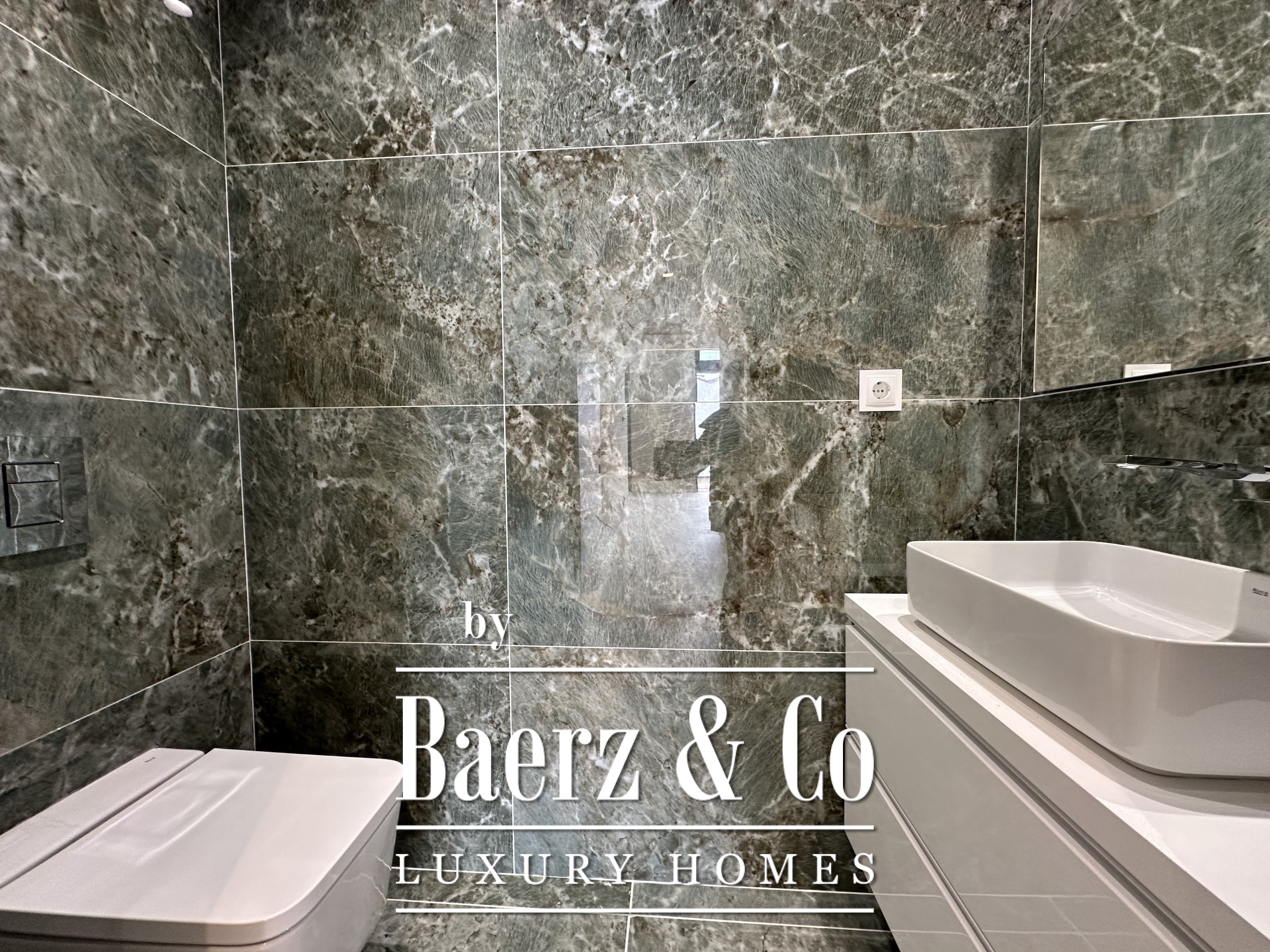 The architectural flow leads to an impressive 106 m² rooftop terrace, inviting quiet outdoor leisure, complemented by a technical area of 27 m². A private pool, set against 124 m² of terrace, is surrounded by lush gardens and fruit trees, designed for serene living. State-of-the-art smart home and garden solutions provide seamless control and efficiency, underscoring the villa’s forward-thinking spirit. Features such as a 72 m² private garage, 8 m² laundry, and air conditioning heighten daily comfort, while an energy class A rating reflects a commitment to sustainability.