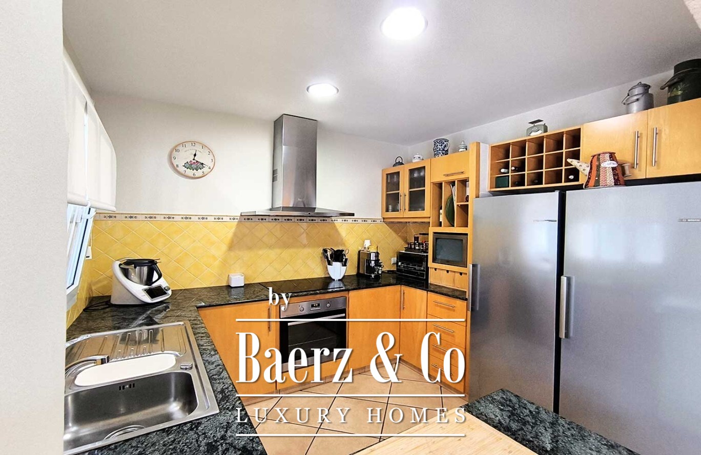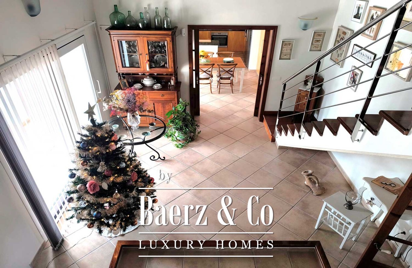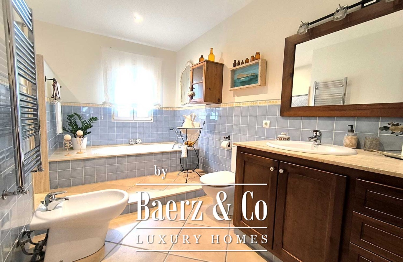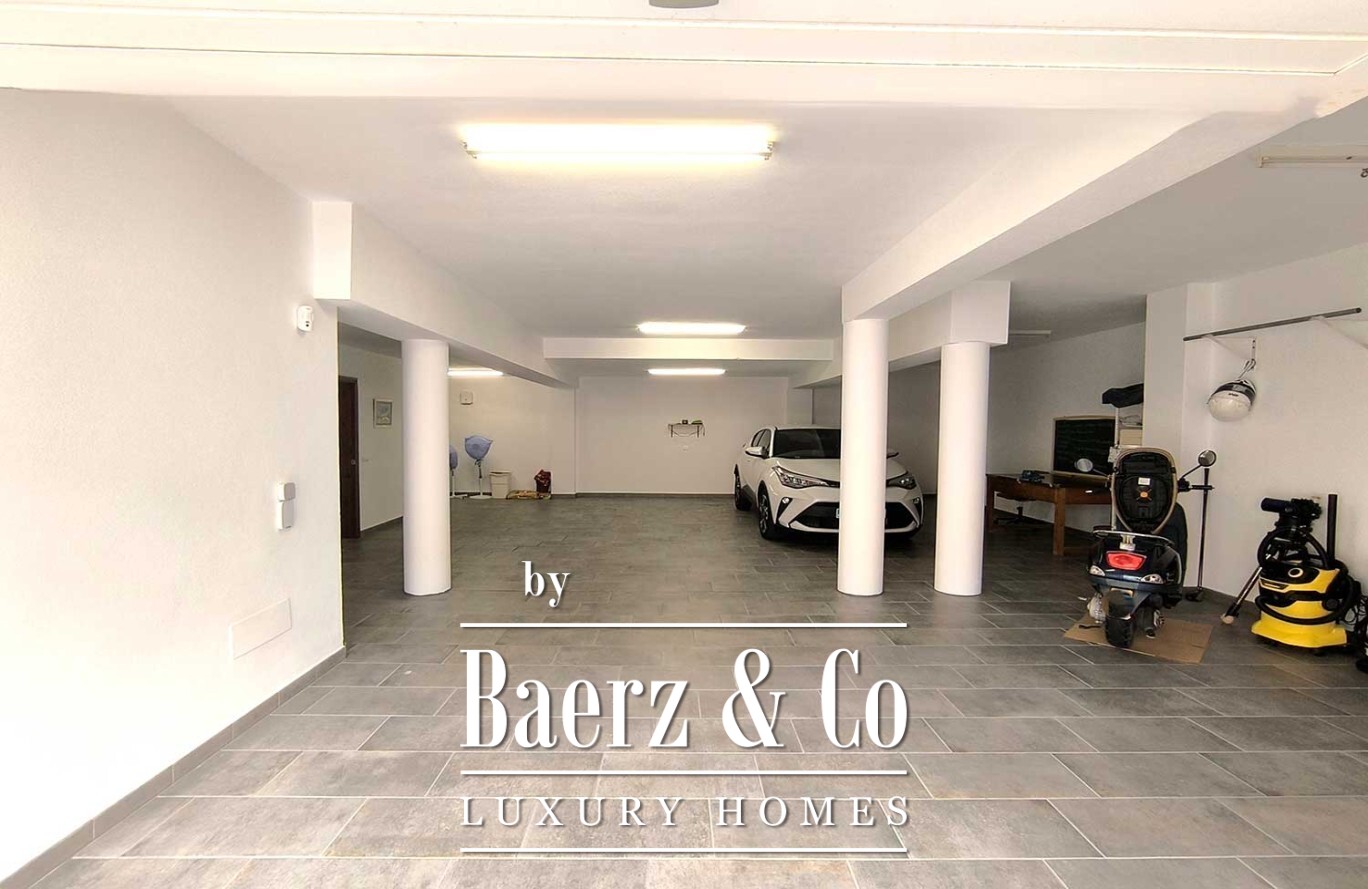 The villa’s basement extends beneath the footprint of the house, offering an exceptional garage area with capacity for multiple vehicles. Comprehensive climate control, including underfloor heating on the ground floor, central heating above, air conditioning, solar panels, and a centralized vacuum system, reflects a commitment to comfort and sustainability.