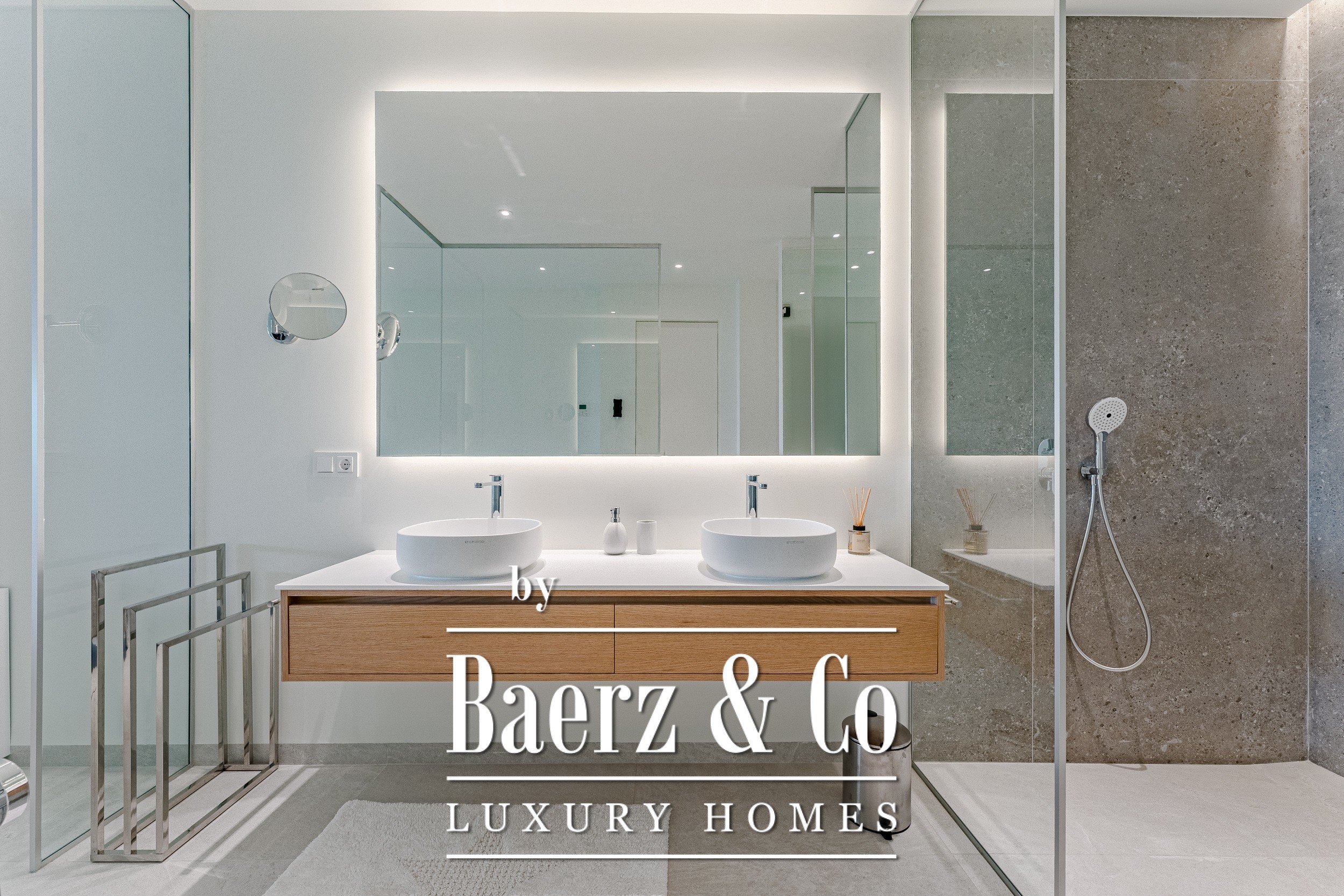 The home orients itself toward the ocean, framing each hour of sunlight and the shifting hues of the landscape. Three thoughtfully arranged levels include a private lift, generous dressing rooms, and a multi-purpose room for flexible living. Terraces flow outward, leading to an infinity heated swimming pool that forms the centrepiece of the exterior experience.