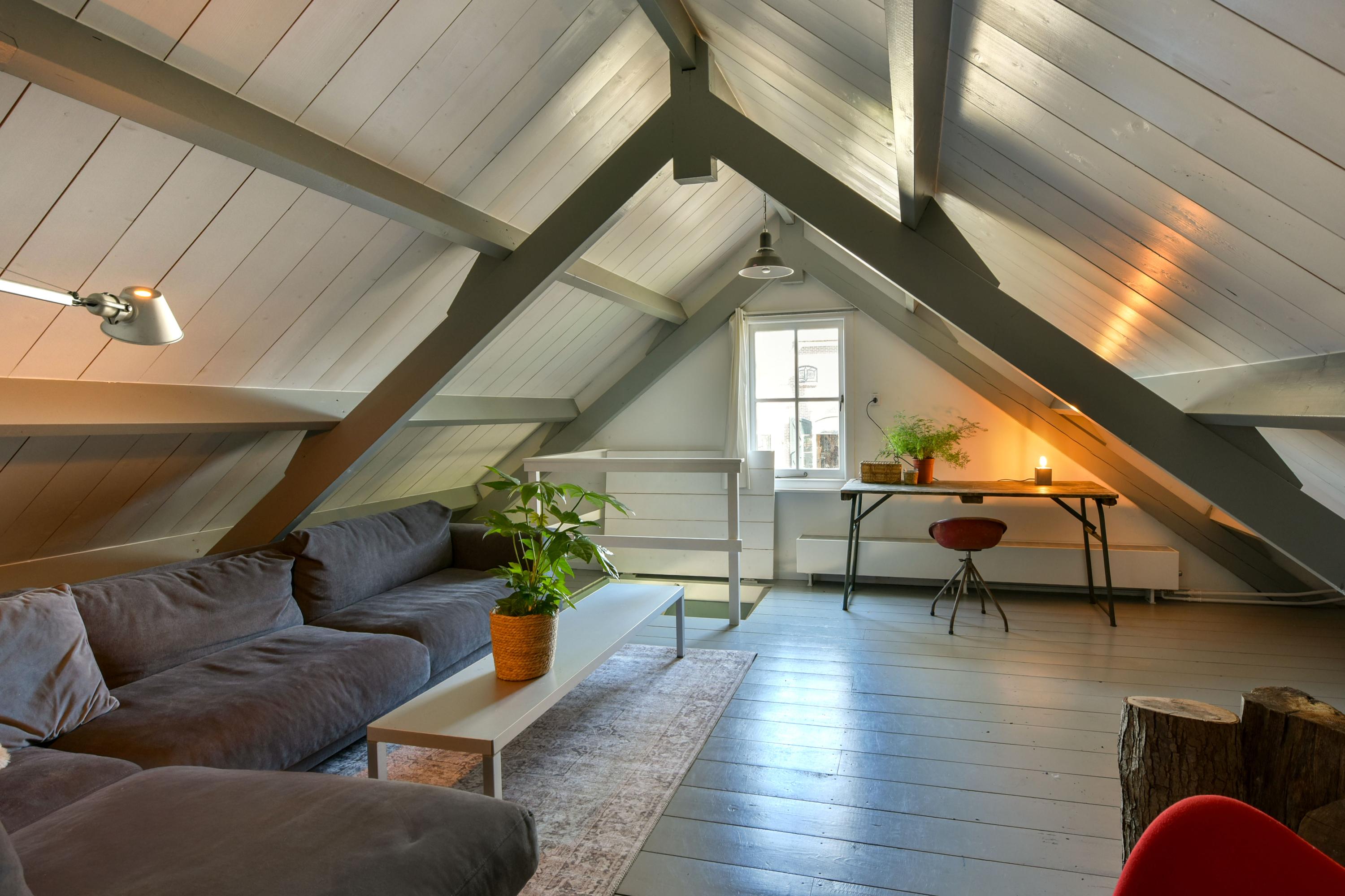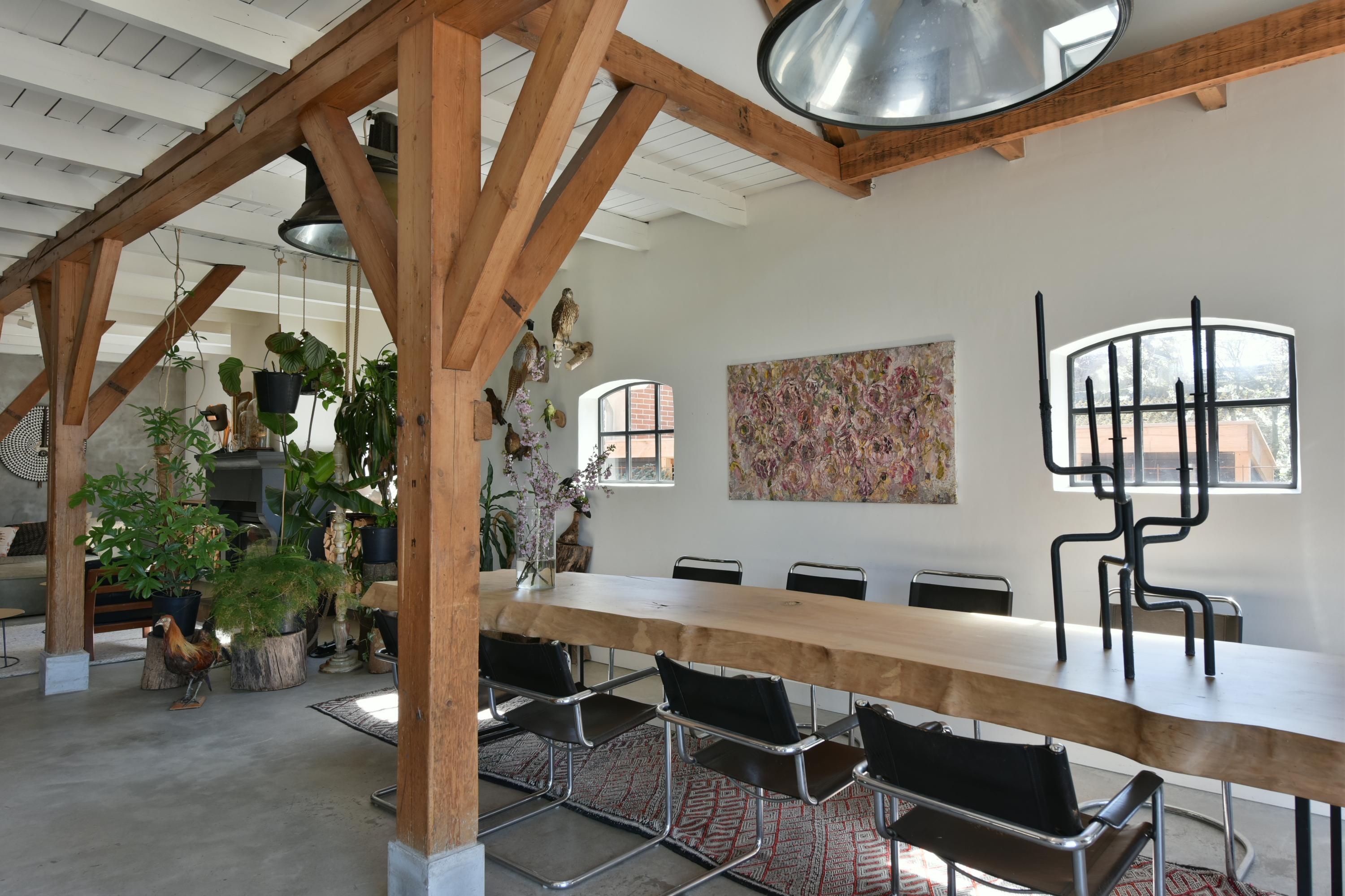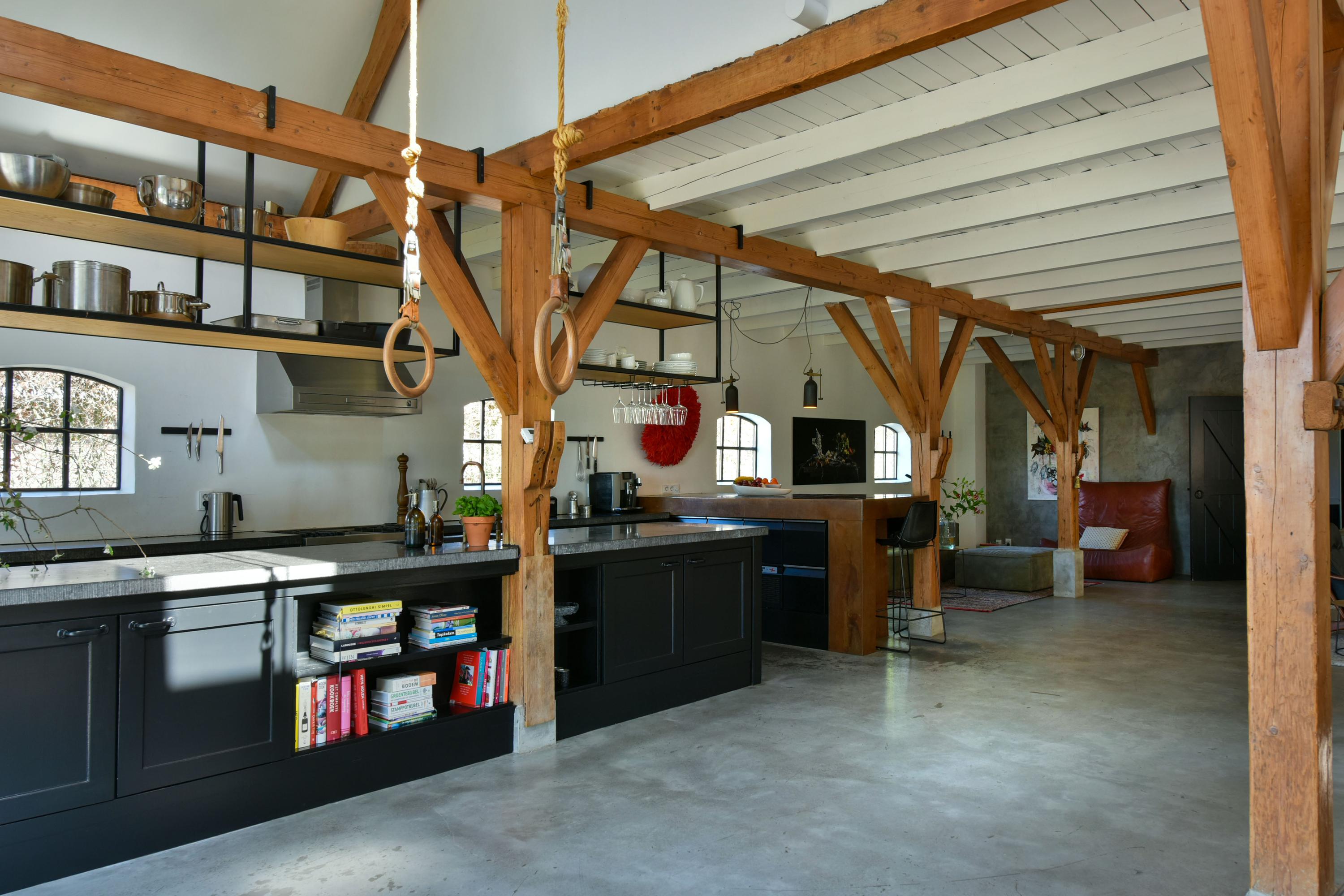 To the right, the former stable has been transformed into an impressive living room and kitchen. Original stable windows and charming wooden shutters to the former hayloft pay homage to the home's agricultural past. The concrete floor has underfloor heating, and sturdy gymnastic rings hang from the ceiling – a playful invitation to let your inner child roam free. Picture yourself swinging through the space with sunlight pouring in through tall windows – whether it’s your children playing or you taking a break from gravity, these unique details add real personality.